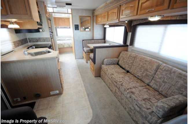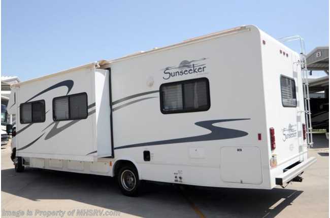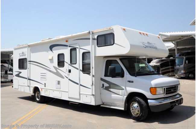 /TX 10/18/2013 Used Forest River RV for Sale- 2005 Forest River Sunseeker (3100) with slide and 53,894 miles. This RV is approximately 31 feet in length with a 6.8L Ford engine, Ford 450 chassis, power mirrors and locks, 4KW Onan generator, patio awning, pass-thru storage, 5K lb hitch, cruise control, tilt steering wheel, in-dash CD player, dual safety airbags, water heater, wheel simulators, exterior shower, roof ladder, LCD TV with CD/DVD player, sofa with Jack Knife sleeper, booth converts to sleeper, night shades, microwave, 3 burner range with gas oven, refrigerator, glass door shower cab over bunk, roof A/C and much more. For additional information and photos please visit Motor Home Specialist at www.MHSRV .com or call 800-335-6054.