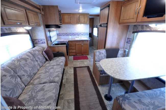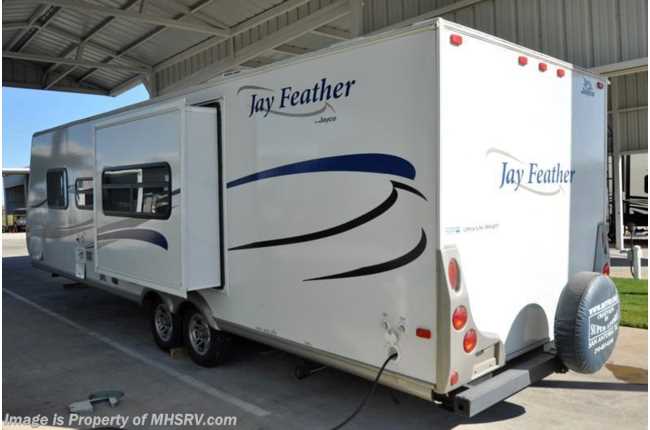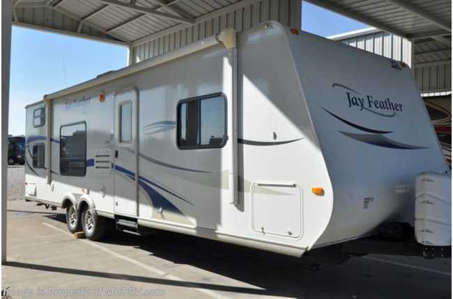 /TX 10/24/14 Used 2009 Jayco Jayfeather 28R is approximately 28 feet in length with a slide and power patio awning, gas/electric water heater, pass-thru storage, aluminum wheels, exterior grill, exterior shower, exterior speakers, sofa with sleeper, night shades, booth converts to sleeper, microwave, 3 burner range with oven, refrigerator, 2 LCD TVs and much more.
