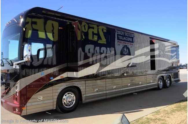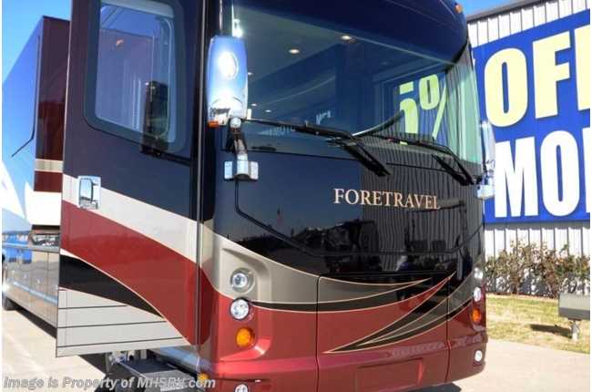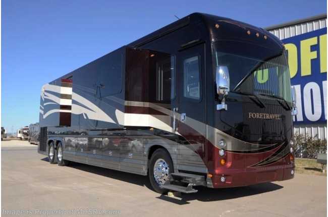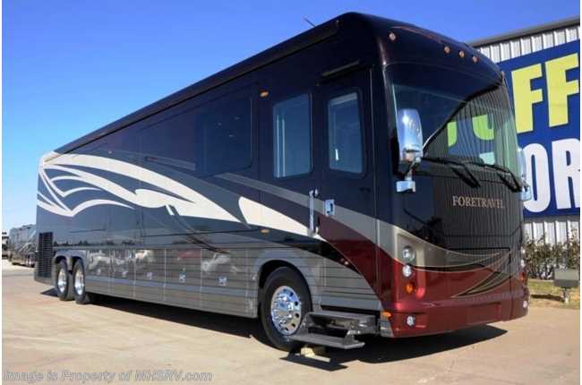 /LA 6/9/2014 2014 CLOSEOUT! Receive a $1,000 VISA Gift Card with purchase from Motor Home Specialist while supplies last! Visit MHSRV .com or Call 800-335-6054 for complete details. The Legendary Luxury Foretravel Motor Coach is now available at Motor Home Specialist, The #1 Volume Selling Dealer in the World with 1 Location. If you are shopping Newmar Essex, King Aire, American Heritage or any other high-end motor home on the market today, the Foretravel is the must see, must drive, true luxury motor COACH to experience before making your final decision. When spending comparable money why settle for the cookie-cutter interiors, exteriors, chassis, slide-outs and amenities the other brands offer, when you can enjoy a bus conversion caliber coach for the same or even less money? Each Foretravel is completely custom designed both inside and out to give every coach and every coach owner the individual taste and distinguished style they deserve when purchasing this level of vehicle. The ride and drive of the Foretravel is also unequalled by anything in the high-end motor home market. The TravelRide Chassis from Foretravel is not the typical converted Spartan chassis. It is a true custom built, semi-monocque chassis that emulates the construction of an airplane by distributing vibration through the subfloor, floor, walls and roof for the absolute ultimate in harmonics dampening and quietness of ride. The Foretravel also utilizes steel construction in the subfloor, floor, walls and cockpit unlike the aluminum construction you will find in other products. The function and design of the Foretravel's slide-out rooms are also superior to what is commonly found in the high-end motor home market. Foretravel slide-out rooms utilize pneumatic seals for the premium in fit, finish and function. Just a few additional features found in the Foretravel IH-45 that set it apart from the competition include a 20,000 kw generator, air disc brakes on all wheels, a 20,000 lb. hitch, Knoedler air ride pilot seat, residential co-pilot seat, (4) roof A/C units, Hydronic heating system and a Silverleaf digital glass dash. This particular Foretravel is a NEW 2014 IH-45 (Iron Horse - 45 ft) Bath & 1/2 model with an M.S.R.P. of $1,269,350. It measures approximately 45 ft. in length and is powered by the ISX15 600 HP Cummins diesel engine and an Allison 4000MHR transmission with transmission retarder. Optional features include flat floor slide-out room, fold down front TV lift, patio entertainment center in slide-out room, stacked washer/dryer, Slumber Ease mattress system and TV living room lift cabinet. You will also enjoy a premier 2YR/24K MILE LIMITED WARRANTY from Foretravel. For more details, a standard equipment list, additional photos and coach video please visit MHSRV .com or call Motor Home Specialist at 800-335-6054. WHY PAY MORE? WHY SETTLE FOR LESS?
