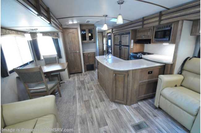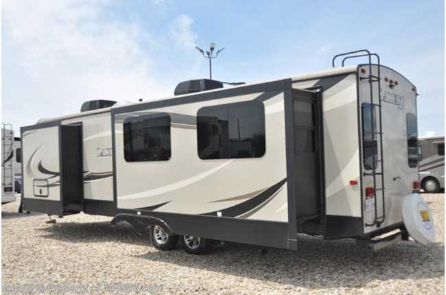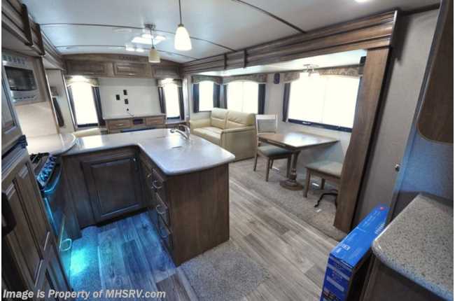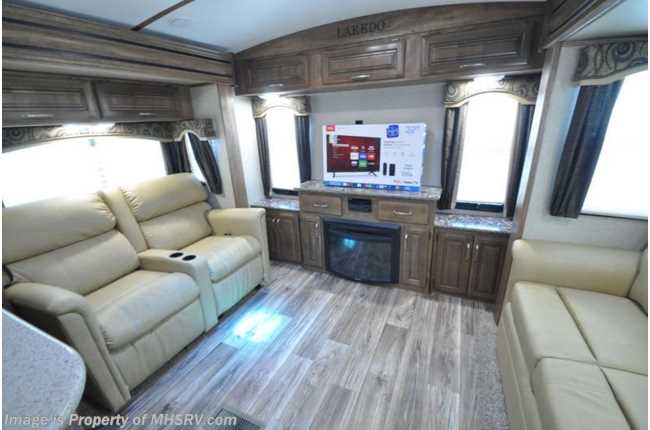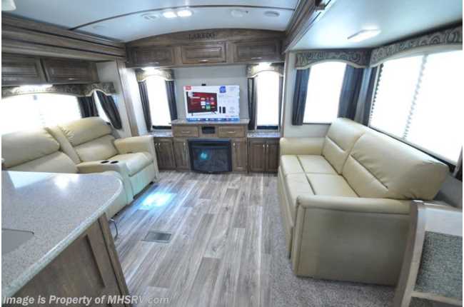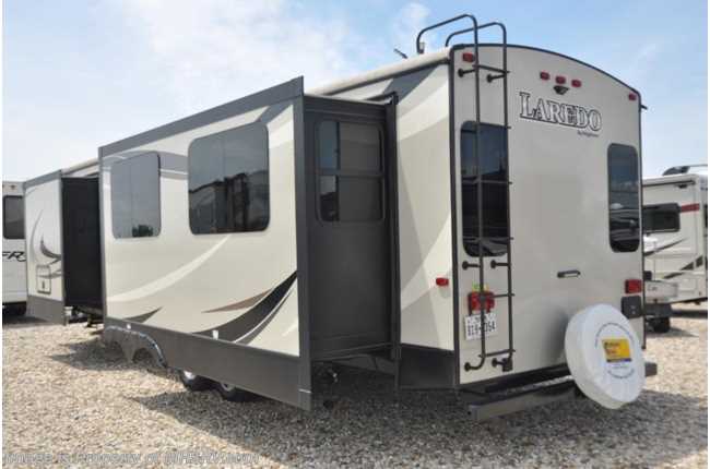 /TX 10-17-17 Used Keystone RV for Sale- 2017 Keystone Laredo 334RE with 3 slides. This RV is approximately 34 feet 5 inches in length and features a power patio awning, electric & gas water heater, pass-thru storage, aluminum wheels, exterior shower, middle LED running lights, automatic leveling system, exterior speakers, night shades, fireplace, kitchen island, microwave, 3 burner range with oven, solid surface counter, sink covers, glass door shower with seat, king size bed, 2 flat panel TV's, 2 ducted A/Cs and much more. For additional information and photos please visit Motor Home Specialist at www.MHSRV.com or call 800-335-6054.