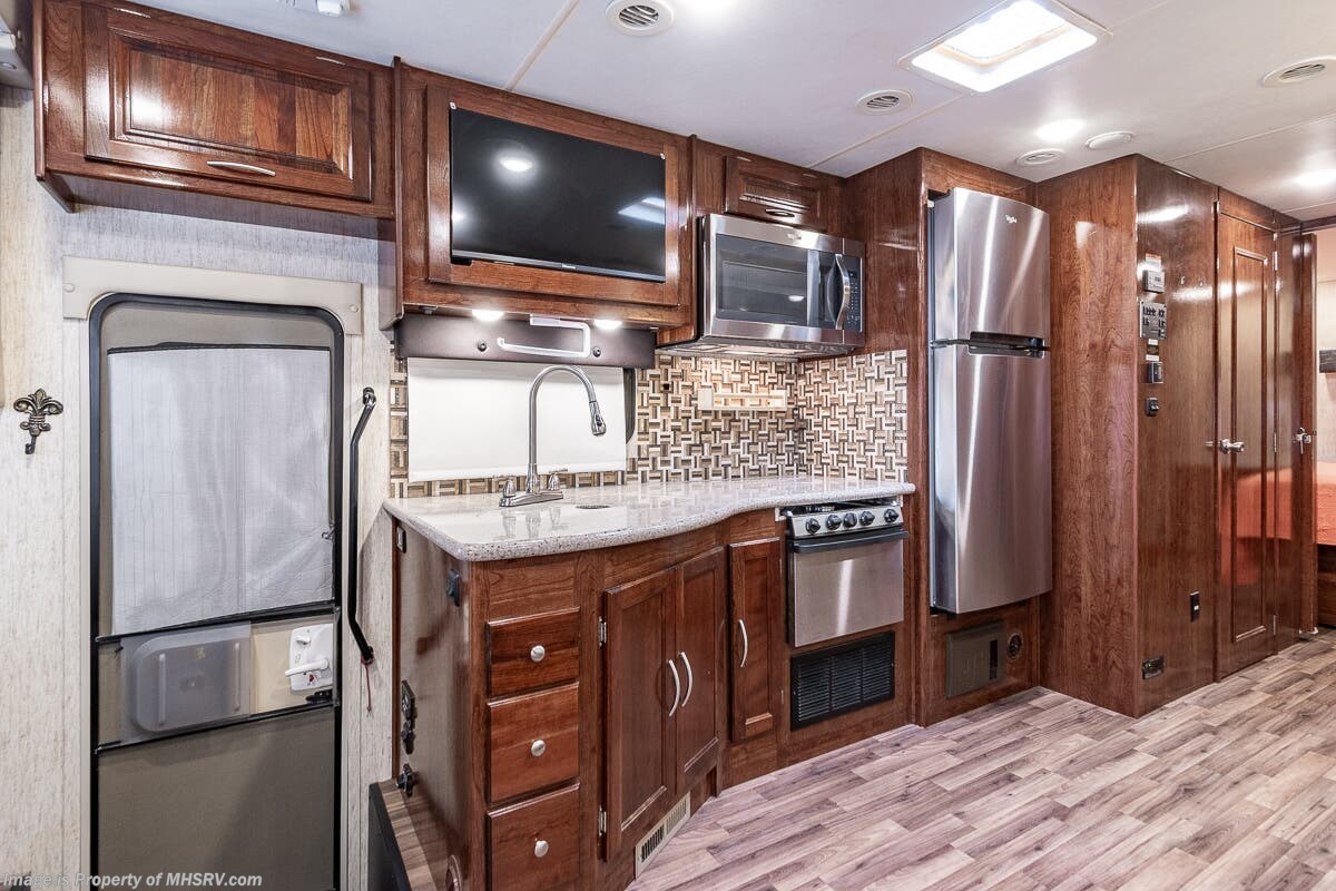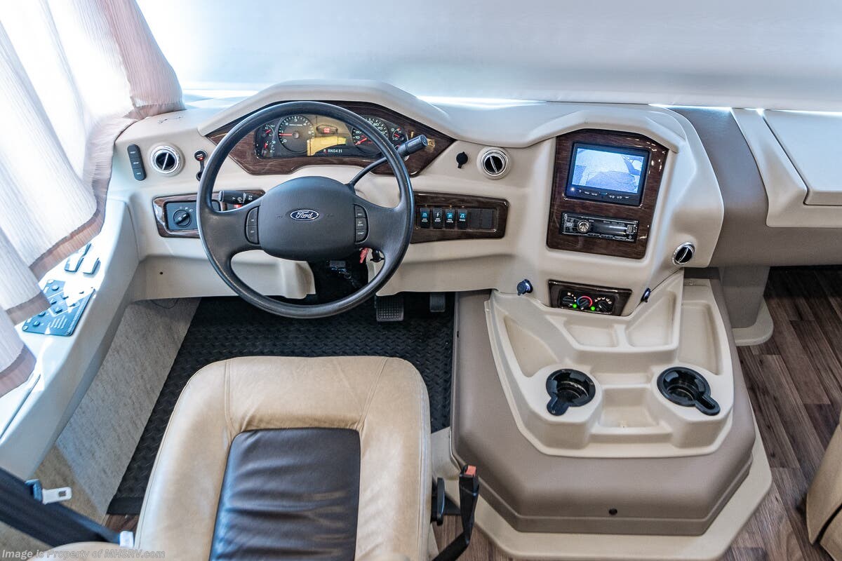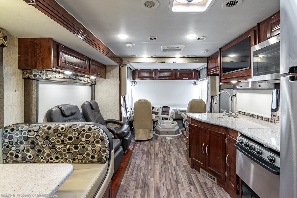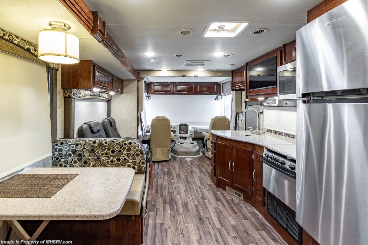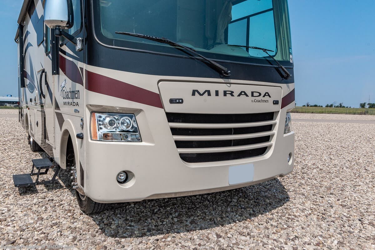 SOLD 9/10/2024 ***Consignment*** Used Coachmen RV for sale – 2018 Coachmen Mirada 31FW is approximately 36’ 10” in length with 2 slides, 16,361 miles and features LCI auto leveling jacks, 3 camera monitoring system, dual A/C’s, Onan 5.5KW gas generator, Ford V10 gas engine, Ford chassis, tilt steering wheel, cruise control, gas/electric water heater, power patio awning, pass-through storage, side swing storage doors, black tank flush, water filtration system, 50 amp power, exterior shower, exterior entertainment, ladder, inverter, seating leather, sleeper booth, kitchen backsplash, solid surface counters, sink covers, 3 burner gas range with oven, living room TV, cab over bunk and much more. For additional information and photos, please visit Motor Home Specialist at www.MHSRV.com or call 800-335-6054.