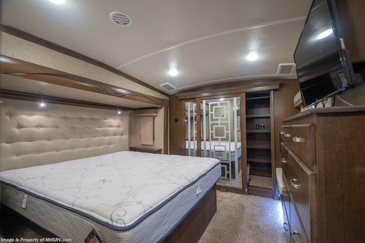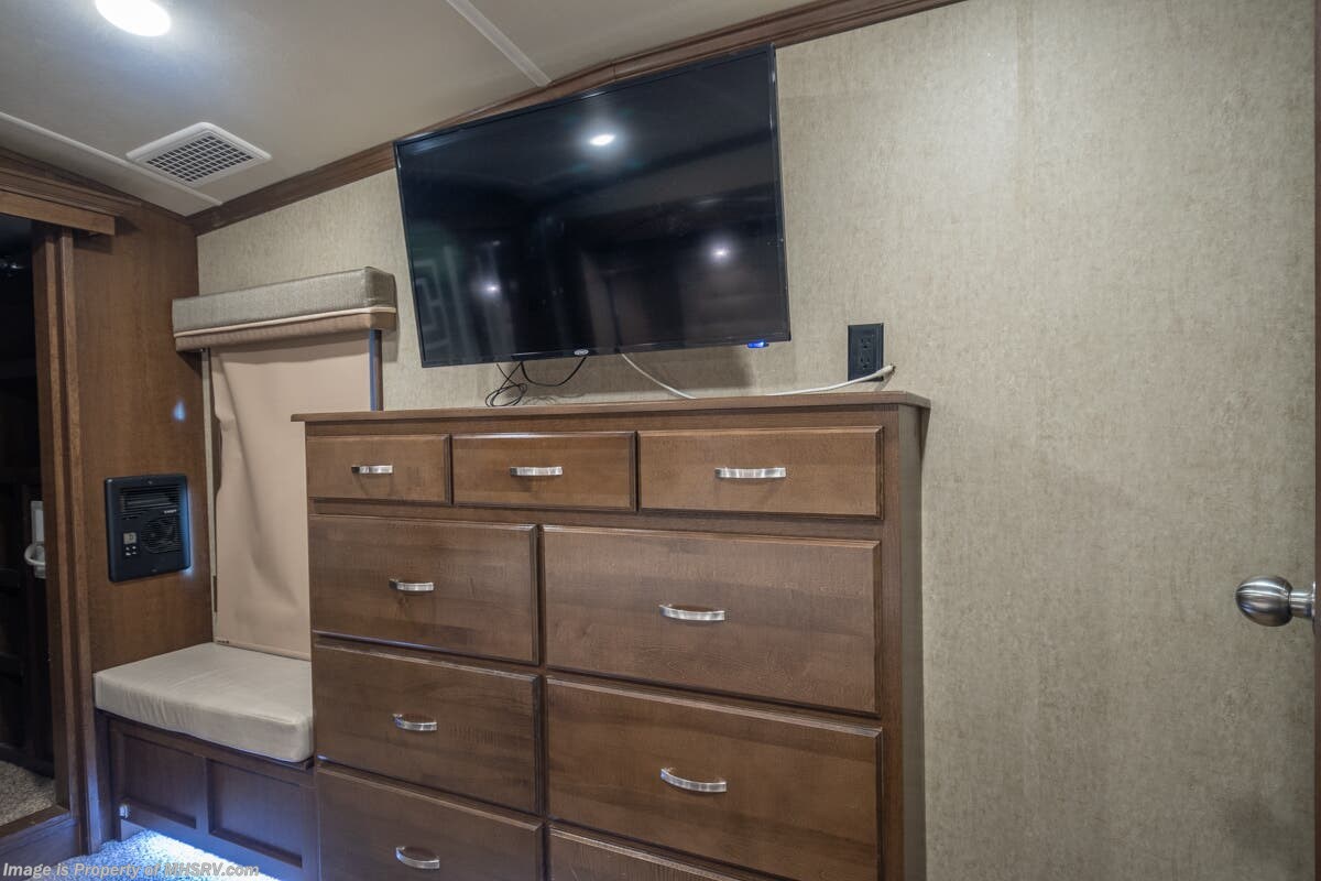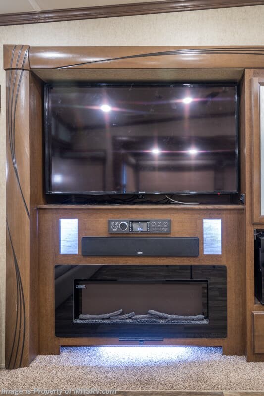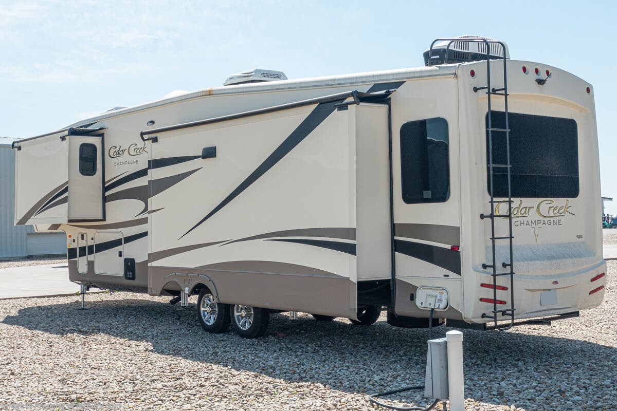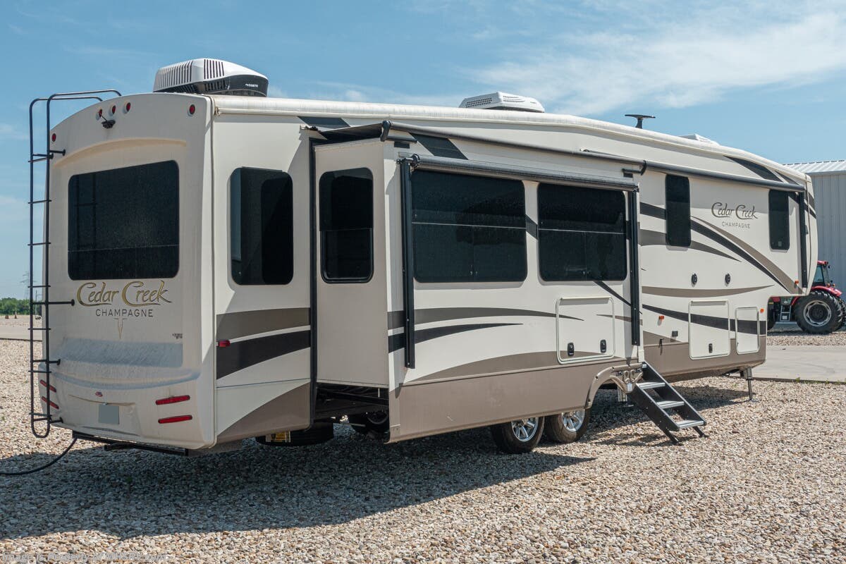5/23/20 Used Forest River RV for Sale- 2018 Forest River Cedar Creek Champagne 38EL with 3 slides. This RV is approximately 41 feet 7 inches in length and features an automatic leveling system, aluminum wheels, 2 ducted A/Cs, keyless entry, water heater, power patio awning, LED running lights, black tank rinsing system, water filtration system, 50 amp power cord reel, inverter, central vacuum, dual pane windows, fireplace, hardwood cabinets, power roof vent, ceiling fan, solar/black-out shades, solid surface kitchen counter with sink cover, dishwasher, convection microwave, 2 burner electric flat top range, residential refrigerator, glass door shower with seat, king size bed, theater seats, 2 flat panel TVs and much more. For additional information and photos please visit Motor Home Specialist at www.MHSRV.com or call 800-335-6054.