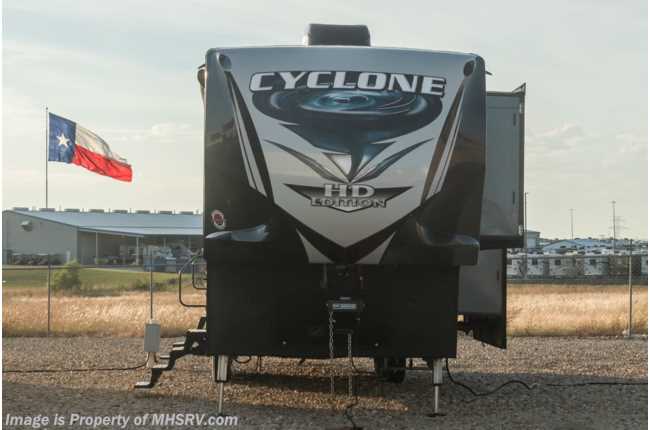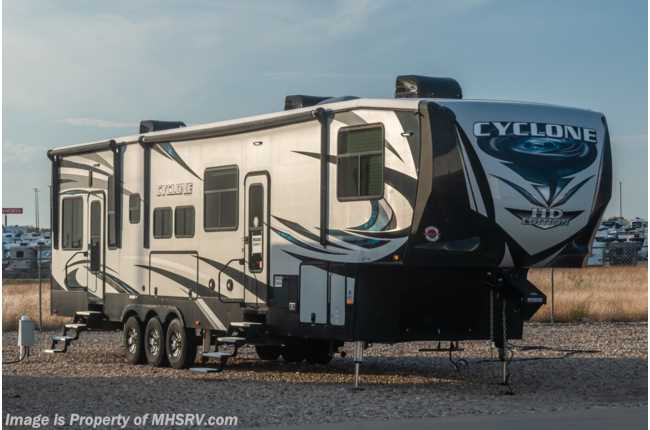 3/4/2024 Used Heartland 5th Wheel for sale – 2018 Heartland Cyclone 4115 is approximately 41 feet in length with 2 slides and features aluminum wheels, LCI auto levelling jacks, three A/Cs, Onan 5.5KW generator, central vacuum, gas/electric water heater, power patio awning, pass through storage bay, LED running lights, 50 amp power, exterior shower, ladder, inverter, 7 foot ceilings, fireplace, sink covers, 3 burner gas range with oven, residential refrigerator with ice maker, convection microwave, bathroom solid surface counters, washer/dryer, king bed, bath & 1/2 and much more. For additional information and photos, please visit Motor Home Specialist at www.MHSRV.com or call 800-335-6054.