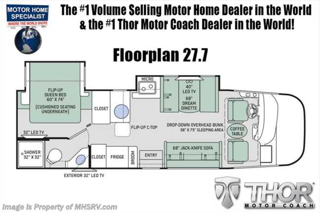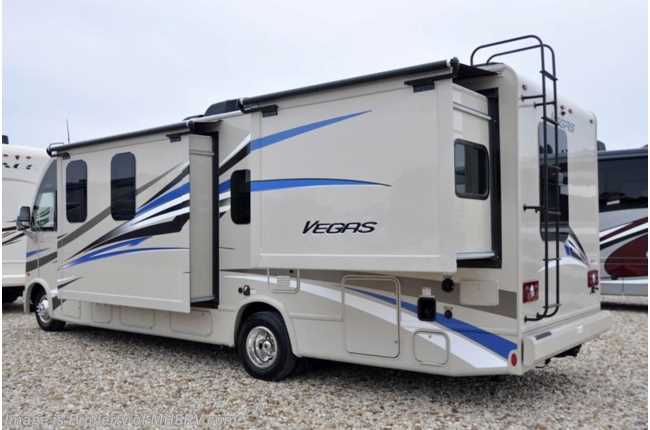 10-31-18 MSRP $121,283. Thor Motor Coach has done it again with the world's first RUV! (Recreational Utility Vehicle) Check out the New 2018 Thor Motor Coach Vegas RUV Model 27.7 with 2 slide-out rooms. The Vegas combines Style, Function, Affordability & Innovation like no other RV available in the industry today! It is powered by a Ford Triton V-10 engine and is approximately 28 feet 6 inches in length. Taking superior drivability even one step further, the Vegas will also feature something normally only found in a high-end luxury diesel pusher motor coach... an Independent Front Suspension system! With a style all its own the Vegas will provide superior handling and fuel economy and appeal to couples & family RVers as well. You will also find another full size power drop down loft above the cockpit, spacious living room and even pass-through exterior storage. Optional equipment includes the HD-Max colored sidewalls and holding tanks with heat pads. New features for 2018 include euro-style cabinet doors with soft close hidden hinges, numerous décor updates, attic fan with vent cover mad standard, 15K BTU A/C, larger galley windows, 2 burner gas cooktop, below counter convection microwave, stainless steel galley sink, bathroom vanity heights raised, LED accent lighting throughout, roller shades, new front cap, armless awning, LED running lights and many more. You will also be pleased to find a host of feature appointments that include tinted and frameless windows, power patio awning with LED lights, living room TV, LED ceiling lights, Onan generator, water heater, power and heated mirrors with integrated side-view cameras, back-up camera, 8,000 lb. trailer hitch, spacious cockpit design with unparalleled visibility as well as a fold out map/laptop table and an additional cab table that can easily be stored when traveling. For more complete details on this unit and our entire inventory including brochures, window sticker, videos, photos, reviews & testimonials as well as additional information about Motor Home Specialist and our manufacturers please visit us at MHSRV.com or call 800-335-6054. At Motor Home Specialist, we DO NOT charge any prep or orientation fees like you will find at other dealerships. All sale prices include a 200-point inspection, interior & exterior wash, detail service and a fully automated high-pressure rain booth test and coach wash that is a standout service unlike that of any other in the industry. You will also receive a thorough coach orientation with an MHSRV technician, an RV Starter's kit, a night stay in our delivery park featuring landscaped and covered pads with full hook-ups and much more! Read Thousands upon Thousands of 5-Star Reviews at MHSRV.com and See What They Had to Say About Their Experience at Motor Home Specialist. WHY PAY MORE?... WHY SETTLE FOR LESS?