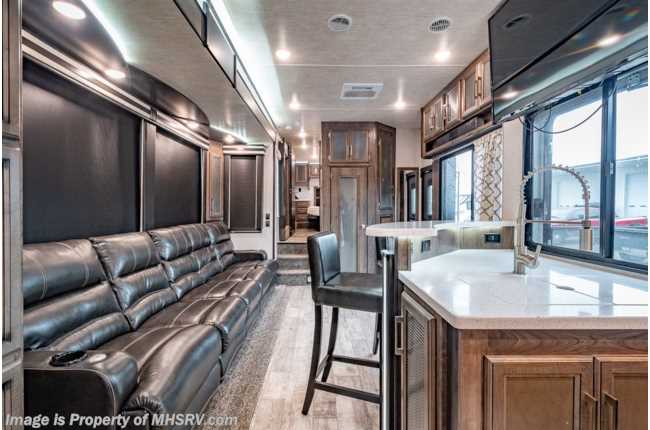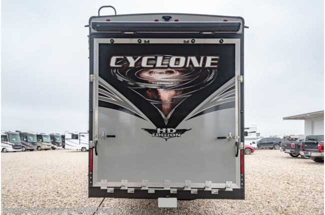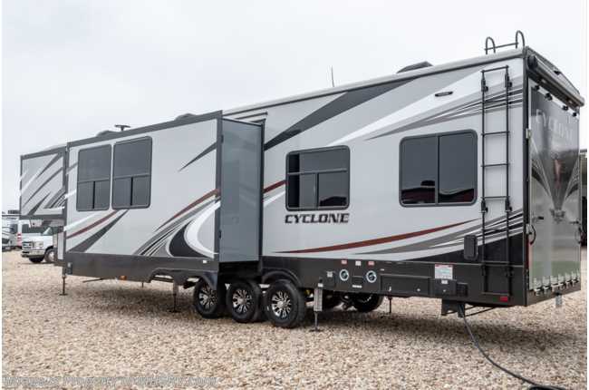 3-25-19 Used Heartland RV for Sale- 2019 Heartland Cyclone 4270 Bath & ½ Bunk Model with 2 slides. This RV features an automatic hydraulic leveling system, 3 ducted A/Cs, 5.5KW Onan gas generator, electric & gas water heater, power patio and door awnings, pass-thru storage with side swing baggage doors, LED running lights, black tank rinsing system, water filtration system, exterior shower, inverter, central vacuum, dual pane windows, day/night shades, solid surface kitchen counter top with sink covers, convection microwave, 3 burner range with oven, residential refrigerator, bunk monitor, 2 flat panel TVs and much more. For additional information and photos please visit Motor Home Specialist at www.MHSRV.com or call 800-335-6054.