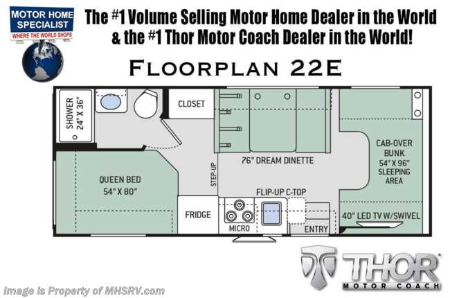 11/14/19 BEST PRICE @ MHSRV.com or Call 800-335-6054 - M.S.R.P. $90,920. While other dealers offer knock-off brand or "Private Label" Thor Motor Coach models, Motor Home Specialist remains the only Full-Line "Real" Thor Motor Coach dealership in the country. MHSRV is also the #1 selling TMC dealership in the world. No one will work harder to earn your business and our commitment to provide you an excellent sales and service experience is second to none. With that said, we highly recommend buying only Thor RVs that are recognized on the official Thor Motor Coach website regardless of where you and your family decide to purchase. Enjoy the benefits and access to the entire group of fully authorized TMC dealers nationwide. Also, when the time comes you can expect an almost certain higher appraisal value when selling or trading an official website recognized Thor RV. See them all at MHSRV.com. Compare & save big on this well appointed 2020 Thor Motor Coach Chateau 22E. Options not commonly found on the competition include an exterior entertainment center with built in TV, a 3-camera coach monitoring system, heated and power side view mirrors, upgraded leatherette seats instead of cloth, 3-burner range with large oven, an upgraded 15K BTU A/C unit, an outside shower, heated holding tanks, a second auxiliary coach battery, a convenience package with valve stem extenders and keyless entry as-well-as the all important child safety tether and cab-over child safety netting system.For more complete details on this unit and our entire inventory including brochures, window sticker, videos, photos, reviews & testimonials as well as additional information about Motor Home Specialist and our manufacturers please visit us at MHSRV.com or call 800-335-6054. At Motor Home Specialist, we DO NOT charge any prep or orientation fees like you will find at other dealerships. All sale prices include a 200-point inspection, interior & exterior wash, detail service and a fully automated high-pressure rain booth test and coach wash that is a standout service unlike that of any other in the industry. You will also receive a thorough coach orientation with an MHSRV technician, an RV Starter's kit, a night stay in our delivery park featuring landscaped and covered pads with full hook-ups and much more! Read Thousands upon Thousands of 5-Star Reviews at MHSRV.com and See What They Had to Say About Their Experience at Motor Home Specialist. WHY PAY MORE? WHY SETTLE FOR LESS?