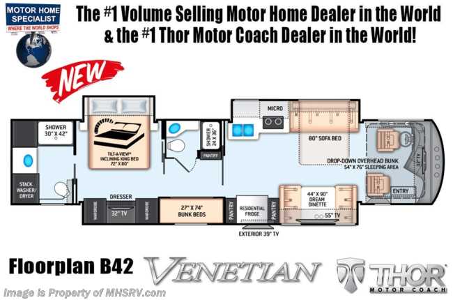 7-25-20 MSRP $408,750. The 2020 Thor Motor Coach Venetian B42 is approximately 42 feet 10 inches in length with 3 slides including a fall wall slide, 55” LED Smart TV, Tilt-a-View king bed, push button start, Cummins 400HP diesel engine, Freightliner raised rail chassis with new digital dash and a 6-speed automatic Allison transmission. A few additional standard features for the Venetian include a 10KW Onan generator with auto generator start, exterior entertainment center, (3) 15,000 BTU Low-Profile ducted cooling system with heat pumps, GPS, keyless entry, molded fiberglass roof, overhead cockpit loft, tile backsplash in the bathroom, stack washer/dryer, aluminum wheels, automatic leveling, VIP smart wheel and so much more. For more complete details on this unit and our entire inventory including brochures, window sticker, videos, photos, reviews & testimonials as well as additional information about Motor Home Specialist and our manufacturers please visit us at MHSRV.com or call 800-335-6054. At Motor Home Specialist, we DO NOT charge any prep or orientation fees like you will find at other dealerships. All sale prices include a 200-point inspection, interior & exterior wash, detail service and a fully automated high-pressure rain booth test and coach wash that is a standout service unlike that of any other in the industry. You will also receive a thorough coach orientation with an MHSRV technician, an RV Starter's kit, a night stay in our delivery park featuring landscaped and covered pads with full hook-ups and much more! Read Thousands upon Thousands of 5-Star Reviews at MHSRV.com and See What They Had to Say About Their Experience at Motor Home Specialist. WHY PAY MORE?... WHY SETTLE FOR LESS?