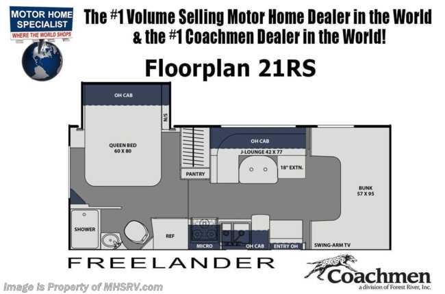 6-23-21 MSRP $97,151. The All New Coachmen Freelander Model 21RS for sale at Motor Home Specialist; the #1 volume selling motor home dealership in the world! This Class C RV is approximately 24 feet and 3 inches in length and features a cabover loft and a Ford chassis. Additional options include driver and passenger swivel seats, running boards, exterior windshield cover, child safety ladder, and a slideout awning. For more complete details on this unit and our entire inventory including brochures, window sticker, videos, photos, reviews & testimonials as well as additional information about Motor Home Specialist and our manufacturers please visit us at MHSRV.com or call 800-335-6054. At Motor Home Specialist, we DO NOT charge any prep or orientation fees like you will find at other dealerships. All sale prices include a 200-point inspection, interior & exterior wash, detail service and a fully automated high-pressure rain booth test and coach wash that is a standout service unlike that of any other in the industry. You will also receive a thorough coach orientation with an MHSRV technician, an RV Starter's kit, a night stay in our delivery park featuring landscaped and covered pads with full hook-ups and much more! Read Thousands upon Thousands of 5-Star Reviews at MHSRV.com and See What They Had to Say About Their Experience at Motor Home Specialist. WHY PAY MORE?... WHY SETTLE FOR LESS?