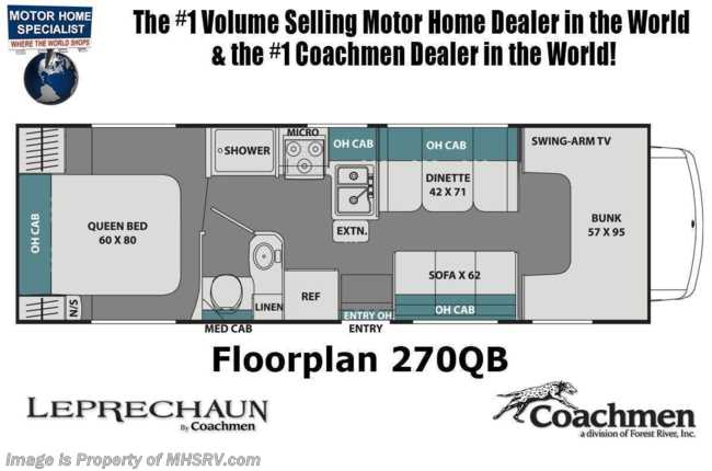 9/20/21 MSRP $102,339. New 2021 Coachmen Leprechaun Model 270QB. This Class C RV measures approximately 29 feet 6 inches in length with a cabover loft, Ford chassis. Options include a child safety net, 15K A/C with heat pump, and running boards. For more complete details on this unit and our entire inventory including brochures, window sticker, videos, photos, reviews & testimonials as well as additional information about Motor Home Specialist and our manufacturers please visit us at MHSRV.com or call 800-335-6054. At Motor Home Specialist, we DO NOT charge any prep or orientation fees like you will find at other dealerships. All sale prices include a 200-point inspection, interior & exterior wash, detail service and a fully automated high-pressure rain booth test and coach wash that is a standout service unlike that of any other in the industry. You will also receive a thorough coach orientation with an MHSRV technician, an RV Starter's kit, a night stay in our delivery park featuring landscaped and covered pads with full hook-ups and much more! Read Thousands upon Thousands of 5-Star Reviews at MHSRV.com and See What They Had to Say About Their Experience at Motor Home Specialist. WHY PAY MORE?... WHY SETTLE FOR LESS?
