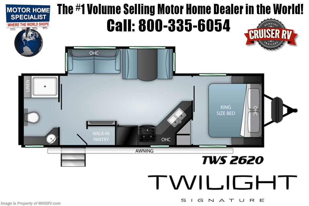 5/28/20 MSRP $33,642. The 2021 Cruiser RV Twilight travel trailer model TWS 2620 is approximately 30 feet 10 inches in length featuring a walk-in pantry, large windows for tons of natural light to shine in, spacious living area, and a large power awning. This amazing RV hosts the Signature Package which features a King Size Serta Comfort Mattress, Dual Nightstands w/ 110v Power, Black-Out Roller Shades, Adjustable Reading Lights w/ USB Charging Ports, Goodyear Tires w/ Aluminum Rims, Dexter Axles, Rear Ladder w/ Walkable Roof, Power Tongue Jack, 15K BTU High-Performance AC w/ Heat Pump, Whole-Home Dual Ducted AC System, Insulated Holding Tanks w/ Forced Heat Protection , Triple Seal Slide System Technology, Rain-A-Way Radius Roof Construction, Solid Surface Kitchen Countertops, Stainless Steel Fridge, Gourmet Recessed Oven, High Output Range Hood, Residential High-Rise Faucet w/ Pull-out Sprayer, Dream Dinette Tech System, Residential Tri-Fold Sofa, Porcelain Toilet, Large LED TV and a Bluetooth Stereo System. This Twilight also features the optional power stabilizer jacks. For additional details on this unit and our entire inventory including brochures, window sticker, videos, photos, reviews & testimonials as well as additional information about Motor Home Specialist and our manufacturers please visit us at MHSRV.com or call 800-335-6054. At Motor Home Specialist, we DO NOT charge any prep or orientation fees like you will find at other dealerships. All sale prices include a 200-point inspection, interior & exterior wash, detail service and a fully automated high-pressure rain booth test and coach wash that is a standout service unlike that of any other in the industry. You will also receive a thorough coach orientation with an MHSRV technician, a night stay in our delivery park featuring landscaped and covered pads with full hook-ups and much more! Read Thousands upon Thousands of 5-Star Reviews at MHSRV.com and See What They Had to Say About Their Experience at Motor Home Specialist. WHY PAY MORE? WHY SETTLE FOR LESS?