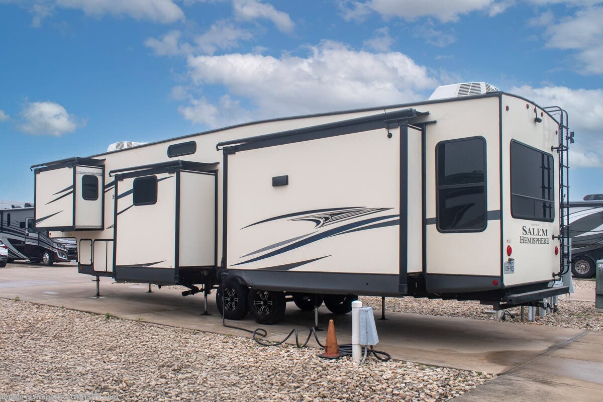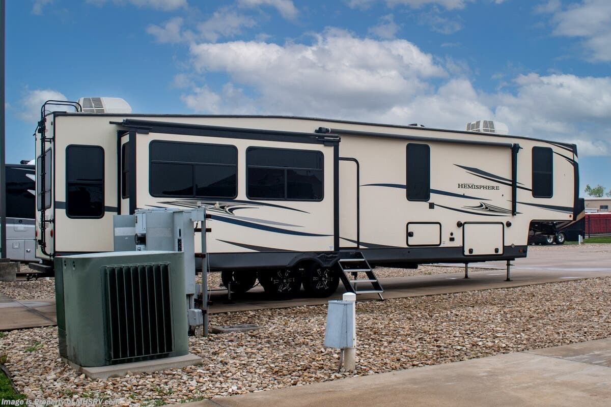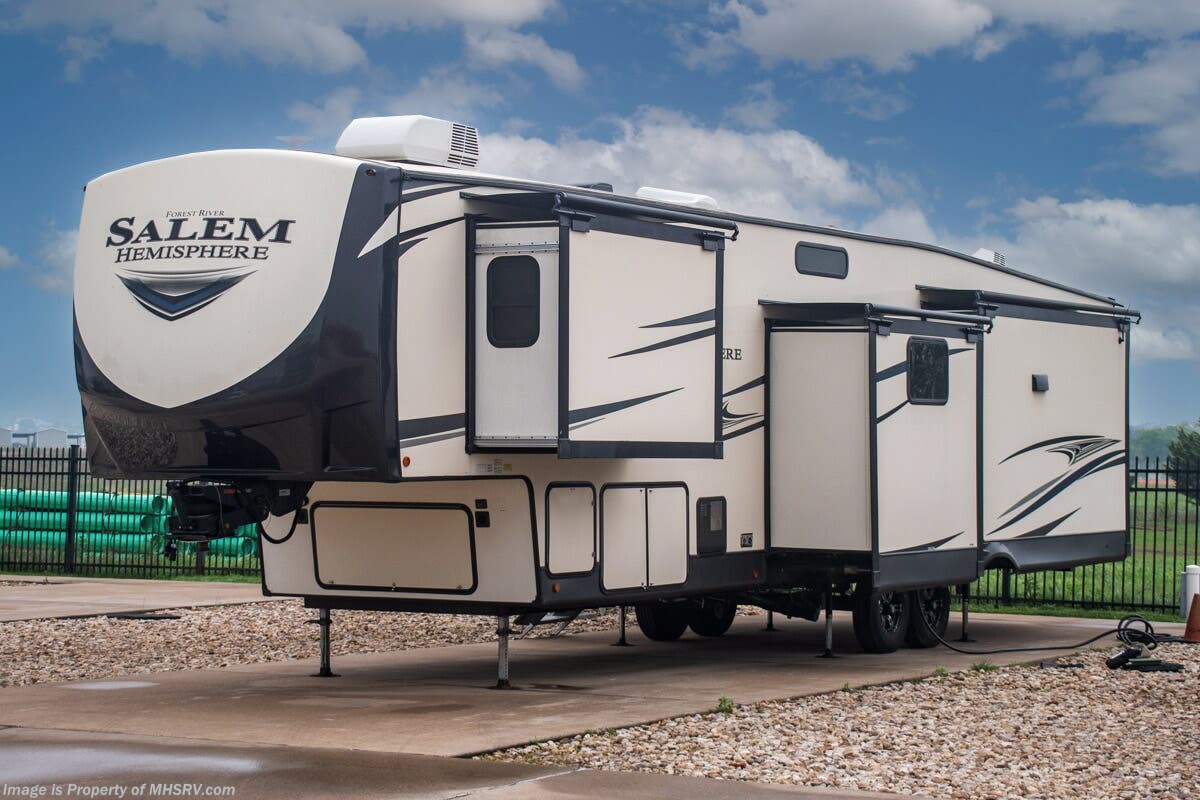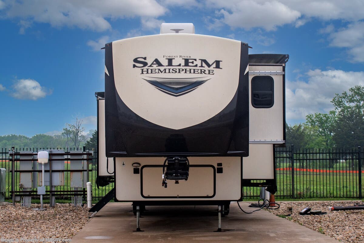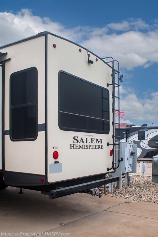 SOLD 5-5-2025 Used Forest River 5th Wheel for sale – Forest River Salem Hemisphere 369BL is approximately 43’ 0” feet in length, 4 slides and features auto leveling jacks, aluminum wheels, dual A/C’s, gas/electric water heater, power patio awning, pass through storage, black tank flush, 50 amp power, exterior shower, ladder, inverter, seating leather, kitchen backsplash, solid surface counter, 3 burner gas range with oven, glass shower door, king bed, living room TV, theater seats and much more. For additional details on this unit and our entire inventory including brochures, window sticker, videos, photos, reviews & testimonials as well as additional information about Motor Home Specialist and our manufacturers please visit us at MHSRV.com or call 800-335-6054. At Motor Home Specialist, we DO NOT charge any prep or orientation fees like you will find at other dealerships. Read Thousands upon Thousands of 5-Star Reviews at MHSRV.com and See What They Had to Say About Their Experience at Motor Home Specialist. WHY PAY MORE? WHY SETTLE FOR LESS?