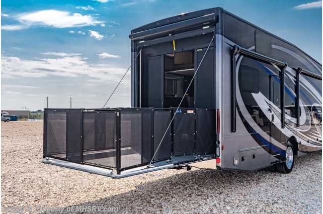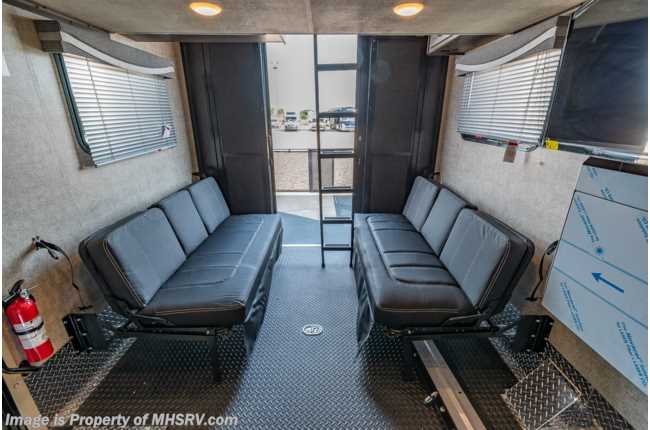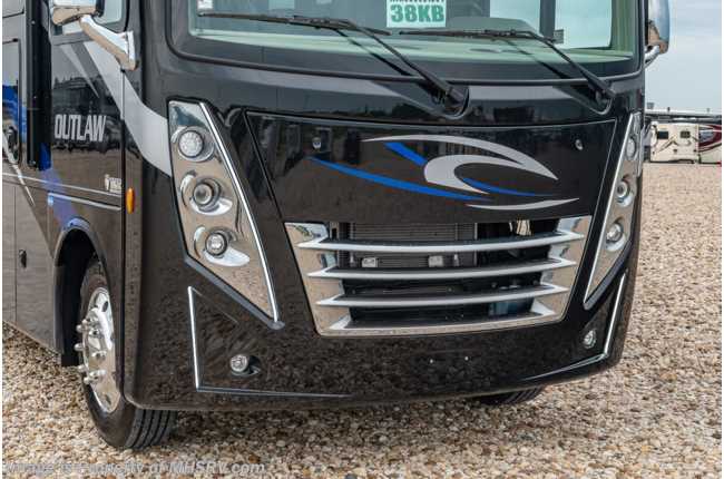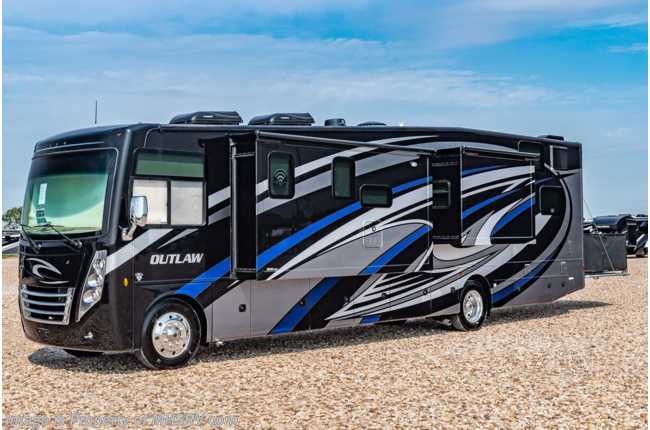 4-19-21 MSRP $231,376 New 2021 Thor Motor Coach Outlaw Toy Hauler model 38KB is approximately 39 feet 9 inches in length with 2 slide-out rooms, high polished aluminum wheels, residential refrigerator, electric rear patio awning, bug screen curtain in the garage, roller shades on the driver & passenger windows, as well as drop down ramp door with spring assist & railing for patio use. This beautiful new motorhome also features the new Ford chassis with 7.3L PFI V-8, 350HP, 468 ft. lbs. torque engine, a 6-speed TorqShift® automatic transmission, an updated instrument cluster, automatic headlights and a tilt/telescoping steering wheel. Options include the beautiful full body exterior, 2 opposing leatherette jackknife sofas in garage and frameless dual pane windows. New features for 2021 include all new full body paint exteriors, general décor updates throughout the coach, roller shade on the windshield, solar charging system with power controller and much more. The Outlaw toy hauler RV has an incredible list of standard features including beautiful wood & interior decor packages, LED TVs, (3) A/C units, power patio awing with integrated LED lighting, dual side entrance doors, 1-piece windshield, a 5500 Onan generator, 3 camera monitoring system, automatic leveling system, Soft Touch leather furniture and day/night shades. For additional details on this unit and our entire inventory including brochures, window sticker, videos, photos, reviews & testimonials as well as additional information about Motor Home Specialist and our manufacturers please visit us at MHSRV.com or call 800-335-6054. At Motor Home Specialist, we DO NOT charge any prep or orientation fees like you will find at other dealerships. All sale prices include a 200-point inspection, interior & exterior wash, detail service and a fully automated high-pressure rain booth test and coach wash that is a standout service unlike that of any other in the industry. You will also receive a thorough coach orientation with an MHSRV technician, a night stay in our delivery park featuring landscaped and covered pads with full hook-ups and much more! Read Thousands upon Thousands of 5-Star Reviews at MHSRV.com and See What They Had to Say About Their Experience at Motor Home Specialist. WHY PAY MORE? WHY SETTLE FOR LESS?