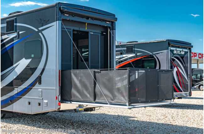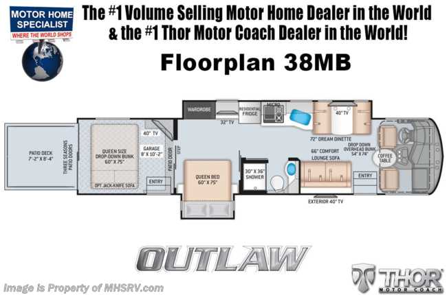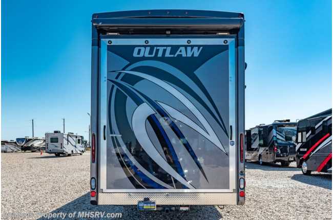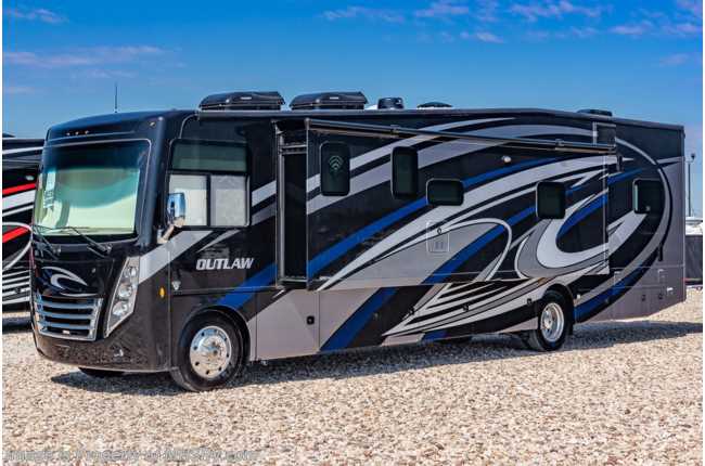 7-2-21 MSRP $232,351 New 2021 Thor Motor Coach Outlaw Toy Hauler model 38MB is approximately 39 feet 9 inches in length with 2 slide-out rooms, high polished aluminum wheels, residential refrigerator, electric rear patio awning, bug screen curtain in the garage, roller shades on the driver & passenger windows, as well as drop down ramp door with spring assist & railing for patio use. This beautiful new motorhome also features the new Ford chassis with 7.3L PFI V-8, 350HP, 468 ft. lbs. torque engine, a 6-speed TorqShift® automatic transmission, an updated instrument cluster, automatic headlights and a tilt/telescoping steering wheel. Options include the beautiful full body exterior, leatherette jackknife sofas in garage and frameless dual pane windows. New features for 2021 include all new full body paint exteriors, general décor updates throughout the coach, roller shade on the windshield, solar charging system with power controller and much more. The Outlaw toy hauler RV has an incredible list of standard features including beautiful wood & interior decor packages, LED TVs, (3) A/C units, power patio awing with integrated LED lighting, dual side entrance doors, 1-piece windshield, a 5500 Onan generator, 3 camera monitoring system, automatic leveling system, Soft Touch leather furniture and day/night shades. For additional details on this unit and our entire inventory including brochures, window sticker, videos, photos, reviews & testimonials as well as additional information about Motor Home Specialist and our manufacturers please visit us at MHSRV.com or call 800-335-6054. At Motor Home Specialist, we DO NOT charge any prep or orientation fees like you will find at other dealerships. All sale prices include a 200-point inspection, interior & exterior wash, detail service and a fully automated high-pressure rain booth test and coach wash that is a standout service unlike that of any other in the industry. You will also receive a thorough coach orientation with an MHSRV technician, a night stay in our delivery park featuring landscaped and covered pads with full hook-ups and much more! Read Thousands upon Thousands of 5-Star Reviews at MHSRV.com and See What They Had to Say About Their Experience at Motor Home Specialist. WHY PAY MORE? WHY SETTLE FOR LESS?