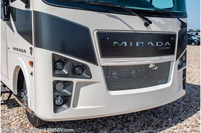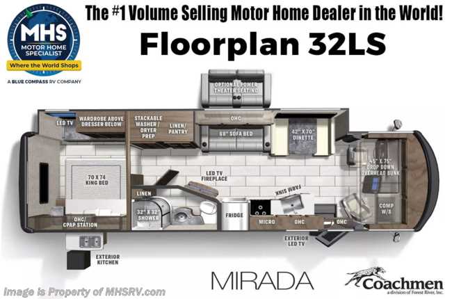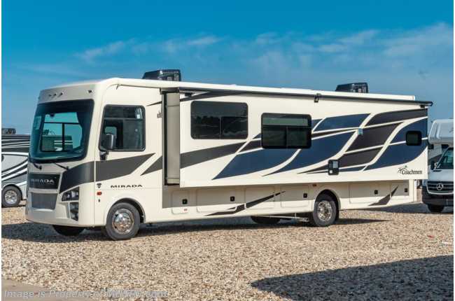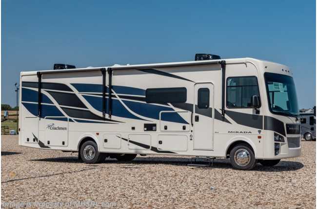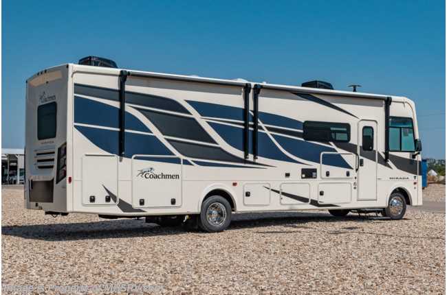 2/20/2024 MSRP $220,049. New 2023 Coachmen Mirada Model 32LS RV. This beautiful class A motor home measures approximately 34 feet 10 inches in length and boast several new innovations. The Mirada is also beautifully appointed featuring hardwood cabinet doors, solid surface kitchen countertop, tile backsplash and large stainless steel farm house sink. This beautiful new class A motor home also features the new Ford® 7.3L PFI V-8 engine and a 6-speed TorqShift® automatic transmission, an updated instrument cluster, automatic headlights and a tilt and telescoping steering wheel. Options include a power theater seating upgrade, stackable washer and dryer. A few standard features and construction highlights that help set the Mirada apart include 1-piece fiberglass roof, Azdel™ Nobel Select sidewalls, solar privacy shades throughout, power windshield shade, flush mounted 3 burner range with oven, glass door shower, generator, 50 Amp service, (2) roof A/C units, rear vision monitor w/ high definition backup and sideview cameras, electric awning, automatic transfer switch for easy set-up, pass-thru storage, automatic leveling jacks and much more. For additional details on this unit and our entire inventory including brochures, window sticker, videos, photos, reviews & testimonials as well as additional information about Motor Home Specialist and our manufacturers please visit us at MHSRV.com or call 800-335-6054. At Motor Home Specialist, we DO NOT charge any prep or orientation fees like you will find at other dealerships. All sale prices include a 200-point inspection, interior & exterior wash, detail service and a fully automated high-pressure rain booth test and coach wash that is a standout service unlike that of any other in the industry. You will also receive a thorough coach orientation with an MHSRV technician, a night stay in our delivery park featuring landscaped and covered pads with full hook-ups and much more! Read Thousands upon Thousands of 5-Star Reviews at MHSRV.com and See What They Had to Say About Their Experience at Motor Home Specialist. WHY PAY MORE? WHY SETTLE FOR LESS?