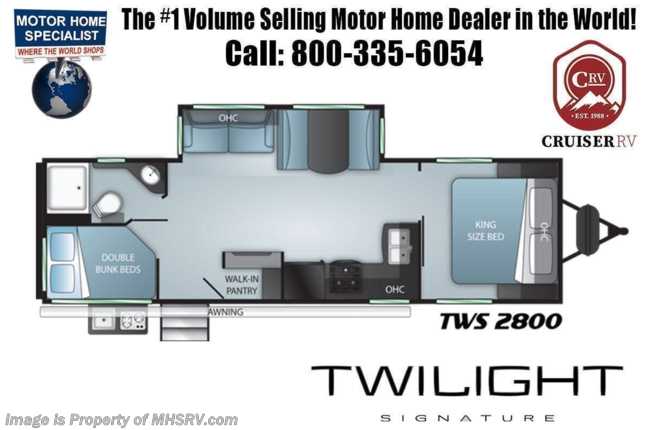 5-26-22 The 2022 Twilight Luxury Travel Trailer by Thor Industry's Cruiser RV Division. Model TWS 2800 is approximately 32 feet 10 inches in length featuring a large living area, large windows for tons of natural light and upgraded amenities inside & out! This amazing RV hosts the Signature Package which features a King Size Serta Comfort Mattress, Spare Tire, Power Tongue Jack, Deluxe Graphics Painted with Painted Fiberglass Cap, Solid Triple Entry Step, Man Entry Door w/ Large Assist Grab Handle, Rain-Away Radius Roof w/ 16” O.C. Roof Rafters, Dual Ducted Whole House A/C System, Heated & Enclosed Underbelly w/ Insulated Wrap Holding Tanks, Electric Awning w/ LED Light Strip, Keyed-A-Like Like Door System, Battery Disconnect, Solid Surface Kitchen Countertops, Black Out Roller Shades w/ Tinted Windows, Hardwood Cabinet Doors with Hidden Hinges, Stainless Steel Refrigerator, Upgraded Appliance Package, LED HD Living Room TV, Porcelain Toilet, and a Highrise Kitchen Faucet w/ Pull Out Sprayer. Additional options include power stabilizer jacks, theater seating IPO tri-fold sofa, 50 amp service and a 13.5K BTU second A/C. MSRP $55,400. For additional details on this unit and our entire inventory including brochures, window sticker, videos, photos, reviews & testimonials as well as additional information about Motor Home Specialist and our manufacturers please visit us at MHSRV.com or call 800-335-6054. At Motor Home Specialist, we DO NOT charge any prep or orientation fees like you will find at other dealerships. All sale prices include a 200-point inspection, interior & exterior wash, detail service and a fully automated high-pressure rain booth test and coach wash that is a standout service unlike that of any other in the industry. You will also receive a thorough coach orientation with an MHSRV technician, a night stay in our delivery park featuring landscaped and covered pads with full hook-ups and much more! Read Thousands upon Thousands of 5-Star Reviews at MHSRV.com and See What They Had to Say About Their Experience at Motor Home Specialist. WHY PAY MORE? WHY SETTLE FOR LESS?