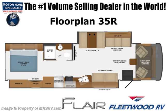 4-7 MSRP $184,218. New 2022 Fleetwood Flair 35R Class A Gas Crossover RV now available at Motor Home Specialist, the #1 Volume Selling Motor Home Dealership in the World. Options include the beautiful full body paint, upgraded Oceanfront Collection cabinetry, stackable washer & dryer, King stationary satellite universal system, steering stabilizer system and roof vent covers. For additional details on this unit and our entire inventory including brochures, window sticker, videos, photos, reviews & testimonials as well as additional information about Motor Home Specialist and our manufacturers please visit us at MHSRV.com or call 800-335-6054. At Motor Home Specialist, we DO NOT charge any prep or orientation fees like you will find at other dealerships. All sale prices include a 200-point inspection, interior & exterior wash, detail service and a fully automated high-pressure rain booth test and coach wash that is a standout service unlike that of any other in the industry. You will also receive a thorough coach orientation with an MHSRV technician, a night stay in our delivery park featuring landscaped and covered pads with full hook-ups and much more! Read Thousands upon Thousands of 5-Star Reviews at MHSRV.com and See What They Had to Say About Their Experience at Motor Home Specialist. WHY PAY MORE? WHY SETTLE FOR LESS?