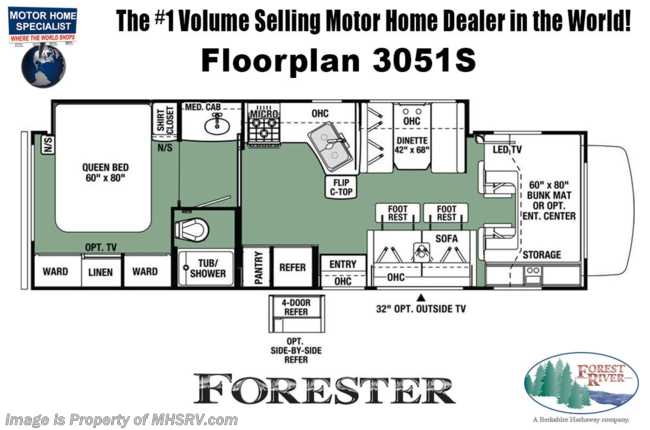 3-15 MSRP $126,628. New 2022 Forest River Forester Class C RV Model 3051S measures approximately 31 feet 11 inches in length featuring one full wall slide, Ford Chassis and a Ford 7.3L engine. This amazing class C RV features the Forester Premium Camping Package which includes a premium suspension pkg (N/A on Chevy), lane detection monitoring system, stainless steel convection microwave, heated remote exterior mirrors, back-up & side view cameras with monitor, in-dash sound system, in-house entertainment center with exterior speakers, slide-out room toppers, Ultra leather driver & passenger seating (N/A Chevrolet), fiberglass running boards, LP quick disconnect and more. Additional options include the beautiful dual high efficiency A/Cs with energy shedding system, exterior entertainment center, power driver seat, passenger swivel seats with booster cushions, Arctic Package, power theater seating and automatic leveling jacks. For more complete details on this unit and our entire inventory including brochures, window sticker, videos, photos, reviews & testimonials as well as additional information about Motor Home Specialist and our manufacturers please visit us at MHSRV.com or call 800-335-6054. At Motor Home Specialist, we DO NOT charge any prep or orientation fees like you will find at other dealerships. All sale prices include a 200-point inspection, interior & exterior wash, detail service and a fully automated high-pressure rain booth test and coach wash that is a standout service unlike that of any other in the industry. You will also receive a thorough coach orientation with an MHSRV technician, an RV Starter's kit, a night stay in our delivery park featuring landscaped and covered pads with full hook-ups and much more! Read Thousands upon Thousands of 5-Star Reviews at MHSRV.com and See What They Had to Say About Their Experience at Motor Home Specialist. WHY PAY MORE?... WHY SETTLE FOR LESS?