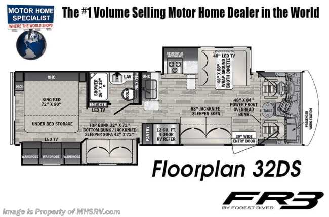 2/20/2024 New 2023 Forest River FR3 Model 32DS Bunk Model. This RV measures approximately 33 feet 11 inches in length and features 2 slide outs, sofa with footrests, large living area, power fold away loft bed and a king size bed. The FR3 crossover motorhome combines the best features, family friendly livability and affordability of an easy to drive Class C motorhome with the space, convenience and styling of a Class A motorhome. This beautiful new motorhome also features the new Ford chassis with 7.3L PFI V-8, a 6-speed TorqShift® automatic transmission. A few of the standard features the beautiful FR3 boasts include slide room topper awnings, power patio awning with LED light strip, power entry step, 4 point hydraulic leveling jacks, radius interior ceiling, night shade window treatment, LED lighting throughout unit, exterior shower, power front sun shade, 5.5KW generator, 3 burner cook top with oven and flush mount stove cover and so much more. For additional details on this unit and our entire inventory including brochures, window sticker, videos, photos, reviews & testimonials as well as additional information about Motor Home Specialist and our manufacturers please visit us at MHSRV.com or call 800-335-6054. At Motor Home Specialist, we DO NOT charge any prep or orientation fees like you will find at other dealerships. All sale prices include a 200-point inspection, interior & exterior wash, detail service and a fully automated high-pressure rain booth test and coach wash that is a standout service unlike that of any other in the industry. You will also receive a thorough coach orientation with an MHSRV technician, a night stay in our delivery park featuring landscaped and covered pads with full hook-ups and much more! Read Thousands upon Thousands of 5-Star Reviews at MHSRV.com and See What They Had to Say About Their Experience at Motor Home Specialist. WHY PAY MORE? WHY SETTLE FOR LESS?