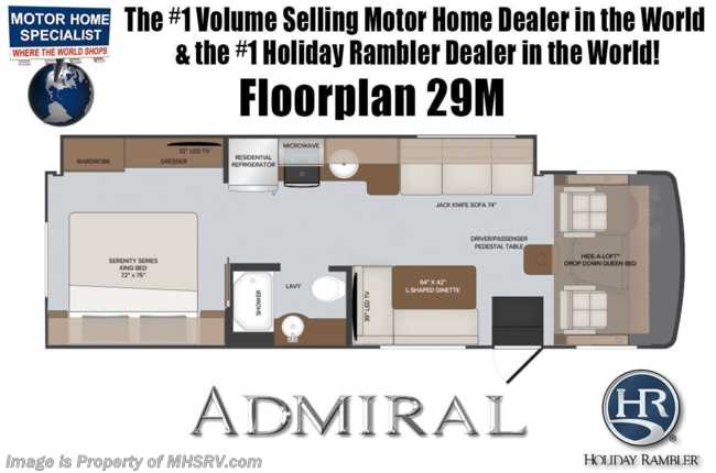3/11/22 MSRP $144,946. All-new 2022 Holiday Rambler Admiral 29M RV for sale at Motor Home Specialist; the #1 Volume Selling Motor Home Dealership in the World. No matter where the adventure's take you, you'll be ready for it with the Admiral. Options include the beautiful Oceanfront Collection decor, steering stabilizer system, 5.5KW generator, dual A/Cs and facing dinette. For more complete details on this unit and our entire inventory including brochures, window sticker, videos, photos, reviews & testimonials as well as additional information about Motor Home Specialist and our manufacturers please visit us at MHSRV.com or call 800-335-6054. At Motor Home Specialist, we DO NOT charge any prep or orientation fees like you will find at other dealerships. All sale prices include a 200-point inspection, interior & exterior wash, detail service and a fully automated high-pressure rain booth test and coach wash that is a standout service unlike that of any other in the industry. You will also receive a thorough coach orientation with an MHSRV technician, an RV Starter's kit, a night stay in our delivery park featuring landscaped and covered pads with full hook-ups and much more! Read Thousands upon Thousands of 5-Star Reviews at MHSRV.com and See What They Had to Say About Their Experience at Motor Home Specialist. WHY PAY MORE?... WHY SETTLE FOR LESS?