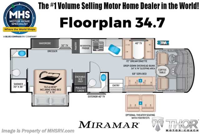 2023 Thor Motor Coach Miramar 34.7 Bath & 1/2 W/ King Bed, Theater Seats, Residential Fridge, Bedroom TV, Frameless Dual Pane Windows & More Floorplan