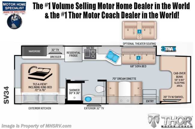 1/4/22 MSRP $241,418. New 2022 Thor Motor Coach Omni SV34 Super C is approximately 35 feet 6 inches in length with a full wall slide and is powered by the Ford® 6.7L Power Stroke® V8 turbo diesel engine with 330HP, 825 lb.-ft. torque and 10 speed transmission with selectable drive modes including Tow/Haul, Eco, Deep Sand/Snow. Also includes a SYNC 3 Enhanced Voice Recognition Communications and Entertainment System, 8" Color LCD touchscreen with swiping capability, 911 assist, AppLink and smart-charging USB ports and navigation. This beautiful RV also features the optional single child safety tether. The Omni Super C also features a 3 camera monitoring system, aluminum wheels, automatic leveling jacks, power patio awning with LED lighting, frameless windows, keyless entry, residential refrigerator, large OTR convection microwave, solid surface kitchen counter top, ball bearing drawer guides, king size bed, large TV in living area, exterior entertainment center with sound bar, 6KW Onan diesel generator with automatic generator start, multiplex wiring control system, tankless water heater, 1800-watt inverter and much more. For additional details on this unit and our entire inventory including brochures, window sticker, videos, photos, reviews & testimonials as well as additional information about Motor Home Specialist and our manufacturers please visit us at MHSRV.com or call 800-335-6054. At Motor Home Specialist, we DO NOT charge any prep or orientation fees like you will find at other dealerships. All sale prices include a 200-point inspection, interior & exterior wash, detail service and a fully automated high-pressure rain booth test and coach wash that is a standout service unlike that of any other in the industry. You will also receive a thorough coach orientation with an MHSRV technician, a night stay in our delivery park featuring landscaped and covered pads with full hook-ups and much more! Read Thousands upon Thousands of 5-Star Reviews at MHSRV.com and See What They Had to Say About Their Experience at Motor Home Specialist. WHY PAY MORE? WHY SETTLE FOR LESS?