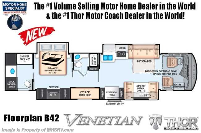 10/28/22 MSRP $505,568. The 2022 Thor Motor Coach Venetian B42 is approximately 42 feet 10 inches in length with 3 slides including a full wall slide, 55” LED Smart TV, Tilt-a-View king bed, push button start, Cummins 400HP diesel engine, Freightliner raised rail chassis with new digital dash and a 6-speed automatic Allison transmission. This amazing motor home also features the optional dishwasher drawer. A few additional standard features for the Venetian include a Onan diesel generator with auto generator start, exterior entertainment center, (3) 15,000 BTU Low-Profile ducted cooling system with heat pumps, GPS, keyless entry, molded fiberglass roof, overhead cockpit loft, tile backsplash in the bathroom, stack washer/dryer, aluminum wheels, automatic leveling, VIP smart wheel and so much more. For more complete details on this unit and our entire inventory including brochures, window sticker, videos, photos, reviews & testimonials as well as additional information about Motor Home Specialist and our manufacturers please visit us at MHSRV.com or call 800-335-6054. At Motor Home Specialist, we DO NOT charge any prep or orientation fees like you will find at other dealerships. All sale prices include a 200-point inspection, interior & exterior wash, detail service and a fully automated high-pressure rain booth test and coach wash that is a standout service unlike that of any other in the industry. You will also receive a thorough coach orientation with an MHSRV technician, an RV Starter's kit, a night stay in our delivery park featuring landscaped and covered pads with full hook-ups and much more! Read Thousands upon Thousands of 5-Star Reviews at MHSRV.com and See What They Had to Say About Their Experience at Motor Home Specialist. WHY PAY MORE?... WHY SETTLE FOR LESS?