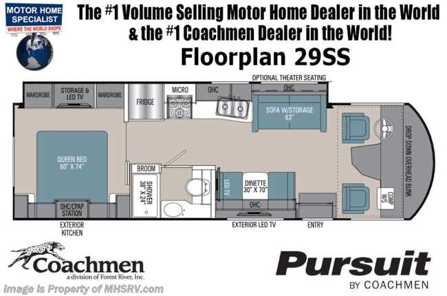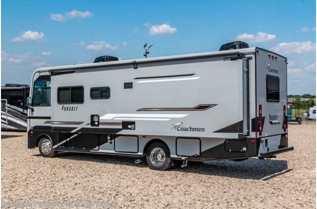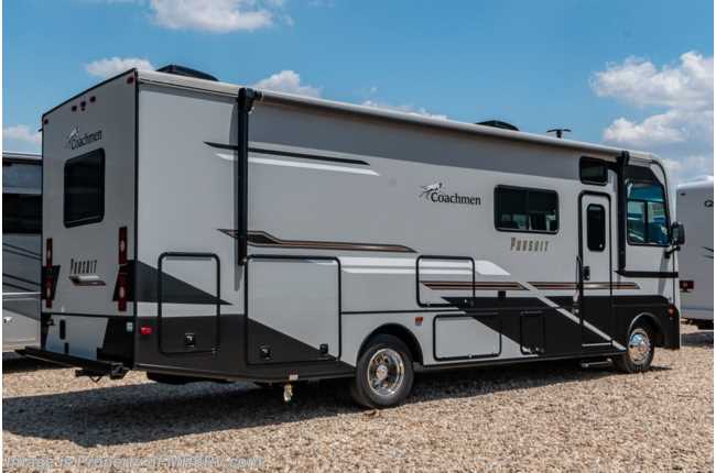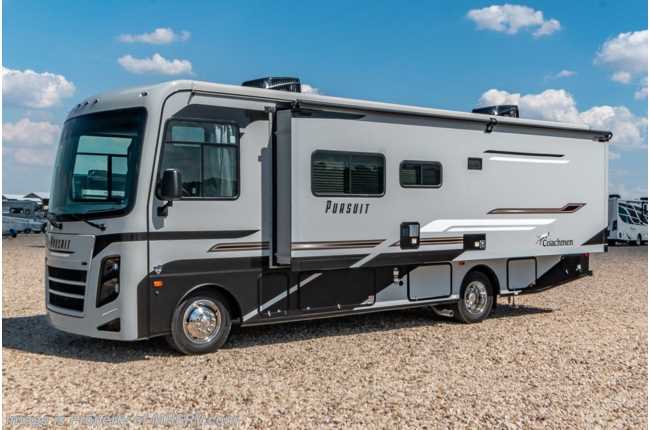 5-1-23 MSRP $182,316. The All New 2023 Coachmen Pursuit 29SS. This new Class A motor home is approximately 30 feet 3 inches length with a full wall slide, new Ford chassis with 7.3L PFI V-8, a 6-speed TorqShift® automatic transmission, an updated instrument cluster, automatic headlights and a tilt/telescoping steering wheel. Each Pursuit comes standard with self-closing drawer guides, hardwood cabinet doors, cockpit table, coach TV, pantry, power bath vent, skylight, double coach battery, cruise control, back up monitor, power entrance step, power patio awning, hitch with 7-way plug and much more. For additional details on this unit and our entire inventory including brochures, window sticker, videos, photos, reviews & testimonials as well as additional information about Motor Home Specialist and our manufacturers please visit us at MHSRV.com or call 800-335-6054. At Motor Home Specialist, we DO NOT charge any prep or orientation fees like you will find at other dealerships. All sale prices include a 200-point inspection, interior & exterior wash, detail service and a fully automated high-pressure rain booth test and coach wash that is a standout service unlike that of any other in the industry. You will also receive a thorough coach orientation with an MHSRV technician, a night stay in our delivery park featuring landscaped and covered pads with full hook-ups and much more! Read Thousands upon Thousands of 5-Star Reviews at MHSRV.com and See What They Had to Say About Their Experience at Motor Home Specialist. WHY PAY MORE? WHY SETTLE FOR LESS?