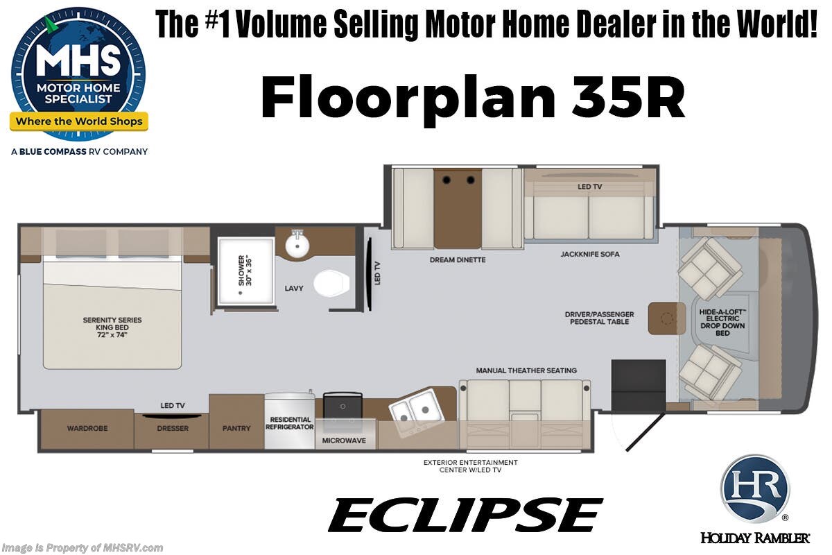 7-1-23 All-new 2023 Holiday Rambler Eclipse for sale at Motor Home Specialist; the #1 Volume Selling Motor Home Dealership in the World. No matter where the adventure's take you, you'll be ready for it with the Eclipse. Features include theater seating, large living room TV, exterior entertainment center with LED TV, electric Hide A Loft as well as the Serenity Series King Bed. Options include the Safe T View, washer and dryer, roof vent, steering stabilizer system and collision mitigation system. For additional details on this unit and our entire inventory including brochures, window sticker, videos, photos, reviews & testimonials as well as additional information about Motor Home Specialist and our manufacturers please visit us at MHSRV.com or call 800-335-6054. At Motor Home Specialist, we DO NOT charge any prep or orientation fees like you will find at other dealerships. All sale prices include a 200-point inspection, interior & exterior wash, detail service and a fully automated high-pressure rain booth test and coach wash that is a standout service unlike that of any other in the industry. You will also receive a thorough coach orientation with an MHSRV technician, a night stay in our delivery park featuring landscaped and covered pads with full hook-ups and much more! Read Thousands upon Thousands of 5-Star Reviews at MHSRV.com and See What They Had to Say About Their Experience at Motor Home Specialist. WHY PAY MORE? WHY SETTLE FOR LESS?