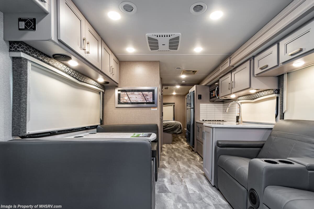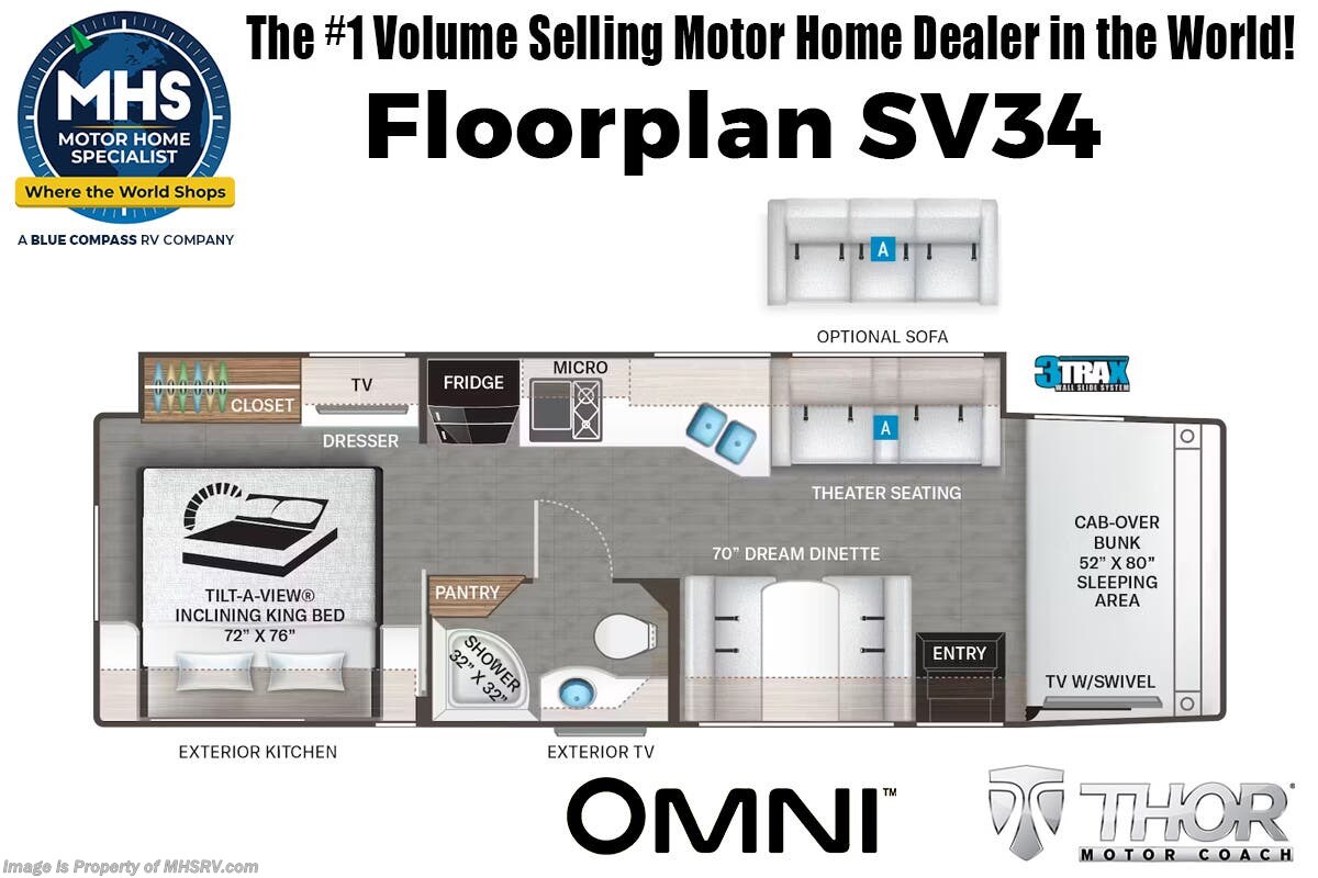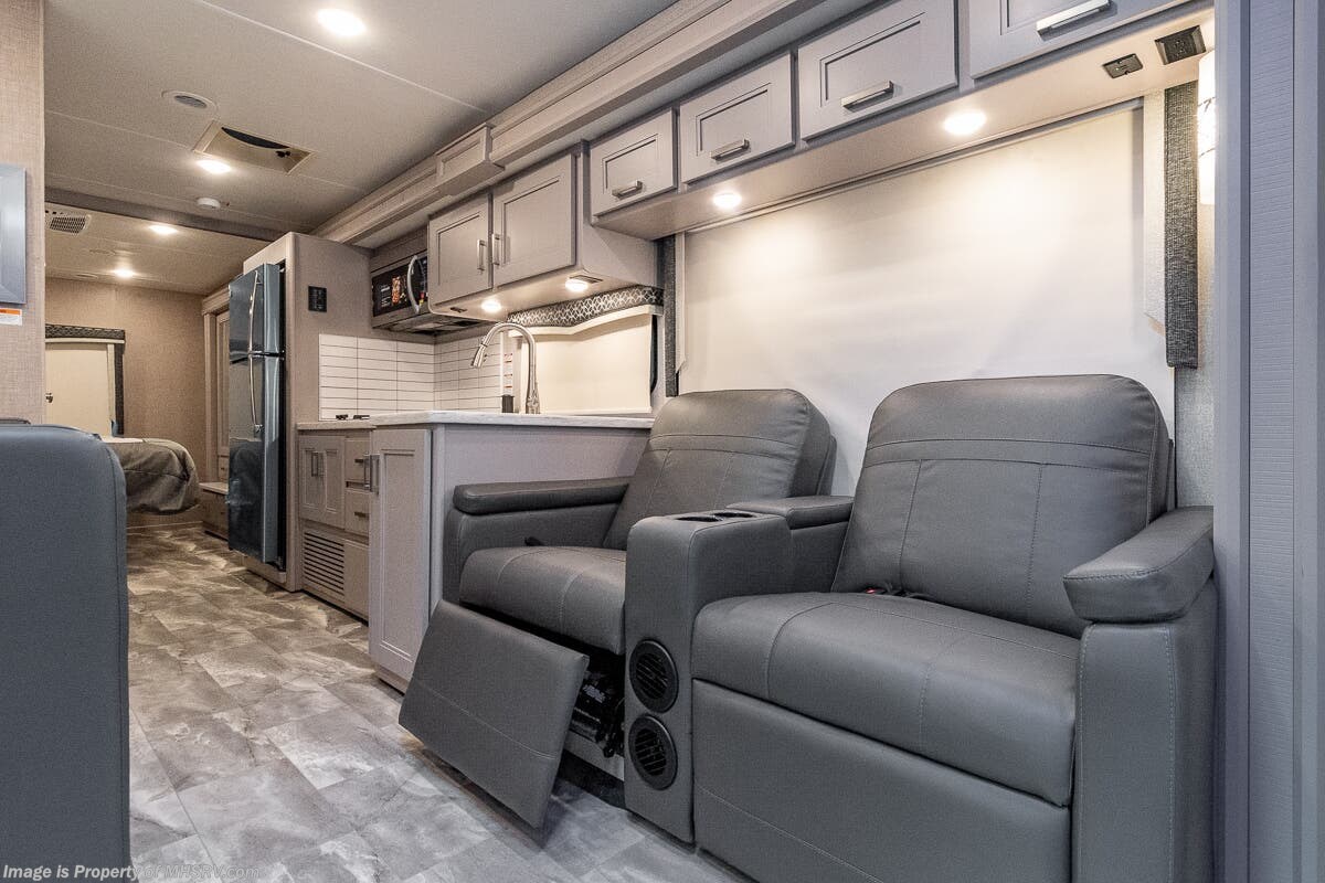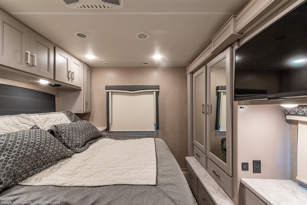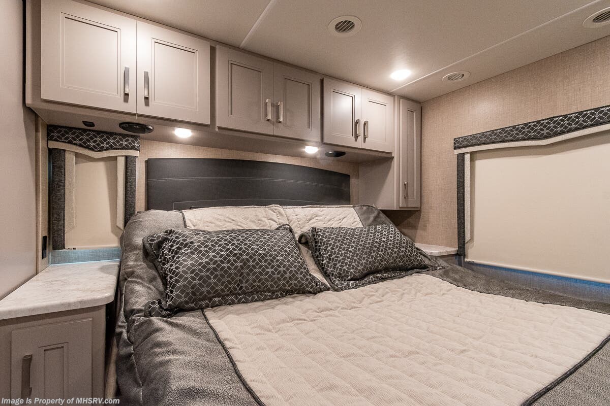 1/29/2024 MSRP $294,510. New 2023 Thor Motor Coach Omni SV34 Super C is approximately 35 feet 6 inches in length with a full wall slide and is powered by the Ford® 6.7L Power Stroke® V8 turbo diesel engine with 330HP, 825 lb.-ft. torque and 10 speed transmission with selectable drive modes including Tow/Haul, Eco, Deep Sand/Snow. Also includes a SYNC 3 Enhanced Voice Recognition Communications and Entertainment System, 8" Color LCD touchscreen with swiping capability, 911 assist, AppLink and smart-charging USB ports and navigation. This beautiful RV also features the optional upgraded cabinetry. The Omni Super C also features a 3 camera monitoring system, aluminum wheels, automatic leveling jacks, power patio awning with LED lighting, frameless windows, keyless entry, residential refrigerator, large OTR convection microwave, solid surface kitchen counter top, ball bearing drawer guides, king size bed, large TV in living area, exterior entertainment center with sound bar, 6KW Onan diesel generator with automatic generator start, multiplex wiring control system, tankless water heater, 1800-watt inverter and much more. For additional details on this unit and our entire inventory including brochures, window sticker, videos, photos, reviews & testimonials as well as additional information about Motor Home Specialist and our manufacturers please visit us at MHSRV.com or call 800-335-6054. At Motor Home Specialist, we DO NOT charge any prep or orientation fees like you will find at other dealerships. All sale prices include a 200-point inspection, interior & exterior wash, detail service and a fully automated high-pressure rain booth test and coach wash that is a standout service unlike that of any other in the industry. You will also receive a thorough coach orientation with an MHSRV technician, a night stay in our delivery park featuring landscaped and covered pads with full hook-ups and much more! Read Thousands upon Thousands of 5-Star Reviews at MHSRV.com and See What They Had to Say About Their Experience at Motor Home Specialist. WHY PAY MORE? WHY SETTLE FOR LESS?