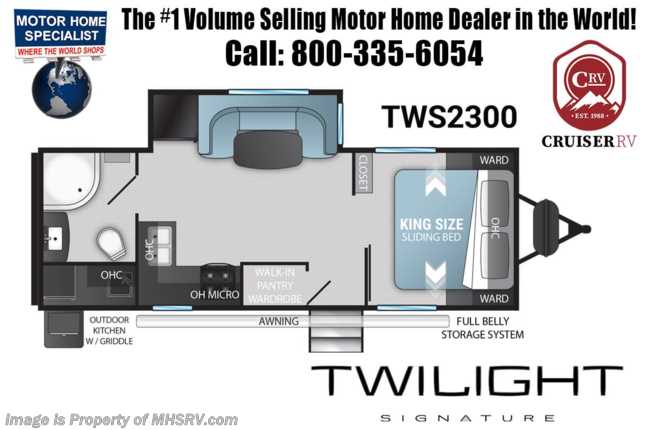 5-29-23 MSRP $50,556. The 2022 Twilight Luxury Travel Trailer by Thor Industry's Cruiser RV Division. Model TWS 2300 is approximately 23 feet in length featuring a large living area, large windows for tons of natural light, and upgraded amenities inside & out! This amazing RV host the Select Package which features a heavy duty Goodyear tires, spare tire, molded fiberglass cap, solid triple entry step, power tongue jacks, electric stabilizer jacks, heated and enclosed underbelly, electric awning, seamless countertops throughout, king size mattress, hardwood cabinets, stainless steel refrigerator, and much more. Additional options for this beautiful travel trailer include the 50AMP, Twilight Signature Package and theater dinette. For additional details on this unit and our entire inventory including brochures, videos, photos, reviews & testimonials as well as additional information about Motor Home Specialist and our manufacturers please visit us at MHSRV.com or call 800-335-6054. At Motor Home Specialist, we DO NOT charge any prep or orientation fees like you will find at other dealerships. All sale prices include a 200-point inspection, interior & exterior wash, detail service, and a fully automated high-pressure rain booth test and coach wash that is a standout service unlike that of any other in the industry. You will also receive a thorough coach orientation with an MHSRV technician, a night stay in our delivery park featuring landscaped and covered pads with full hook-ups and much more! Read Thousands upon Thousands of 5-Star Reviews at MHSRV.com and See What They Had to Say About Their Experience at Motor Home Specialist. WHY PAY MORE? WHY SETTLE FOR LESS?