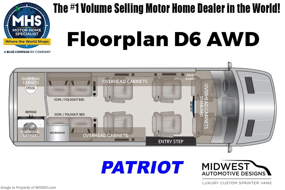 SOLD 10/3/2024 Motor Home Specialist’s Famous 911 Pricing is Back! Save Huge During Our 15th Annual 911 Emergency Model Year Reduction Sale. All Specially Marked Units Must Go Now! 100s to Choose From - Sale Ends June 29th, 2024. MSRP $249,026. New 2024 Midwest Automotive Design Patriot Cruiser D6. This luxury Class B RV measures approximately 24 feet 3 inches in length with the 170EXT sprinter chassis which features the powerful 2.0L High-Output Diesel engine. Options include SLS diamond seating pattern upgrade, satin wood finish, all-terrain tires & black rims, molded low profile spoiler, seat heat & massage for all captains seats, 4-camera system & dash monitor, wireless internet router & apple tv, and outside entertainment prep kit. For additional details on this unit and our entire inventory including brochures, window sticker, videos, photos, reviews & testimonials as well as additional information about Motor Home Specialist and our manufacturers please visit us at MHSRV.com or call 800-335-6054. At Motor Home Specialist, we DO NOT charge any prep or orientation fees like you will find at other dealerships. All sale prices include a 200-point inspection, interior & exterior wash, detail service and a fully automated high-pressure rain booth test and coach wash that is a standout service unlike that of any other in the industry. You will also receive a thorough coach orientation with an MHSRV technician, a night stay in our delivery park featuring landscaped and covered pads with full hook-ups and much more! Read Thousands upon Thousands of 5-Star Reviews at MHSRV.com and See What They Had to Say About Their Experience at Motor Home Specialist. WHY PAY MORE? WHY SETTLE FOR LESS?