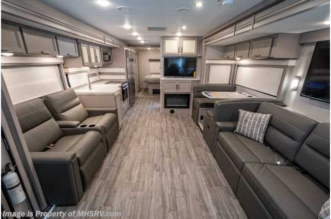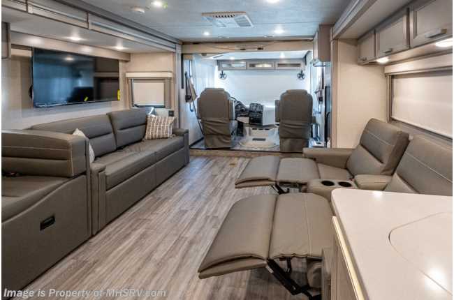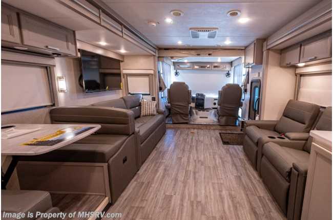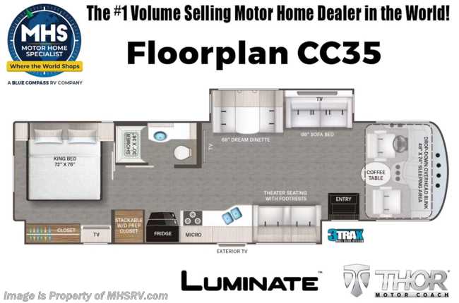 7-19 New 2024 Thor Motor Coach Luminate CC35 Model. This RV measures approximately 37 feet in length and features a Ford F-53 chassis with a 7.3L V-8 engine, a six speed automatic transmission, a drop-down overhead loft, 2 slide-outs and a bedroom TV. Options include the dual pane windows and Coastline Grey wood. The Luminate also boasts an impressive list of standard features including the exterior entertainment center, Winegard Connect 2.0 WiFi, rotary battery disconnect switch, adjustable shelving bracketry, BM Pro Multiplex system, power privacy shade on windshield, touchscreen radio that features navigation and back-up monitor, heated remote exterior mirrors with integrated sideview cameras, lateral power patio awning with integrated LED lighting and much more. For additional details on this unit and our entire inventory including brochures, window sticker, videos, photos, reviews & testimonials as well as additional information about Motor Home Specialist and our manufacturers please visit us at MHSRV.com or call 800-335-6054. At Motor Home Specialist, we DO NOT charge any prep or orientation fees like you will find at other dealerships. All sale prices include a 200-point inspection, interior & exterior wash, detail service and a fully automated high-pressure rain booth test and coach wash that is a standout service unlike that of any other in the industry. You will also receive a thorough coach orientation with an MHSRV technician, a night stay in our delivery park featuring landscaped and covered pads with full hook-ups and much more! Read Thousands upon Thousands of 5-Star Reviews at MHSRV.com and See What They Had to Say About Their Experience at Motor Home Specialist. WHY PAY MORE? WHY SETTLE FOR LESS?