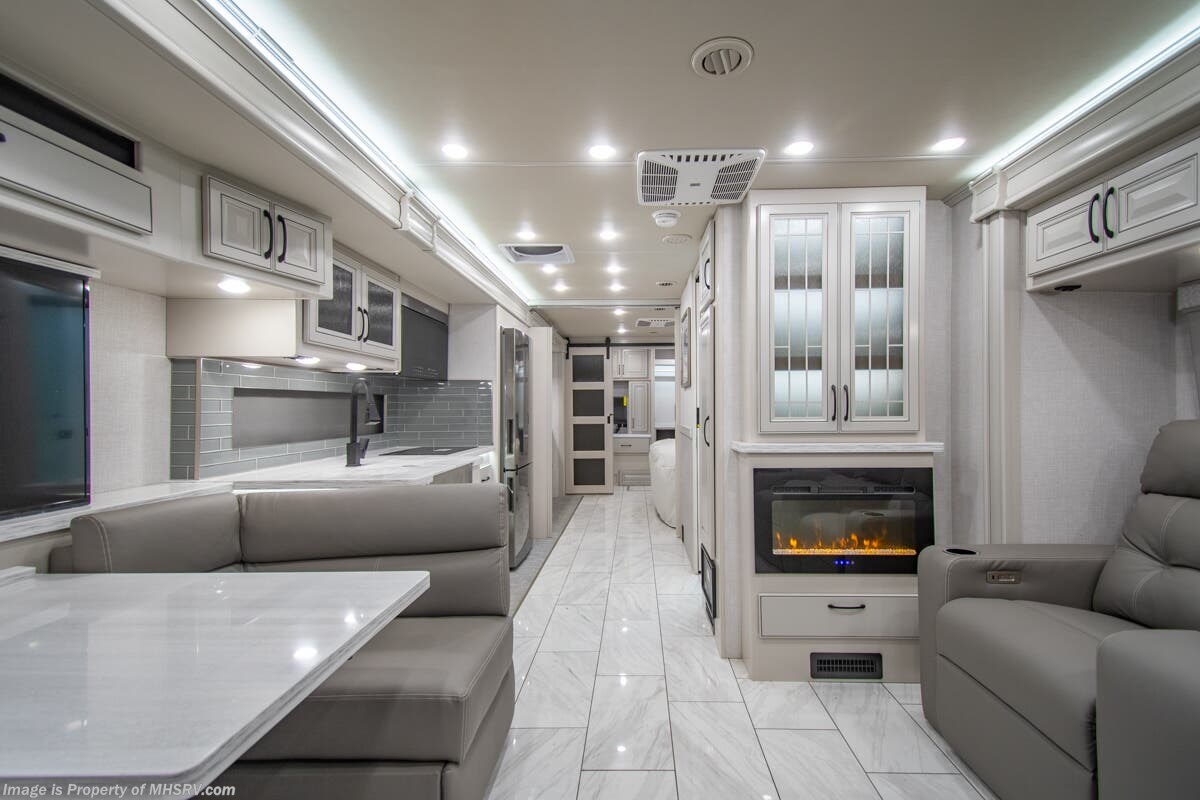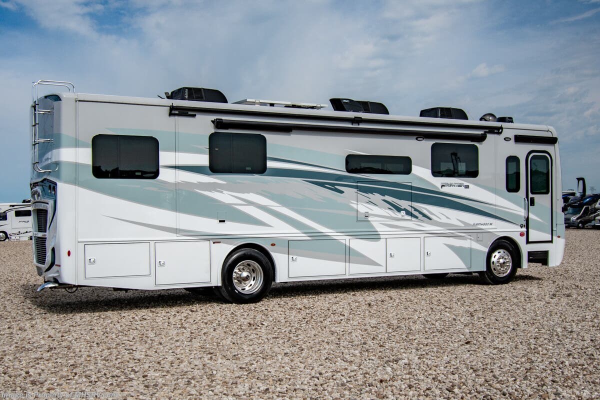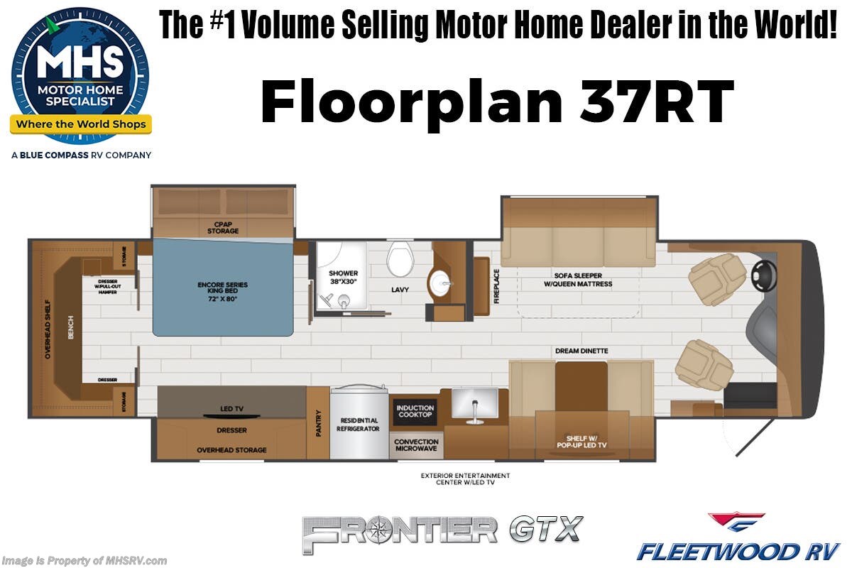 SOLD 7-3-2025 MSRP $474,264. All new 2025 Fleetwood Frontier GTX 37RT for sale at Motor Home Specialist, the #1 Volume Selling Motor Home Dealership in the World. This motorhome is approximately 37 feet 11 inches in length and features the 360HP Turbo Cummins engine, diesel aqua-hot, king bed, induction cook-top, diesel generator with auto gen start and much more. Options include the drop down queen bed, Connectivity Package (WiFi Ranger Sky4 Pro Pack, 300 Watt Solar Panel & Cellular Booster), Safety Awareness Package (Mobileye®- Forward Collision Warning, Lane Departure Warning, Headway/Following Time, Pedestrian/Cyclist Collision Warning, Speed Limit Indicator, and Interior Safe-T-View), washer/dryer, the corner office, full bay slide out tray, motion power lounge, king stationary satellite system, power cord reel, power passenger seat with power footrest, central vacuum system and roof vent rain covers. For additional details on this unit and our entire inventory including brochures, window sticker, videos, photos, reviews & testimonials as well as additional information about Motor Home Specialist and our manufacturers please visit us at MHSRV.com or call 800-335-6054. At Motor Home Specialist, we DO NOT charge any prep or orientation fees like you will find at other dealerships. All sale prices include a 200-point inspection, interior & exterior wash, detail service and a fully automated high-pressure rain booth test and coach wash that is a standout service unlike that of any other in the industry. You will also receive a thorough coach orientation with an MHSRV technician, a night stay in our delivery park featuring landscaped and covered pads with full hook-ups and much more! Read Thousands upon Thousands of 5-Star Reviews at MHSRV.com and See What They Had to Say About Their Experience at Motor Home Specialist. WHY PAY MORE? WHY SETTLE FOR LESS?