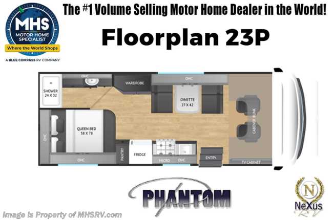 11-25 M.S.R.P. $131,281 - All New 2025 Nexus Phantom 23P Luxury RV for Sale at Motor Home Specialist; the #1 Volume Selling Motor Home Dealership in the World. This unit is approximately 25 feet in length and features a large TV in the cab-over loft for great visibility most anywhere in the RV! It rides on the amazing new Ford® E-Series chassis with a 7.3L V8 engine! Optional features include an aluminum running boards. This amazing Class C RV also features the Phantom Value Package which includes a fiberglass roof, large residential size microwave, residential refrigerator w/inverter, and rear fiberglass radius eyebrow. Additional features and construction highlights found in the Nexus RV include galvanized steel storage boxes, heated and enclosed holding tanks, upgraded flooring and "plug and play" electrical harnesses throughout the coach making every Nexus RV's electrical system more dependable. Strength, Safety and Customer Satisfaction are the 3 cornerstones found in every Nexus RV. The strength of the Ford® chassis is nothing short of legendary and the all new V-8 engine delivers exceptional power and performance. The construction of the Nexus RV far exceeds the industry norm. First, and arguable foremost, the Nexus RV boast an all STEEL cage construction instead of the normal aluminum framed construction found in the competition. Steel cage construction is 72% stronger than aluminum and is only common place is RVs such as the Foretravel Realm or a Prevost bus conversion; both of which would have an M.S.R.P. value well over $1 million dollars! That same commitment to strength and safety is found throughout the Nexus line-up. You will also find construction highlights such as 2 layers of Azdel substrate in the sidewalls & roof! The Azdel product provides 3X the insulation value of wood and is 50% lighter which will help optimize your engine’s performance and fuel economy, and because it is not a wood material harvested from the rain forest it is both greener and provides a less that 1% chance of retaining any moisture that could ever lead to wall separation or mold. It is also formaldehyde free, impact resistant and a sound absorbing material creating a much quieter RV. To further protect and insulate the RV from the elements Nexus utilizes high grade UV protected automotive window seals. The roof is a pre-stamped metal roof truss system that is further highlighted by the exterior layer of seamless fiberglass as opposed to the normal TPO or "rubber roofs" found in most RVs built today. The steel roof is also designed to incorporate Nexus RV's Easy-Flow Air Distribution system. This HVAC ducting is a tried-and-true system that provides more evenly distributed A/C throughout the coach as well as helps promote cleaner air and reduce allergens. For additional details on this unit and our entire inventory including brochures, window sticker, videos, photos, reviews & testimonials as well as additional information about Motor Home Specialist and our manufacturers please visit us at MHSRV.com or call 800-335-6054. At Motor Home Specialist, we DO NOT charge any prep or orientation fees like you will find at other dealerships. All sale prices include a 200-point inspection, interior & exterior wash, detail service and a fully automated high-pressure rain booth test and coach wash that is a standout service unlike that of any other in the industry. You will also receive a thorough coach orientation with an MHSRV technician, a night stay in our delivery park featuring landscaped and covered pads with full hook-ups and much more! Read Thousands upon Thousands of 5-Star Reviews at MHSRV.com and See What They Had to Say About Their Experience at Motor Home Specialist. WHY PAY MORE? WHY SETTLE FOR LESS?
