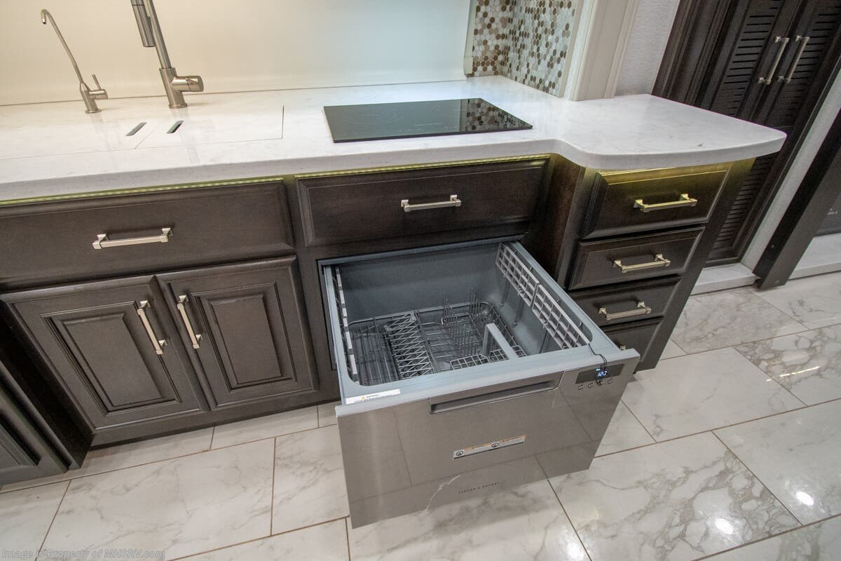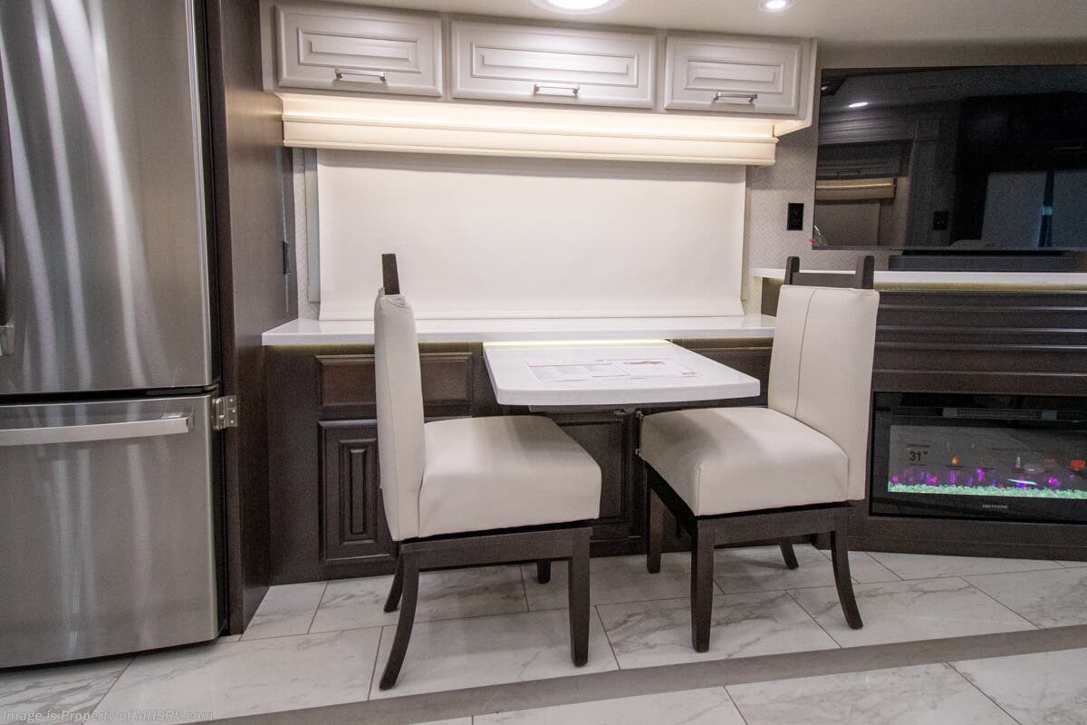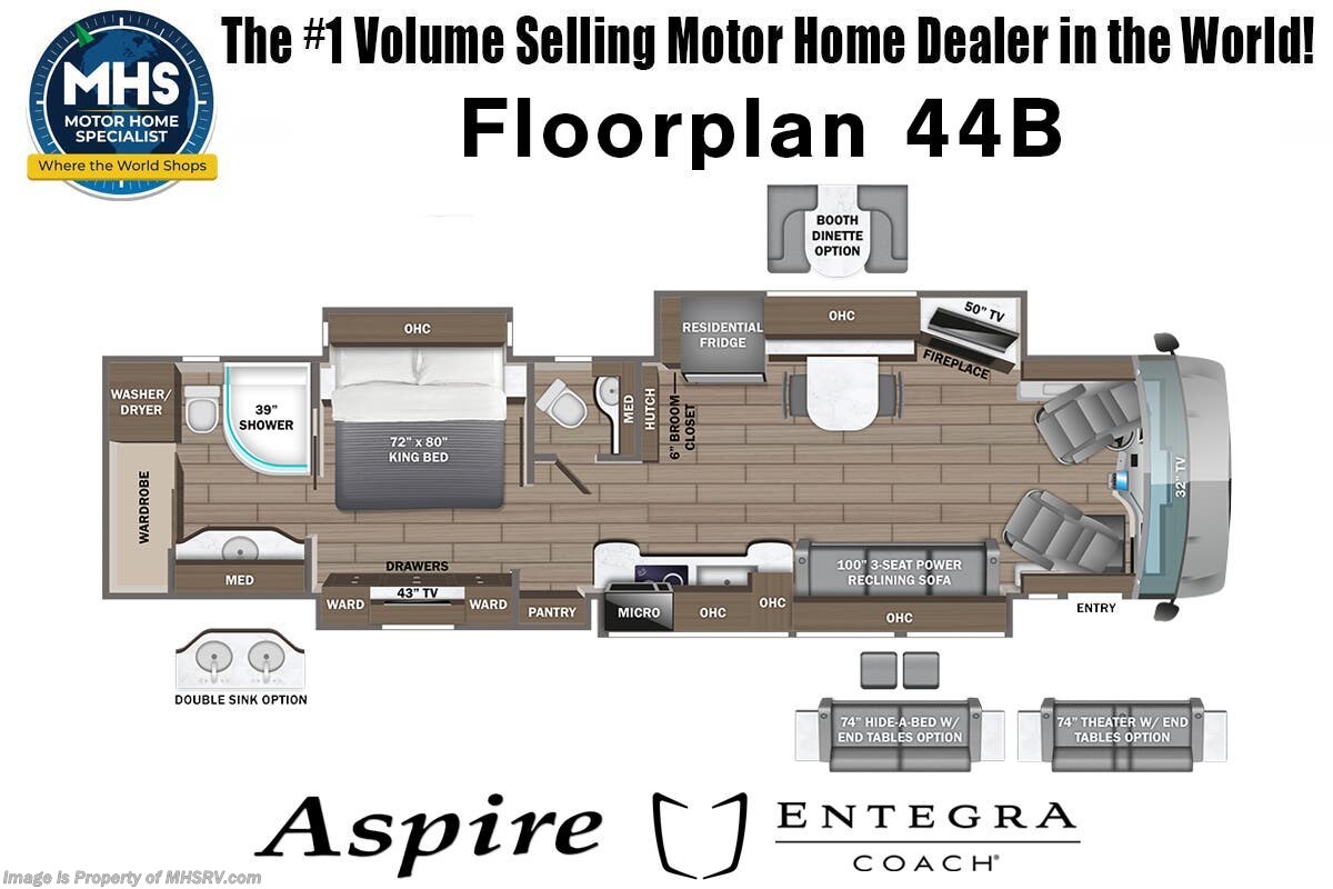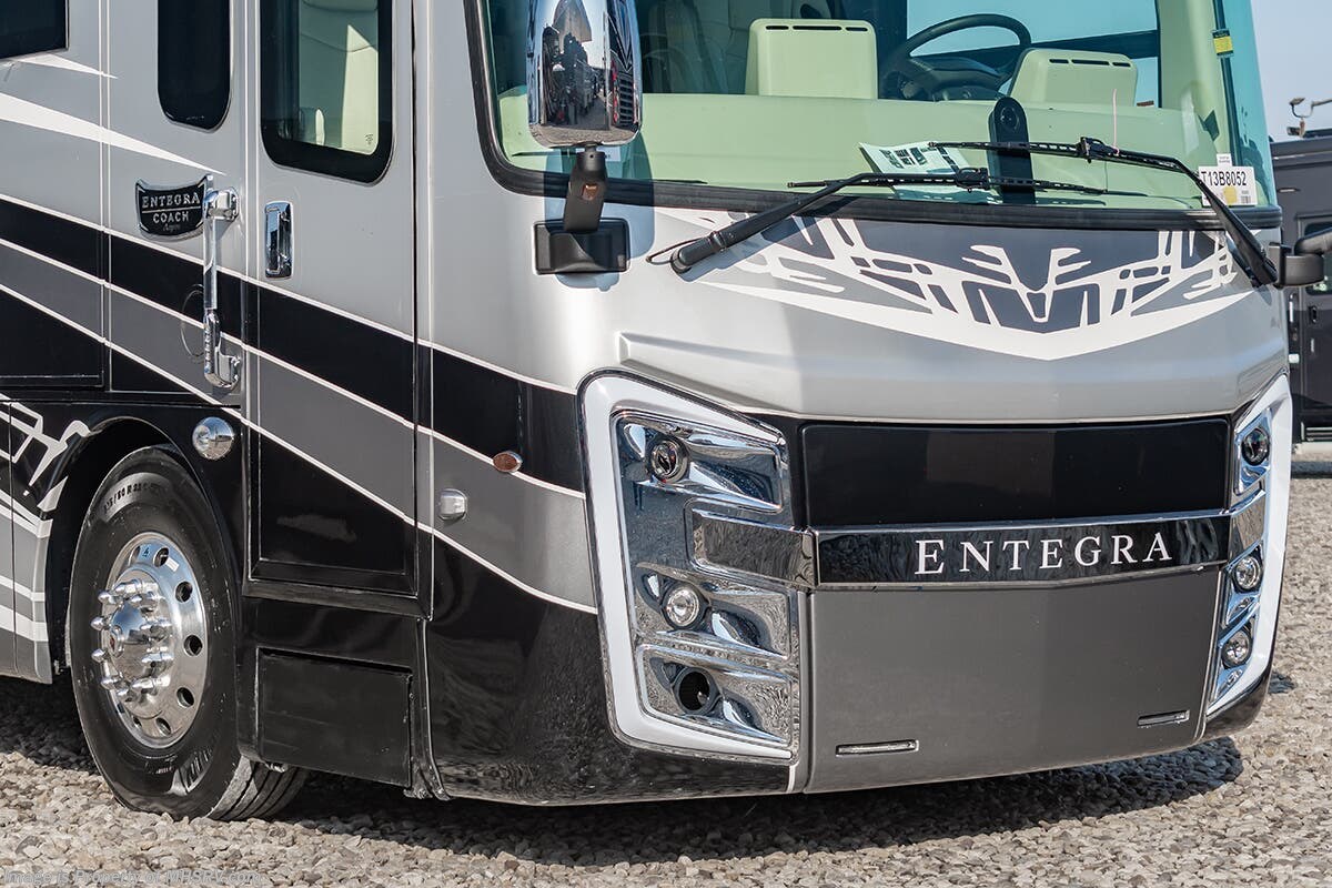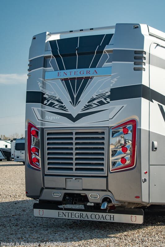 This luxury bath & 1/2 diesel motor coach measures approximately 44 feet 11 inches in length and is backed by Entegra Coach's superior 2-Year/24K Mile Limited Coach & 5-Year Limited Structural Warranties. New for 2026 on the Aspire is the larger square-shaped windows with wood framed valances and a leather accent, LED strip lighting in bed base and under the sofa/dinette cabinets, upgraded tile work in the entry well, GE convection microwave with air fryer and larger Samsung Smart TV in the bedroom. Some of the standard features that really set the Entegra Aspire apart include the Valid 15” high brightness digital dash with quad core graphics processor and on-board diagnostics, Ramco 360° HD digital camera system, Aqua-Hot® 400D hydronic water and heating system with in-floor heat throughout, power tilt & telescoping steering wheel, Aqua View Showermi$er with “GREEN” technology saves fresh water, day and night shades throughout, solid-surface countertops with LED accent lighting, Girard window awnings & slide-out toppers, stainless steel refrigerator, Induction cook top with matching wood cover, LED marker and turn lights, DEF fill door, power rear engine door with push button control, Firefly multiplex system with 10” VegaTouch touchscreen for complete integration of coach controls, a 10,000 Onan diesel generator, Victron MultiPlus II 120V 3000VA pure sine inverter system with 7" digital LED information system, water softener prep, (3) 15K BTU roof A/C units with heat pumps, heated floors, 50 amp power cord reel, power water hose reel, GPS navigation system, frameless dual pane & tinted windows, automatic hydraulic leveling system, central vacuum, LED TV in bedroom, automatic generator start, Splendide stack washer/dryer, removed carpet on all slide floors, 360 degree birds' eye view camera system, LED TV in cab and much more.