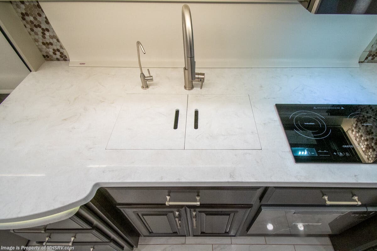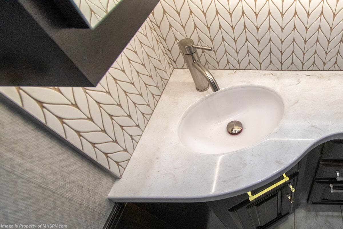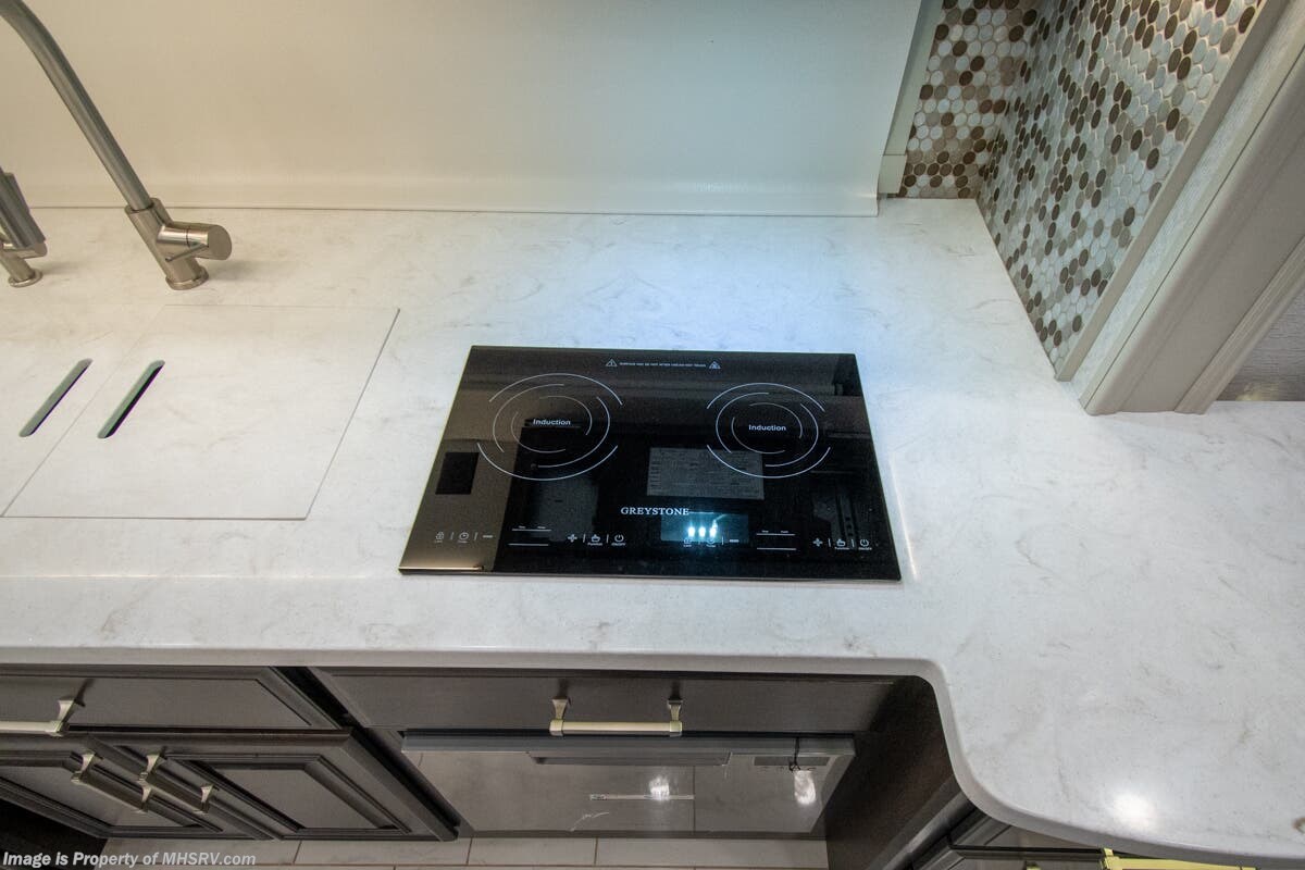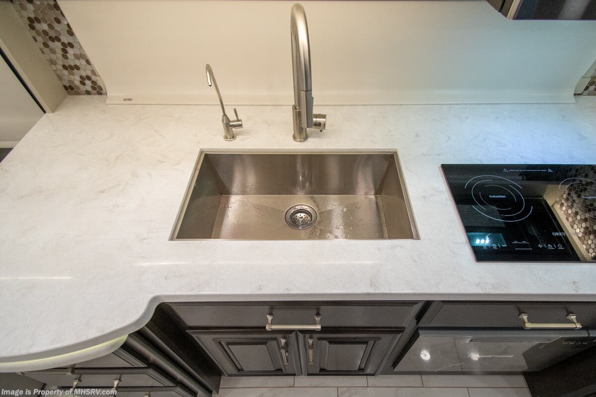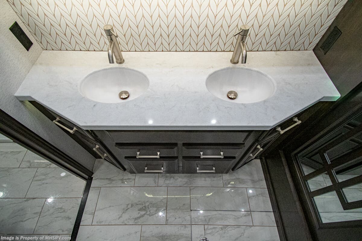 This luxury bath & 1/2 diesel motor coach measures approximately 44 feet 11 inches in length and is backed by Entegra Coach's superior 2-Year/24K Mile Limited Coach & 5-Year Limited Structural Warranties. New for 2026 on the Aspire is the larger square-shaped windows with wood framed valances and a leather accent, LED strip lighting in bed base and under the sofa/dinette cabinets, upgraded tile work in the entry well, GE convection microwave with air fryer and larger Samsung Smart TV in the bedroom. Some of the standard features that really set the Entegra Aspire apart include the Valid 15” high brightness digital dash with quad core graphics processor and on-board diagnostics, Ramco 360° HD digital camera system, Aqua-Hot® 400D hydronic water and heating system with in-floor heat throughout, power tilt & telescoping steering wheel, Aqua View Showermi$er with “GREEN” technology saves fresh water, day and night shades throughout, solid-surface countertops with LED accent lighting, Girard window awnings & slide-out toppers, stainless steel refrigerator, Induction cook top with matching wood cover, LED marker and turn lights, DEF fill door, power rear engine door with push button control, Firefly multiplex system with 10” VegaTouch touchscreen for complete integration of coach controls, a 10,000 Onan diesel generator, Victron MultiPlus II 120V 3000VA pure sine inverter system with 7" digital LED information system, water softener prep, (3) 15K BTU roof A/C units with heat pumps, heated floors, 50 amp power cord reel, power water hose reel, GPS navigation system, frameless dual pane & tinted windows, automatic hydraulic leveling system, central vacuum, LED TV in bedroom, automatic generator start, Splendide stack washer/dryer, removed carpet on all slide floors, 360 degree birds' eye view camera system, LED TV in cab and much more.