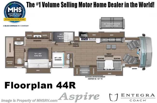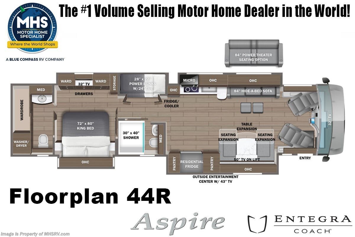 MSRP $739,313 All New 2026 Entegra Aspire Model 44R Bath & 1/2 Bunk Model rides on a Freightliner chassisand is powered by a Cummins® L9 turbocharged 450 HP engine with 1,250 lb.-ft. torque at 1,400 RPM and an Allison 3000 series transmission. This luxury bath & 1/2 bunk model diesel motor coach measures approximately 44 feet 11 inches in length and is backed by Entegra Coach's superior 2-Year/24K Mile Limited Coach & 5-Year Limited Structural Warranties. New for 2026 on the Aspire is the larger square-shaped windows with wood framed valances and a leather accent, LED strip lighting in bed base and under the sofa/dinette cabinets, upgraded tile work in the entry well, GE convection microwave with air fryer and larger Samsung Smart TV in the bedroom. Some of the standard features that really set the Entegra Aspire apart include the Valid 15” high brightness digital dash with quad core graphics processor and on-board diagnostics, Ramco 360° HD digital camera system, Aqua-Hot® 400D hydronic water and heating system with in-floor heat throughout, power tilt & telescoping steering wheel, Aqua View Showermi$er with “GREEN” technology saves fresh water, day and night shades throughout, solid-surface countertops with LED accent lighting, Girard window awnings & slide-out toppers, stainless steel refrigerator, Induction cook top with matching wood cover, LED marker and turn lights, DEF fill door, power rear engine door with push button control, Firefly multiplex system with 10” VegaTouch touchscreen for complete integration of coach controls, a 10,000 Onan diesel generator, Victron MultiPlus II 120V 3000VA pure sine inverter system with 7" digital LED information system, water softener prep, (3) 15K BTU roof A/C units with heat pumps, heated floors, 50 amp power cord reel, power water hose reel, GPS navigation system, frameless dual pane & tinted windows, automatic hydraulic leveling system, central vacuum, LED TV in bedroom, automatic generator start, Splendide stack washer/dryer, removed carpet on all slide floors, 360 degree birds' eye view camera system, LED TV in cab and much more.