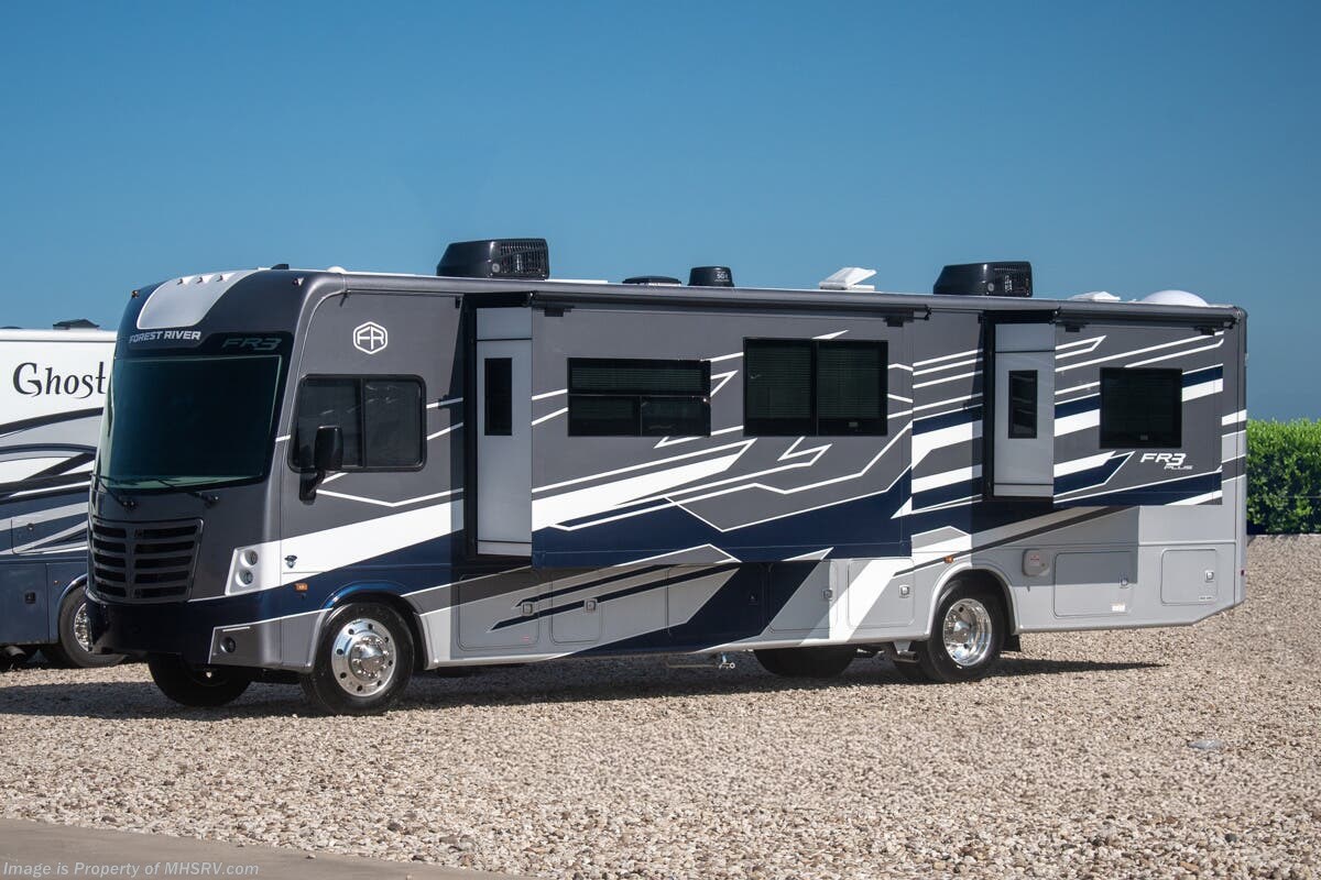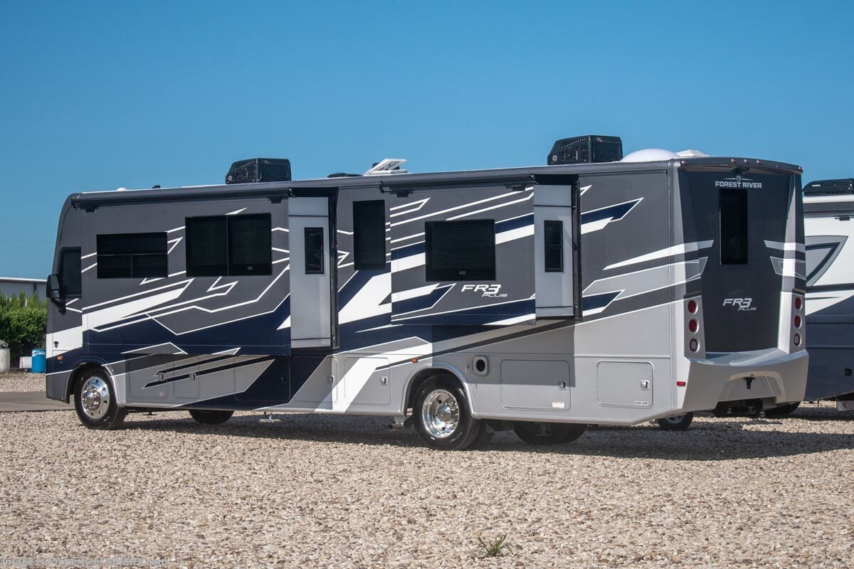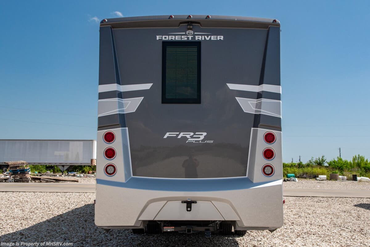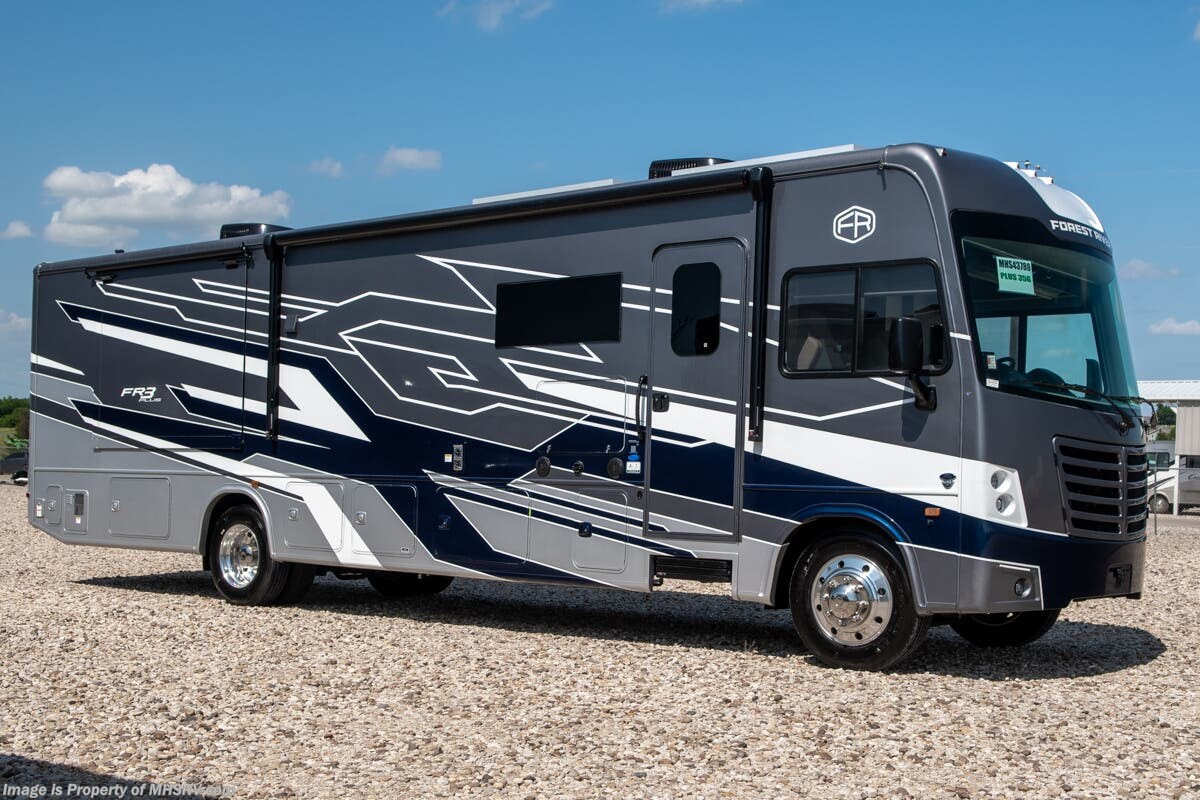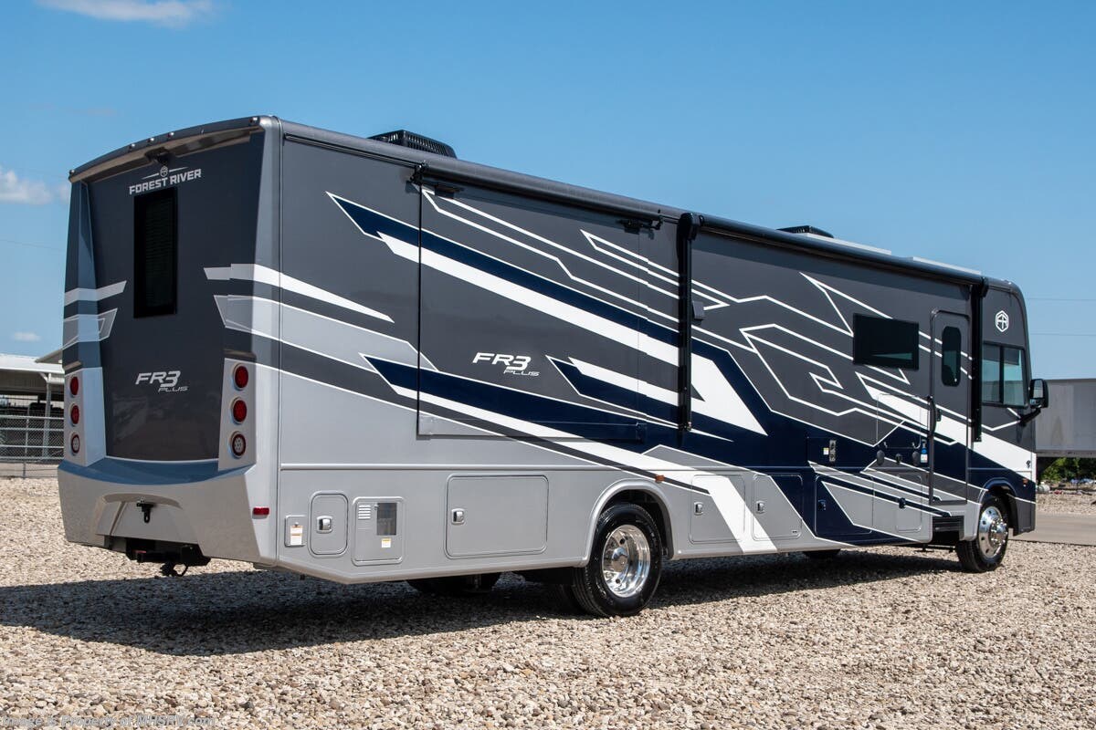 This RV measures approximately 37 feet 7 inches in length and features 3 slide outs, large living area, power loft bed, flip-up countertop and a king size bed. This beautiful new motorhome also features the new Ford chassis with 7.3L PFI V-8, a 6-speed TorqShift® automatic transmission. A few of the standard features the beautiful FR3 Plus boasts include slide room topper awnings, power patio awning with LED light strip, 4-point hydraulic leveling jacks, LED lighting throughout unit, power front sun shade, 6KW generator, 3 burner cook top with oven and flush mount stove cover, porcelain toilet, solid surface kitchen countertops, heated holding tanks and so much more.