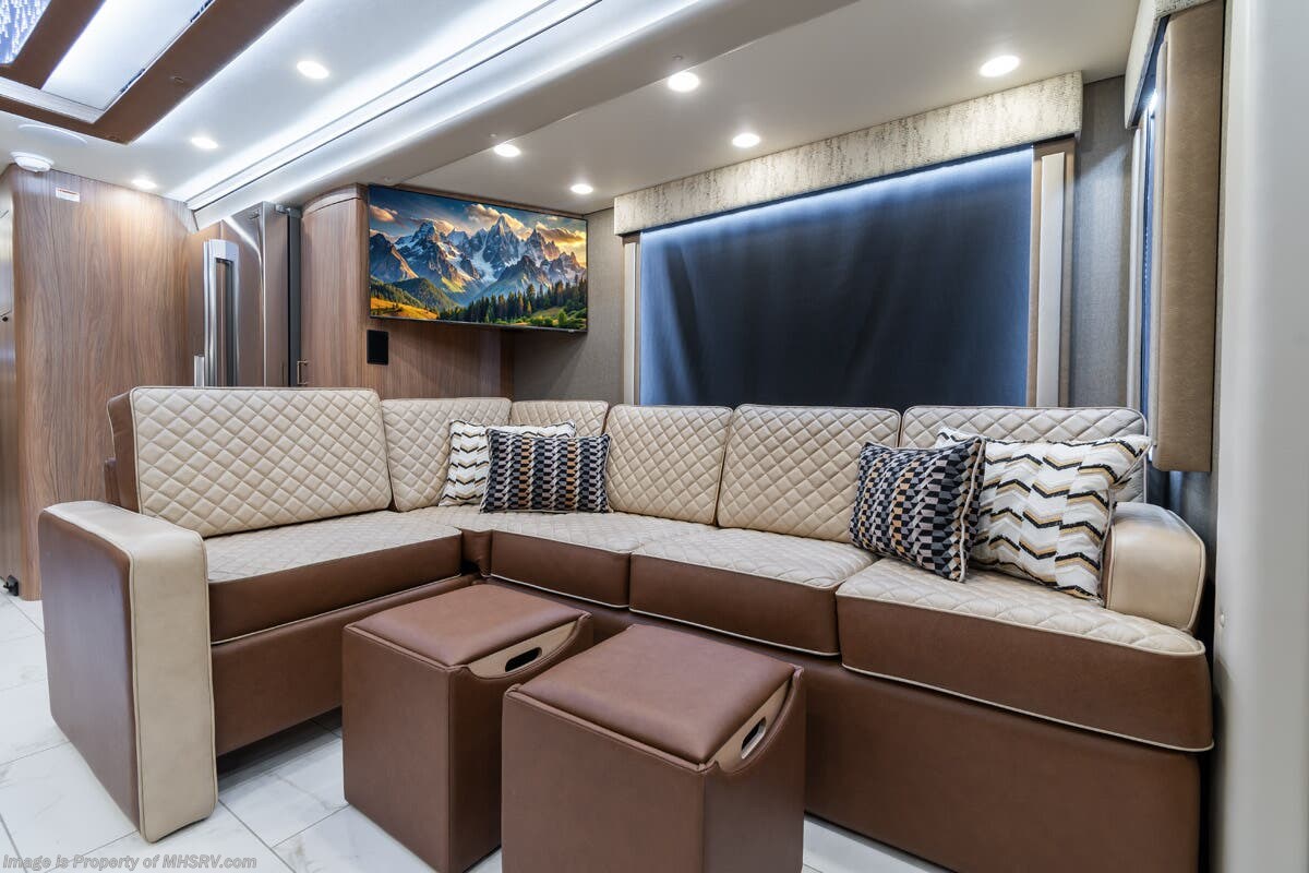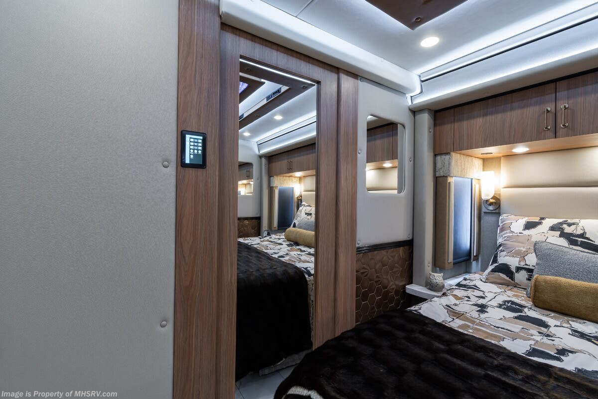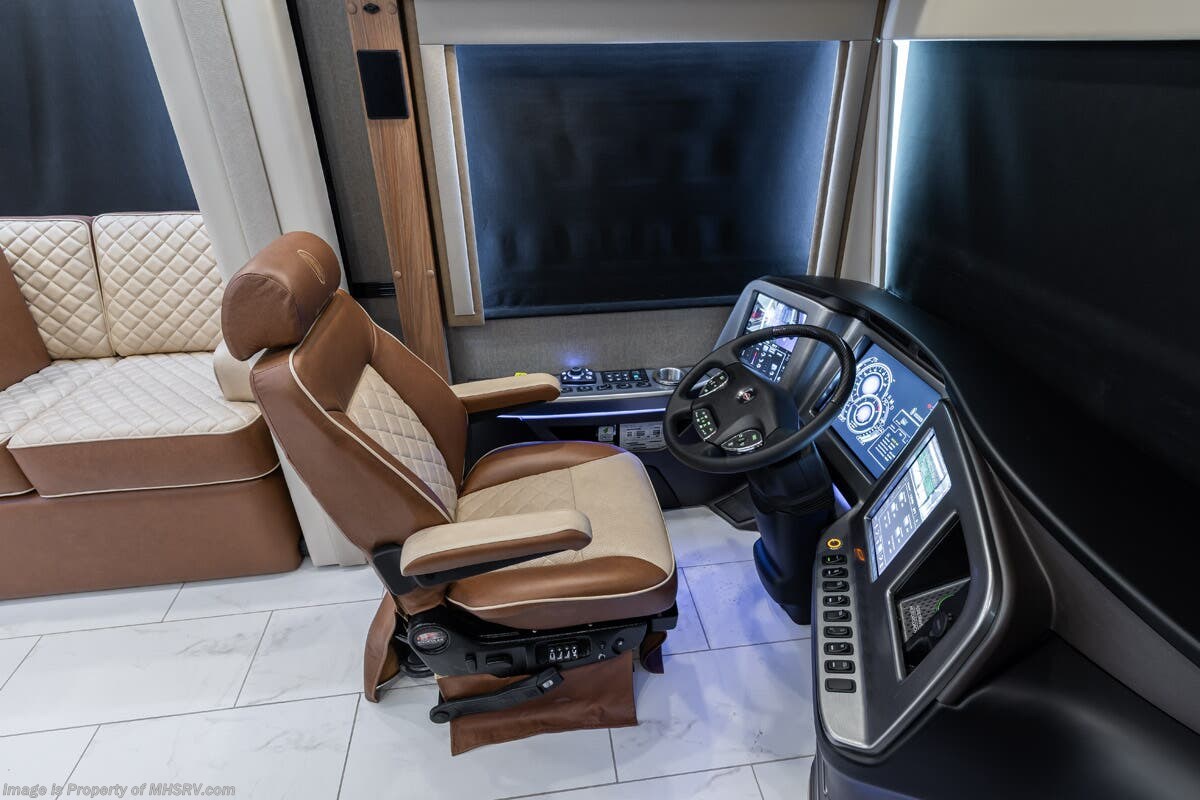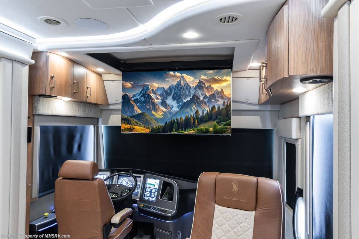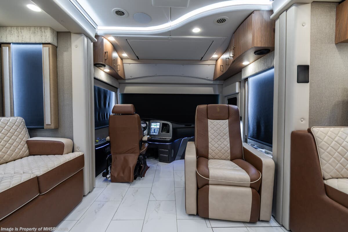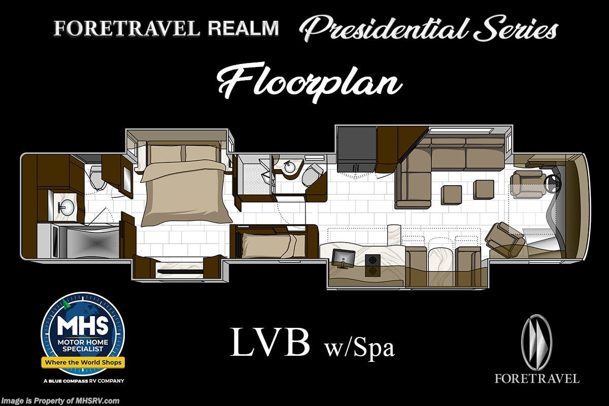 M.S.R.P. $1,778,430 - The 2026 Foretravel Realm Presidential takes the luxury motor coach market to all new heights and further propels the legacy of Foretravel. The Foretravel Realm stands alone as the finest motor coach of its kind available on the market today. It rides on Spartan's Premier K4 chassis, that is exclusive to Foretravel, offering incomparable ride, handling, and safety. This extraordinary motor coach is the Luxury Villa Bunk with Spa (LVB) floor plan with the all-new Sovereign interior décor package that is paired perfectly with the Imperial exterior paint scheme that can only be found on the Realm Presidential Series. Shop a huge selection of luxury diesel pusher motorhomes all at 1 location! Choose from American Coach Eagle – Dream – Entegra Coach Cornerstone – Anthem – Aspire – Fleetwood Palisade – Discovery LXE – Holiday Rambler Armada – Foretravel Realm – Foretravel Realm Presidential and more. We also buy and sell quality pre-owned models such Newmar King Aire – Essex – London Aire – Mountain Aire – Dutch Star - Tiffin Zephyr – Allegro Bus – Phaeton – Prevost Liberty Lady – Millennium - Marathon – Newell and much more. Visit MHSRV.com for our complete line-up and the sale prices that have made us the #1 volume selling motor home dealership in the world 12 years in a row! The LVB floor plan is also unlike that of any other luxury motor coach in the world, offering premier bunk accommodations and 2 full baths. The option that transforms this Realm into a Spa-like retreat is the ultra-high-end massaging tub in the master bath. The Kohler Archer® bath combines BubbleMassage™ and Bask® heated surface to create a soothing spa session. 120 air jets release thousands of heated air bubbles to cushion and massage your body allowing you to massage your back, midsection, and feet as well as control the intensity with 18 different levels. The tub is masterfully tiled and includes a large ledge and a flat-panel TV that is beautifully encased and angled downward for great visibility while using the tub or shower. You will also find a true flat floor design throughout the Realm Presidential Series including, not only Foretravel's premium flat floor slide-out rooms but also the bedroom to master bath transition. The Presidential Series also boasts a 600D Aqua Hot Hydronic Heating system. You will find the premier Valid digital dash with VDC control, along with the Valid air ride suspension, electronic suspension control with self-leveling feature, driver and passenger coach monitors, tire pressure sensors, beautiful full tile floors and back-splashes, ultra-high-end quartz counter tops throughout, premium brand refrigerator and convection microwave, LED accent lighting throughout, a beautiful curved entry way step, Executive entrance steps, a designer entry door with LED accent lighting, 4K QLED TVs where applicable, upgraded cab stereo and sub-woofer, heated and cooled leather pilot and co-pilot seats, recessed and upgraded ceiling features in the galley and bedroom, recessed cook top, an 8-camera system including 6 perimeter 360 Delta Mobile cameras for the ultimate in coach visibility, dual integrated power awnings, power entry door awning, exterior entertainment center, (2) electric sliding cargo trays, exterior freezer, full coach and multi-color LED ground effect lighting package, unmistakable full body paint exterior with Armor-Coat sprayed protection below windshield, chrome grill and accent package, (2) 3000 watt inverters, Gold Heat floor tile heating system, solar panel package, dishwasher drawer, 5.1 surround sound in living room and StarLink antenna. The Spartan K4 chassis is not only massive in stature but boasts a best-in-class Independent Front Suspension system, a passive steering rear tag axle for incomparable handling and maneuverability as well as the Performance Choice® anti-roll bar with selectable drive modes, and automatic traction control. You will know instantly, once behind the wheel of a Realm, that this chassis is truly a cut above all other luxury motor coach chassis. It is powered by a Cummins 605HP diesel. You will also find additional advanced safety features on a Realm like a fire suppression system for the engine, Tyron Bead-Lock wheel safety bands, and steel construction rather than aluminum found in the competition. You will also enjoy the ultimate in slide-out room fit and finish. These slides are undoubtedly head and shoulders above the competition. They feature pneumatic seals that provide a literal airtight seal completely around the entire slide-out room regardless of slide position for the premium in fit, finish, and function. They also feature a power drop-down flooring system that gives the Realm not only a flat-floor when extended, but a true flat-floor when retracted as well. (No uneven floor surfaces, damaging rollers, poorly sealed rubber gaskets, etc.) The Realm also features a flat floor bedroom to master bath transition. You won't find that in the competition; Nor will you find a *3-YEAR or 50K MILE SPARTAN NO-COST MAINTENANCE PLAN INCLUDED - (A Realm Exclusive) and a *2-YEAR or 24K MILE LIMITED WARRANTY. For more details contact Motor Home Specialist today. REALM, by definition, is a royal kingdom; a domain within which anything may occur, prevail, or dominate. The Realm of Dreams is here and available at Motor Home Specialist, the #1 Volume Selling Motor Home Dealership in the World. Visit MHSRV.com or call 800-335-6054 for complete details, photos, videos, brochures, and more. The Foretravel Realm Presidential Series... Your Kingdom Awaits.