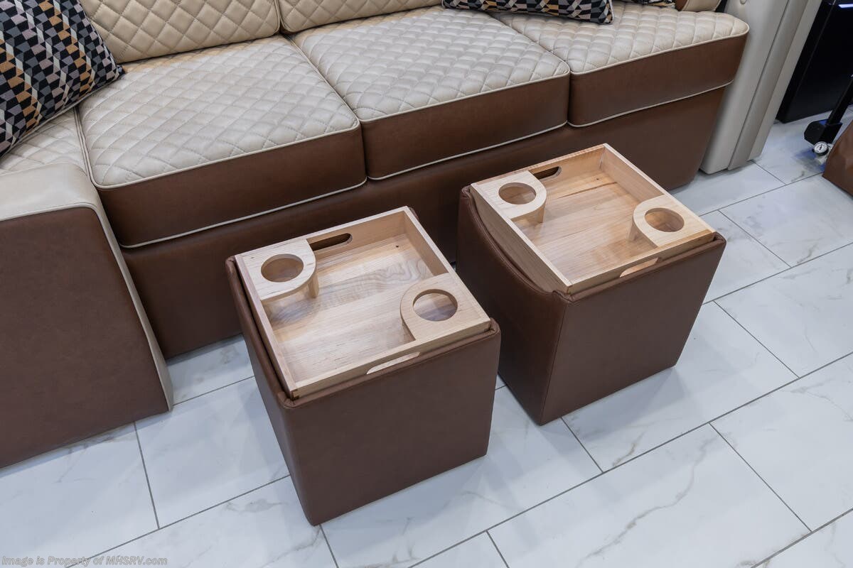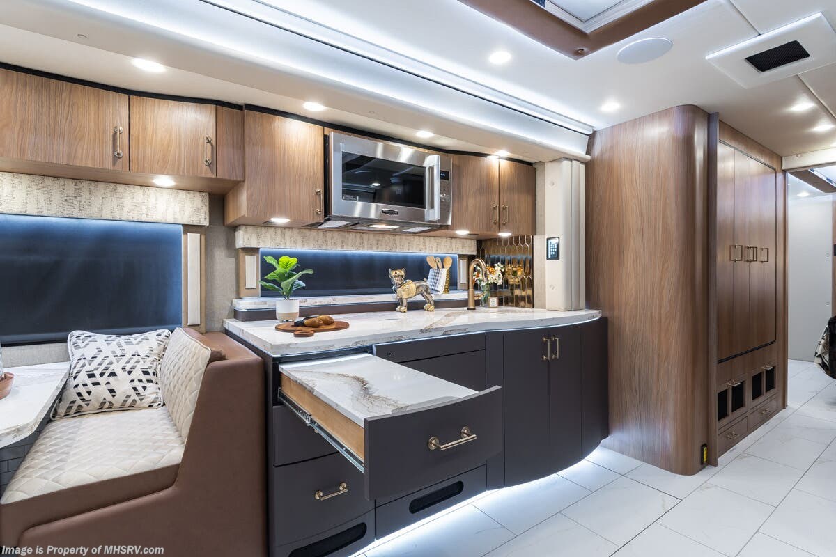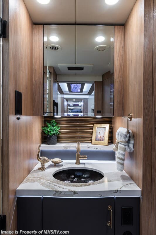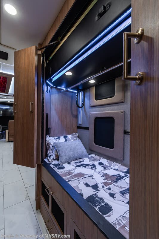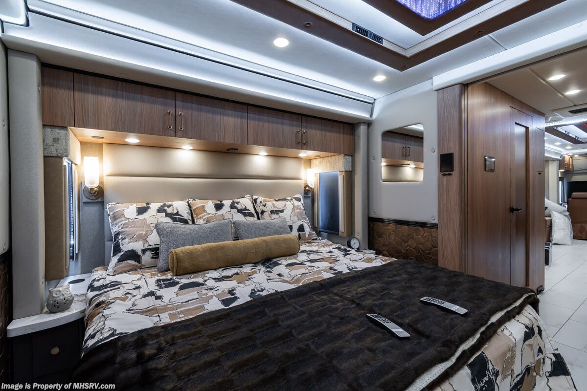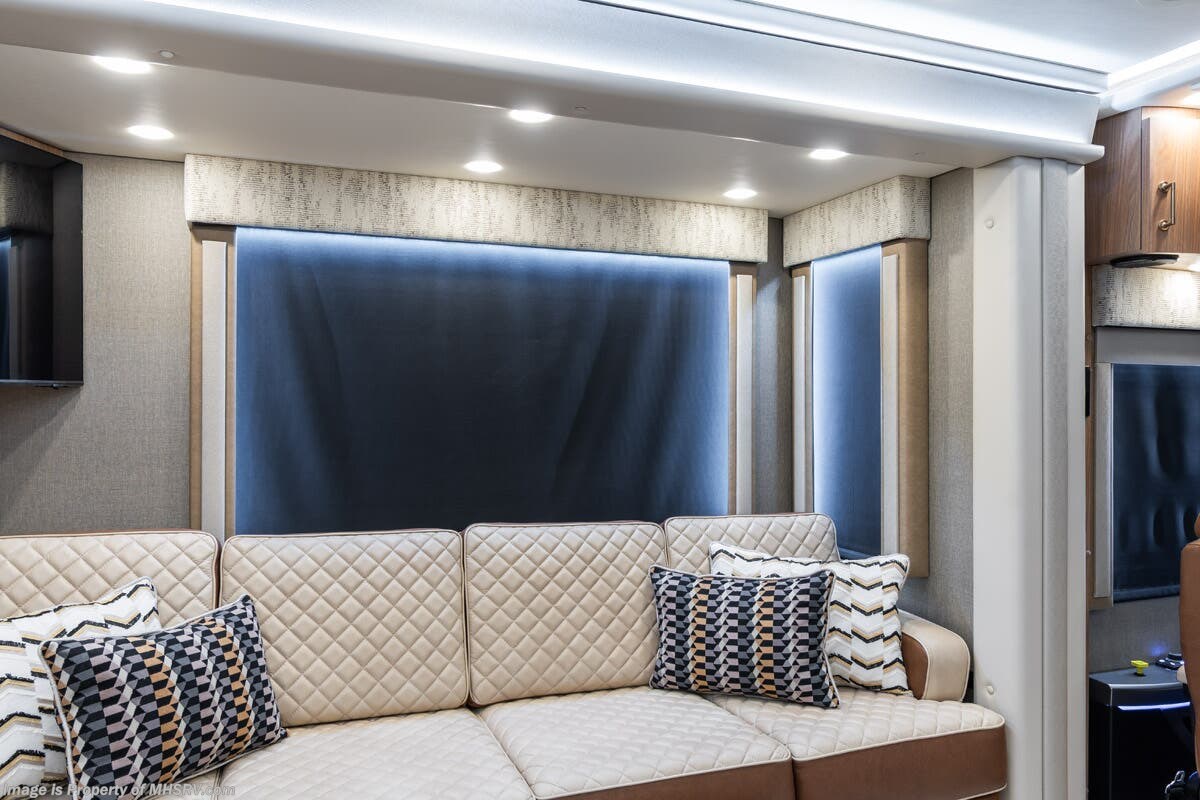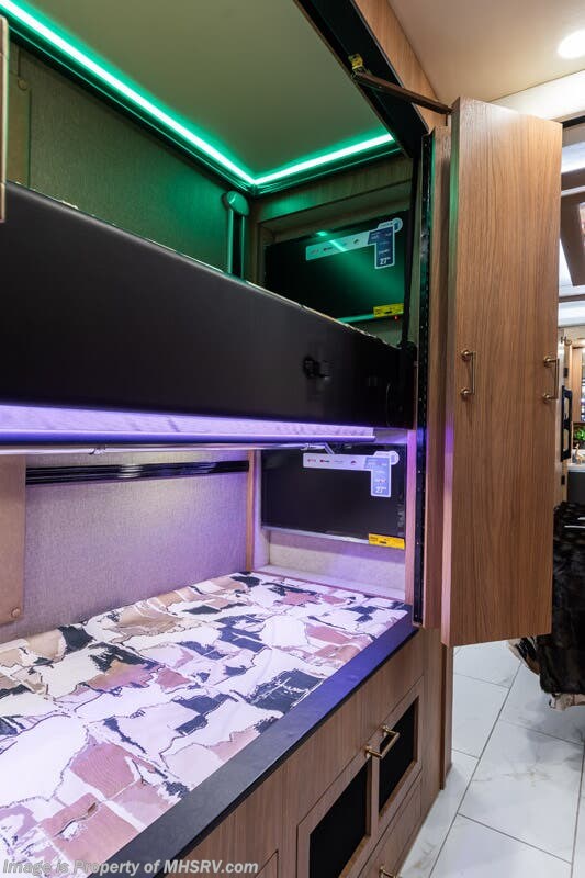 M.S.R.P. $1,778,430 - The 2026 Foretravel Realm Presidential takes the luxury motor coach market to all new heights and further propels the legacy of Foretravel. The Foretravel Realm stands alone as the finest motor coach of its kind available on the market today. It rides on Spartan's Premier K4 chassis, that is exclusive to Foretravel, offering incomparable ride, handling, and safety. This extraordinary motor coach is the Luxury Villa Bunk with Spa (LVB) floor plan with the all-new Sovereign interior décor package that is paired perfectly with the Imperial exterior paint scheme that can only be found on the Realm Presidential Series. Shop a huge selection of luxury diesel pusher motorhomes all at 1 location! Choose from American Coach Eagle – Dream – Entegra Coach Cornerstone – Anthem – Aspire – Fleetwood Palisade – Discovery LXE – Holiday Rambler Armada – Foretravel Realm – Foretravel Realm Presidential and more. We also buy and sell quality pre-owned models such Newmar King Aire – Essex – London Aire – Mountain Aire – Dutch Star - Tiffin Zephyr – Allegro Bus – Phaeton – Prevost Liberty Lady – Millennium - Marathon – Newell and much more. Visit MHSRV.com for our complete line-up and the sale prices that have made us the #1 volume selling motor home dealership in the world 12 years in a row! The LVB floor plan is also unlike that of any other luxury motor coach in the world, offering premier bunk accommodations and 2 full baths. The option that transforms this Realm into a Spa-like retreat is the ultra-high-end massaging tub in the master bath. The Kohler Archer® bath combines BubbleMassage™ and Bask® heated surface to create a soothing spa session. 120 air jets release thousands of heated air bubbles to cushion and massage your body allowing you to massage your back, midsection, and feet as well as control the intensity with 18 different levels. The tub is masterfully tiled and includes a large ledge and a flat-panel TV that is beautifully encased and angled downward for great visibility while using the tub or shower. You will also find a true flat floor design throughout the Realm Presidential Series including, not only Foretravel's premium flat floor slide-out rooms but also the bedroom to master bath transition. The Presidential Series also boasts a 600D Aqua Hot Hydronic Heating system. You will find the premier Valid digital dash with VDC control, along with the Valid air ride suspension, electronic suspension control with self-leveling feature, driver and passenger coach monitors, tire pressure sensors, beautiful full tile floors and back-splashes, ultra-high-end quartz counter tops throughout, premium brand refrigerator and convection microwave, LED accent lighting throughout, a beautiful curved entry way step, Executive entrance steps, a designer entry door with LED accent lighting, 4K QLED TVs where applicable, upgraded cab stereo and sub-woofer, heated and cooled leather pilot and co-pilot seats, recessed and upgraded ceiling features in the galley and bedroom, recessed cook top, an 8-camera system including 6 perimeter 360 Delta Mobile cameras for the ultimate in coach visibility, dual integrated power awnings, power entry door awning, exterior entertainment center, (2) electric sliding cargo trays, exterior freezer, full coach and multi-color LED ground effect lighting package, unmistakable full body paint exterior with Armor-Coat sprayed protection below windshield, chrome grill and accent package, (2) 3000 watt inverters, Gold Heat floor tile heating system, solar panel package, dishwasher drawer, 5.1 surround sound in living room and StarLink antenna. The Spartan K4 chassis is not only massive in stature but boasts a best-in-class Independent Front Suspension system, a passive steering rear tag axle for incomparable handling and maneuverability as well as the Performance Choice® anti-roll bar with selectable drive modes, and automatic traction control. You will know instantly, once behind the wheel of a Realm, that this chassis is truly a cut above all other luxury motor coach chassis. It is powered by a Cummins 605HP diesel. You will also find additional advanced safety features on a Realm like a fire suppression system for the engine, Tyron Bead-Lock wheel safety bands, and steel construction rather than aluminum found in the competition. You will also enjoy the ultimate in slide-out room fit and finish. These slides are undoubtedly head and shoulders above the competition. They feature pneumatic seals that provide a literal airtight seal completely around the entire slide-out room regardless of slide position for the premium in fit, finish, and function. They also feature a power drop-down flooring system that gives the Realm not only a flat-floor when extended, but a true flat-floor when retracted as well. (No uneven floor surfaces, damaging rollers, poorly sealed rubber gaskets, etc.) The Realm also features a flat floor bedroom to master bath transition. You won't find that in the competition; Nor will you find a *3-YEAR or 50K MILE SPARTAN NO-COST MAINTENANCE PLAN INCLUDED - (A Realm Exclusive) and a *2-YEAR or 24K MILE LIMITED WARRANTY. For more details contact Motor Home Specialist today. REALM, by definition, is a royal kingdom; a domain within which anything may occur, prevail, or dominate. The Realm of Dreams is here and available at Motor Home Specialist, the #1 Volume Selling Motor Home Dealership in the World. Visit MHSRV.com or call 800-335-6054 for complete details, photos, videos, brochures, and more. The Foretravel Realm Presidential Series... Your Kingdom Awaits.
