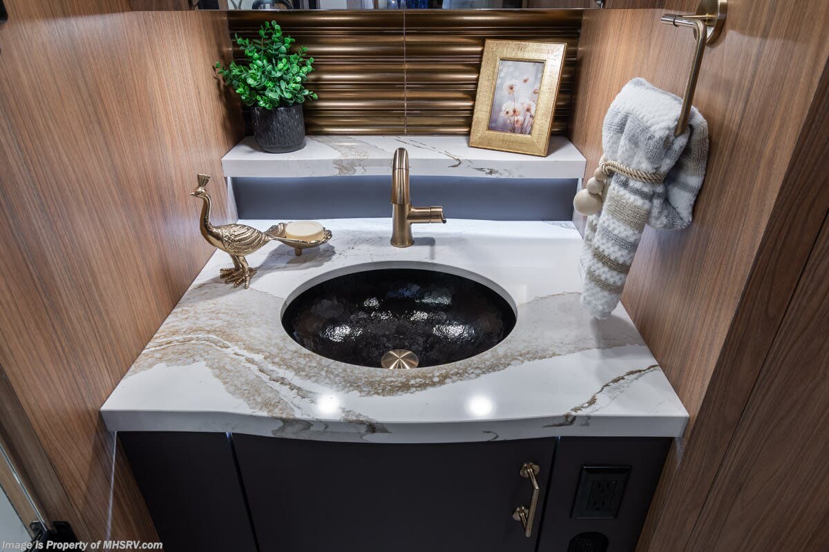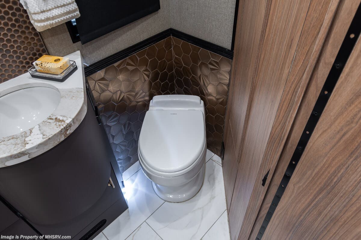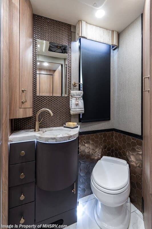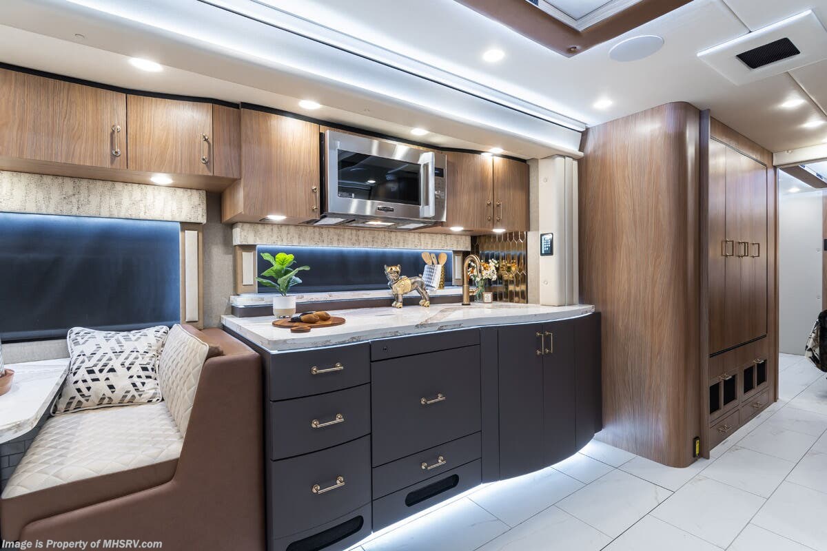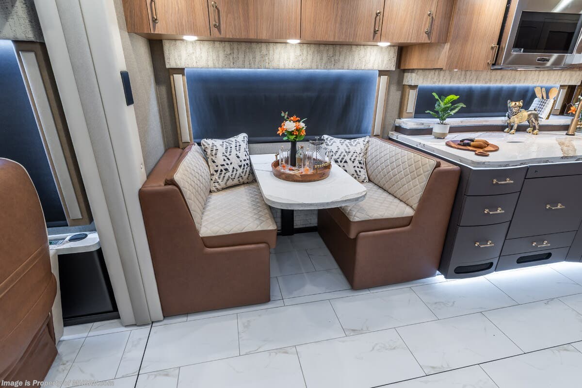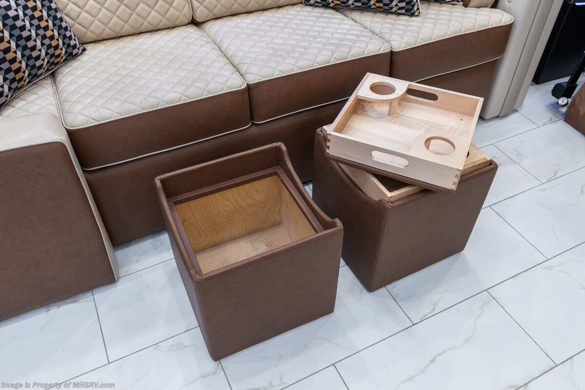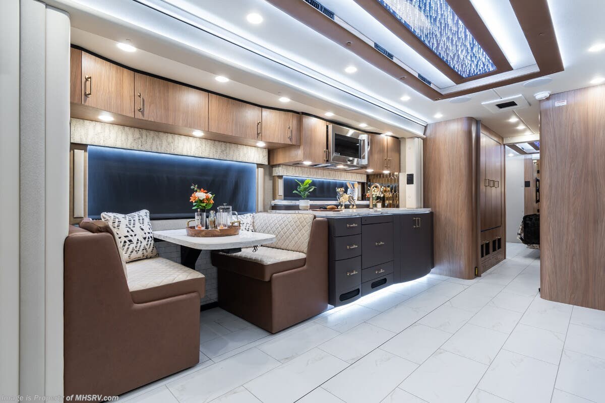 M.S.R.P. $1,778,430 - The 2026 Foretravel Realm Presidential takes the luxury motor coach market to all new heights and further propels the legacy of Foretravel. The Foretravel Realm stands alone as the finest motor coach of its kind available on the market today. It rides on Spartan's Premier K4 chassis, that is exclusive to Foretravel, offering incomparable ride, handling, and safety. This extraordinary motor coach is the Luxury Villa Bunk with Spa (LVB) floor plan with the all-new Sovereign interior décor package that is paired perfectly with the Imperial exterior paint scheme that can only be found on the Realm Presidential Series. Shop a huge selection of luxury diesel pusher motorhomes all at 1 location! Choose from American Coach Eagle – Dream – Entegra Coach Cornerstone – Anthem – Aspire – Fleetwood Palisade – Discovery LXE – Holiday Rambler Armada – Foretravel Realm – Foretravel Realm Presidential and more. We also buy and sell quality pre-owned models such Newmar King Aire – Essex – London Aire – Mountain Aire – Dutch Star - Tiffin Zephyr – Allegro Bus – Phaeton – Prevost Liberty Lady – Millennium - Marathon – Newell and much more. Visit MHSRV.com for our complete line-up and the sale prices that have made us the #1 volume selling motor home dealership in the world 12 years in a row! The LVB floor plan is also unlike that of any other luxury motor coach in the world, offering premier bunk accommodations and 2 full baths. The option that transforms this Realm into a Spa-like retreat is the ultra-high-end massaging tub in the master bath. The Kohler Archer® bath combines BubbleMassage™ and Bask® heated surface to create a soothing spa session. 120 air jets release thousands of heated air bubbles to cushion and massage your body allowing you to massage your back, midsection, and feet as well as control the intensity with 18 different levels. The tub is masterfully tiled and includes a large ledge and a flat-panel TV that is beautifully encased and angled downward for great visibility while using the tub or shower. You will also find a true flat floor design throughout the Realm Presidential Series including, not only Foretravel's premium flat floor slide-out rooms but also the bedroom to master bath transition. The Presidential Series also boasts a 600D Aqua Hot Hydronic Heating system. You will find the premier Valid digital dash with VDC control, along with the Valid air ride suspension, electronic suspension control with self-leveling feature, driver and passenger coach monitors, tire pressure sensors, beautiful full tile floors and back-splashes, ultra-high-end quartz counter tops throughout, premium brand refrigerator and convection microwave, LED accent lighting throughout, a beautiful curved entry way step, Executive entrance steps, a designer entry door with LED accent lighting, 4K QLED TVs where applicable, upgraded cab stereo and sub-woofer, heated and cooled leather pilot and co-pilot seats, recessed and upgraded ceiling features in the galley and bedroom, recessed cook top, an 8-camera system including 6 perimeter 360 Delta Mobile cameras for the ultimate in coach visibility, dual integrated power awnings, power entry door awning, exterior entertainment center, (2) electric sliding cargo trays, exterior freezer, full coach and multi-color LED ground effect lighting package, unmistakable full body paint exterior with Armor-Coat sprayed protection below windshield, chrome grill and accent package, (2) 3000 watt inverters, Gold Heat floor tile heating system, solar panel package, dishwasher drawer, 5.1 surround sound in living room and StarLink antenna. The Spartan K4 chassis is not only massive in stature but boasts a best-in-class Independent Front Suspension system, a passive steering rear tag axle for incomparable handling and maneuverability as well as the Performance Choice® anti-roll bar with selectable drive modes, and automatic traction control. You will know instantly, once behind the wheel of a Realm, that this chassis is truly a cut above all other luxury motor coach chassis. It is powered by a Cummins 605HP diesel. You will also find additional advanced safety features on a Realm like a fire suppression system for the engine, Tyron Bead-Lock wheel safety bands, and steel construction rather than aluminum found in the competition. You will also enjoy the ultimate in slide-out room fit and finish. These slides are undoubtedly head and shoulders above the competition. They feature pneumatic seals that provide a literal airtight seal completely around the entire slide-out room regardless of slide position for the premium in fit, finish, and function. They also feature a power drop-down flooring system that gives the Realm not only a flat-floor when extended, but a true flat-floor when retracted as well. (No uneven floor surfaces, damaging rollers, poorly sealed rubber gaskets, etc.) The Realm also features a flat floor bedroom to master bath transition. You won't find that in the competition; Nor will you find a *3-YEAR or 50K MILE SPARTAN NO-COST MAINTENANCE PLAN INCLUDED - (A Realm Exclusive) and a *2-YEAR or 24K MILE LIMITED WARRANTY. For more details contact Motor Home Specialist today. REALM, by definition, is a royal kingdom; a domain within which anything may occur, prevail, or dominate. The Realm of Dreams is here and available at Motor Home Specialist, the #1 Volume Selling Motor Home Dealership in the World. Visit MHSRV.com or call 800-335-6054 for complete details, photos, videos, brochures, and more. The Foretravel Realm Presidential Series... Your Kingdom Awaits.