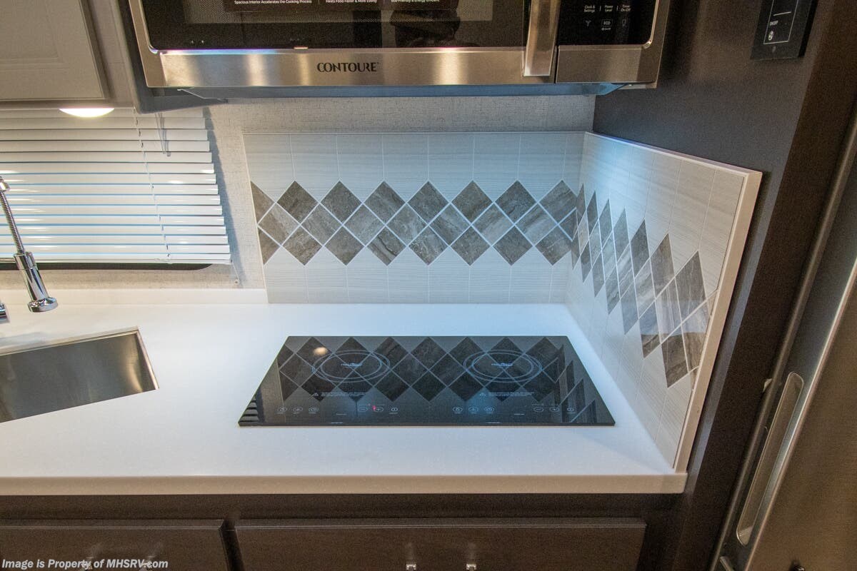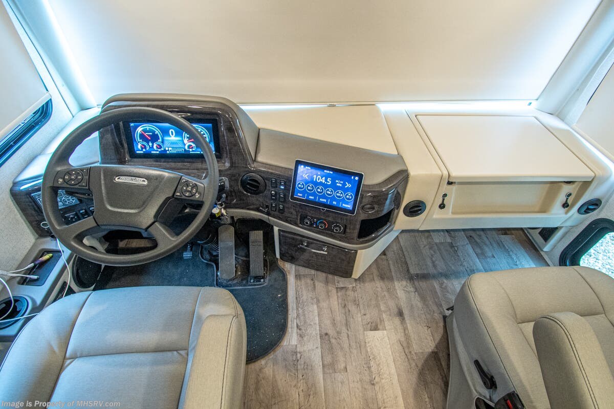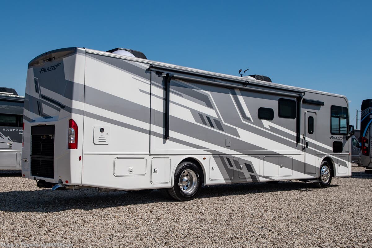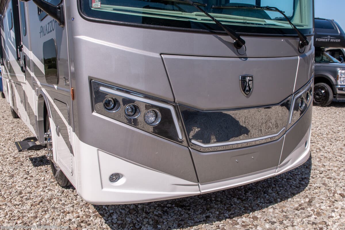This RV features a power drop down loft, double sink and a large bathroom, 340 HP Cummins diesel engine with 700 lbs. of torque and a Freightliner XC chassis. Standard features include induction cooktop, touchscreen multiplex control system with smartphone app, Winegard ConnecT 2.0 4G/Wi-Fi system, 360 Siphon Vent cap and outside shower. The Palazzo also features a power patio awning with integrated LED lighting, invisible front paint protection & front electric drop-down overhead loft, diesel generator, solid surface counters, power driver's seat, inverter, residential refrigerator, solid surface countertops, (2) ducted roof A/C units, 3-camera monitoring system, one piece windshield, fiberglass storage compartments, fully automatic hydraulic leveling system, automatic entry step and much more.