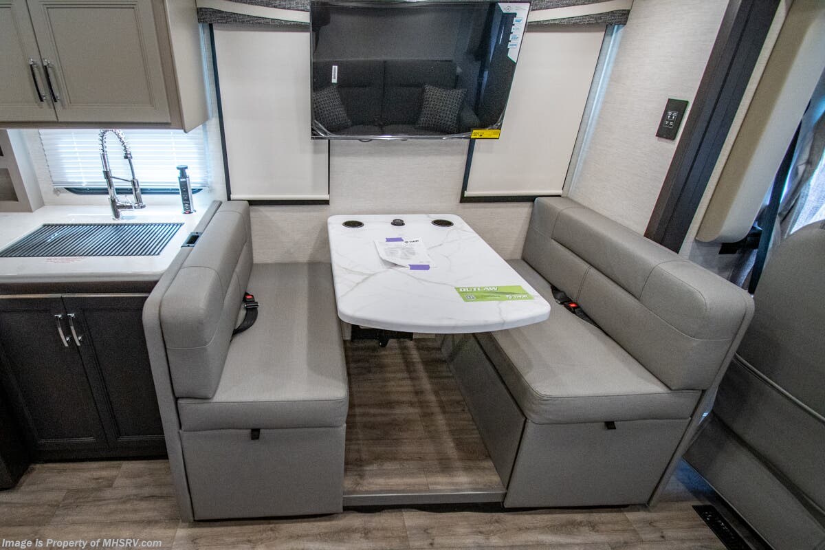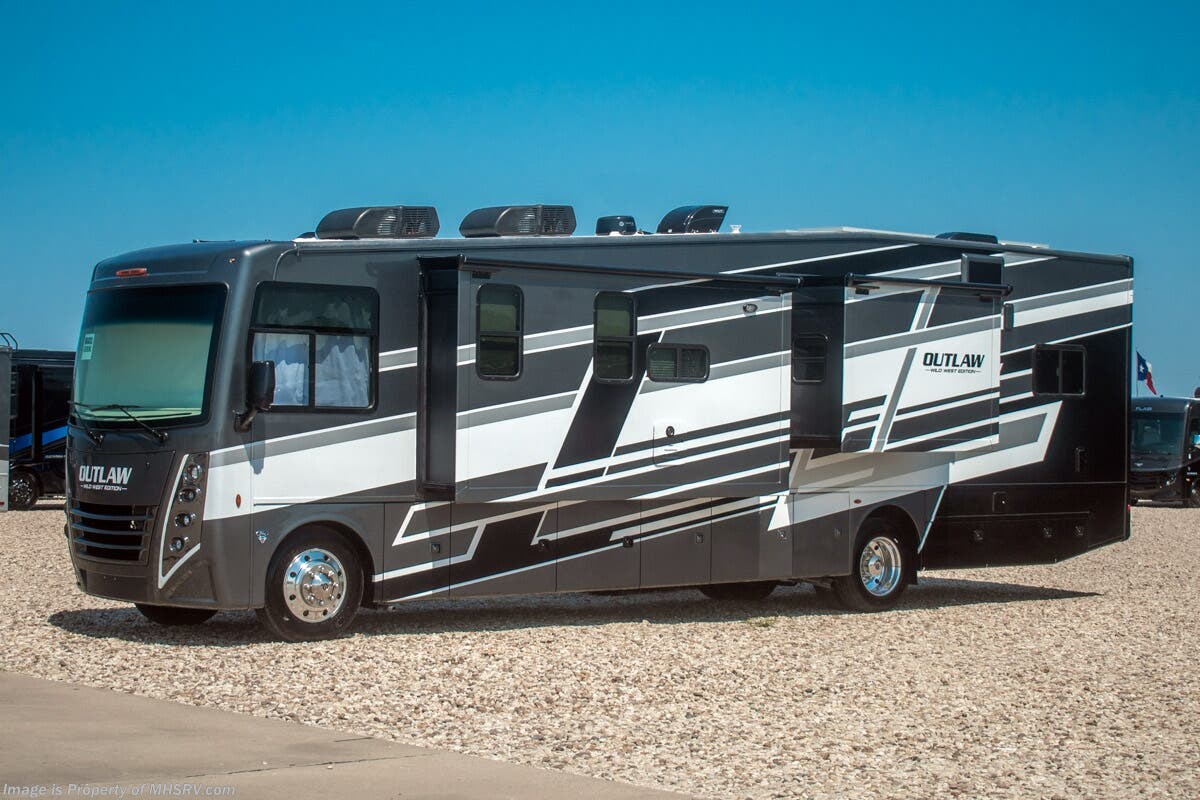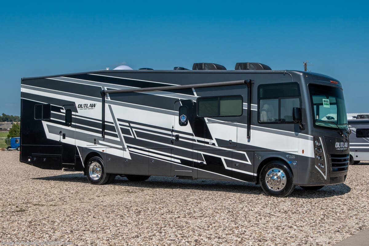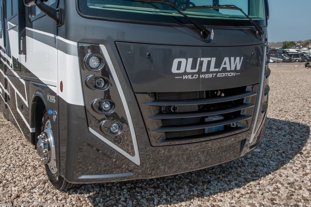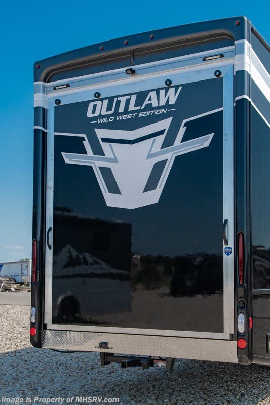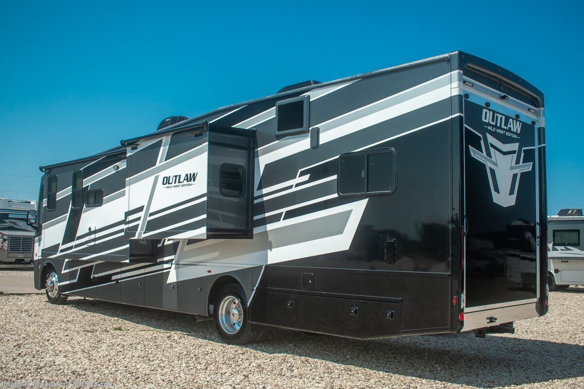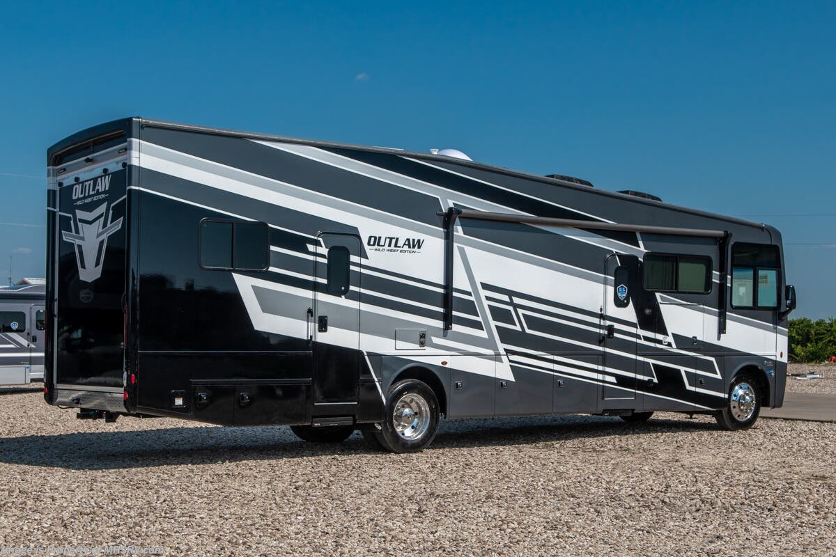 This RV is approximately 39 feet 10 inches in length with 2 slide-out rooms, high polished aluminum wheels, residential refrigerator, bug screens at rear in the garage, roller shades on the driver & passenger windows, as well as drop down ramp door with spring assist & railing for patio use. This beautiful new motorhome also features the new Ford chassis with 7.3L PFI V-8, a 6-speed TorqShift® automatic transmission, an updated instrument cluster, automatic headlights and a tilt/telescoping steering wheel. The Outlaw Wild West toy hauler RV has an incredible list of standard features including beautiful wood & interior decor packages, LED TVs, (2) A/C units, power patio awing with integrated LED lighting, dual side entrance doors, 1-piece windshield, a 5500 Onan generator, 3 camera monitoring system, automatic leveling system, Soft Touch leather furniture and day/night shades.