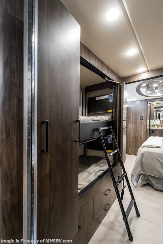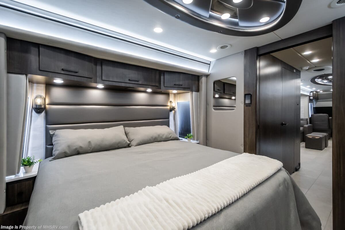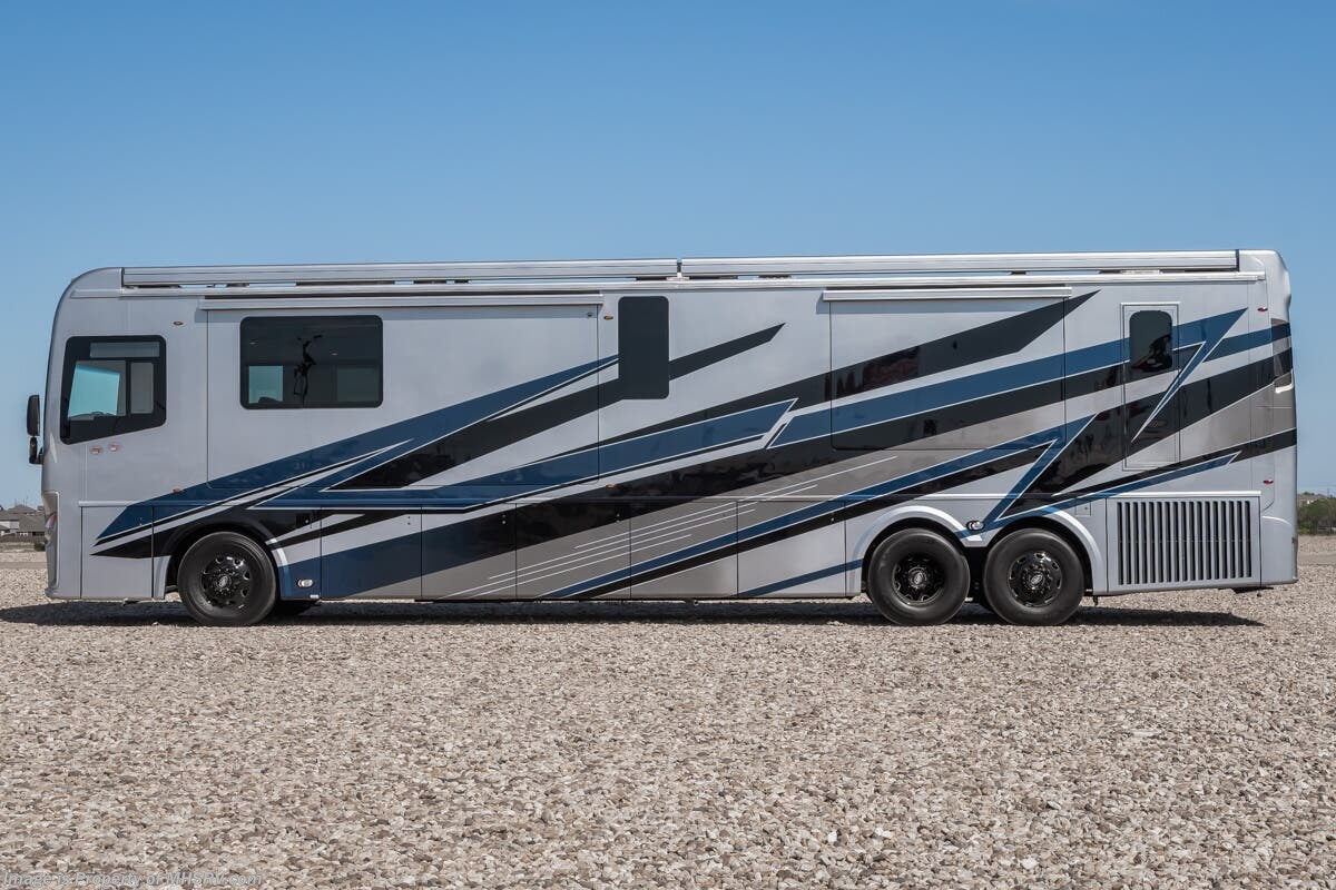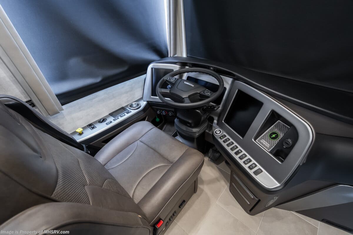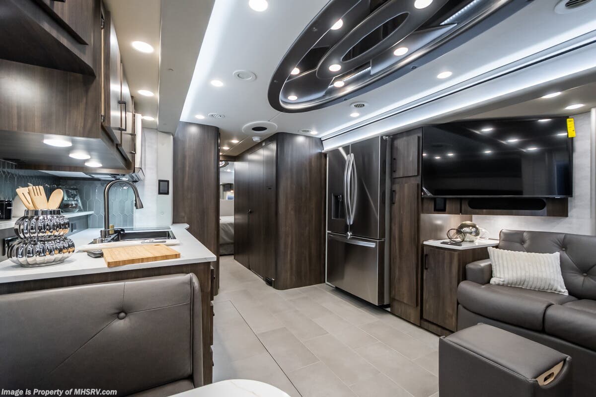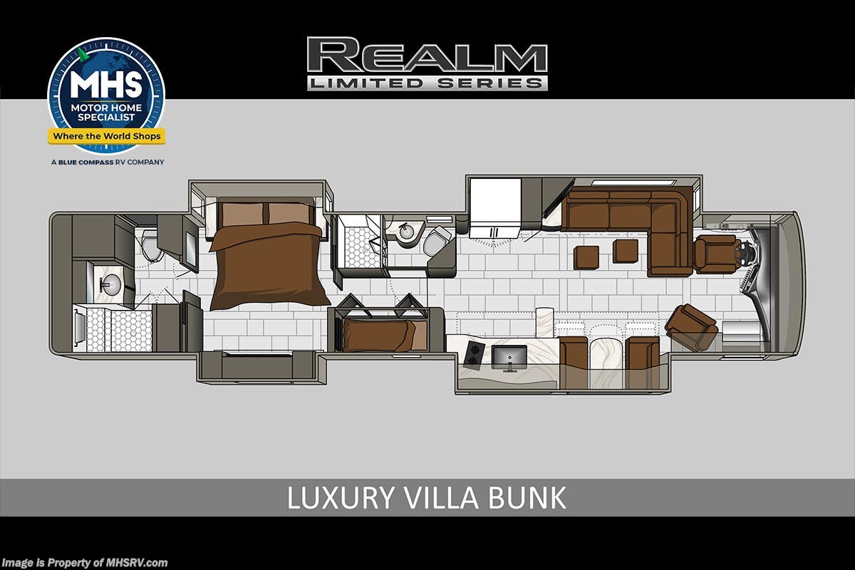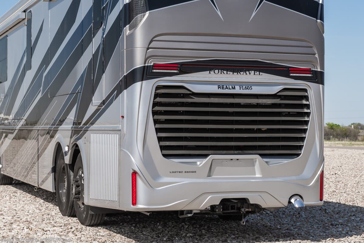 M.S.R.P. $1,428,180. The 2027 Foretravel Realm FL605 is, not only, the premium luxury Motor-Coach on the market today, but the only coach in the industry built on a Freightliner TravelRide IV-SL chassis offering incomparable ride, handling, and safety. This extraordinary motor coach is boasting the extraordinary Apex interior décor. The interior of the coach is paired perfectly with the Ares exterior paint scheme. You will also find a multi-function digital dash and instrumentation display system, the Premier Steer adjustable driver's assist system, a Navigation system with in-dash and additional passenger side monitor, Total Coach Monitoring System, tire pressure sensors, beautiful tile floors and back-splashes, quartz counter tops throughout, ultra-high-end appliances, LED accent lighting throughout, a beautiful curved step entry way, Braun extra heavy duty power entrance step, a designer entry door with LED accent lighting, iPad launch system, 4K TVs where applicable, upgraded cab stereo and sub-woofer, heated and cooled pilot and co-pilot seats, recessed and upgraded ceiling features in the galley, recessed cook top, Mobile Eye Collision Avoidance System, a "Bird's Eye View" camera system for the ultimate in coach visibility along with an additional 3-camera coach monitoring system with power rear camera, dual integrated power awnings, power entry door awning, exterior entertainment center, (2) electric sliding cargo trays, exterior freezer, chrome grill and accent package, (1) 3000W inverter, electric floor heat and (2) solar panels. You will know instantly, once behind the wheel of a Realm FS6, that this chassis is truly a cut above all other luxury motor coach chassis. It is powered by a Cummins X15 605HP diesel. You will also enjoy the ultimate in slide-out room fit and finish. These slides are undoubtedly head and shoulders above the competition. They feature pneumatic seals that provide a literal airtight seal completely around the entire slide-out room regardless of slide position for the premium in fit, finish, and function. For more details contact Motor Home Specialist today. - Realm, by definition, is a royal kingdom; a domain within which anything may occur, prevail or dominate. The Realm of Dreams is here and available exclusively at Motor Home Specialist, the #1 Volume Selling Motor Home Dealership in the World. Visit MHSRV.com or call 800-335-6054 for complete details, photos, videos, brochures, and more. The Foretravel Realm FS6... Your Kingdom Awaits.