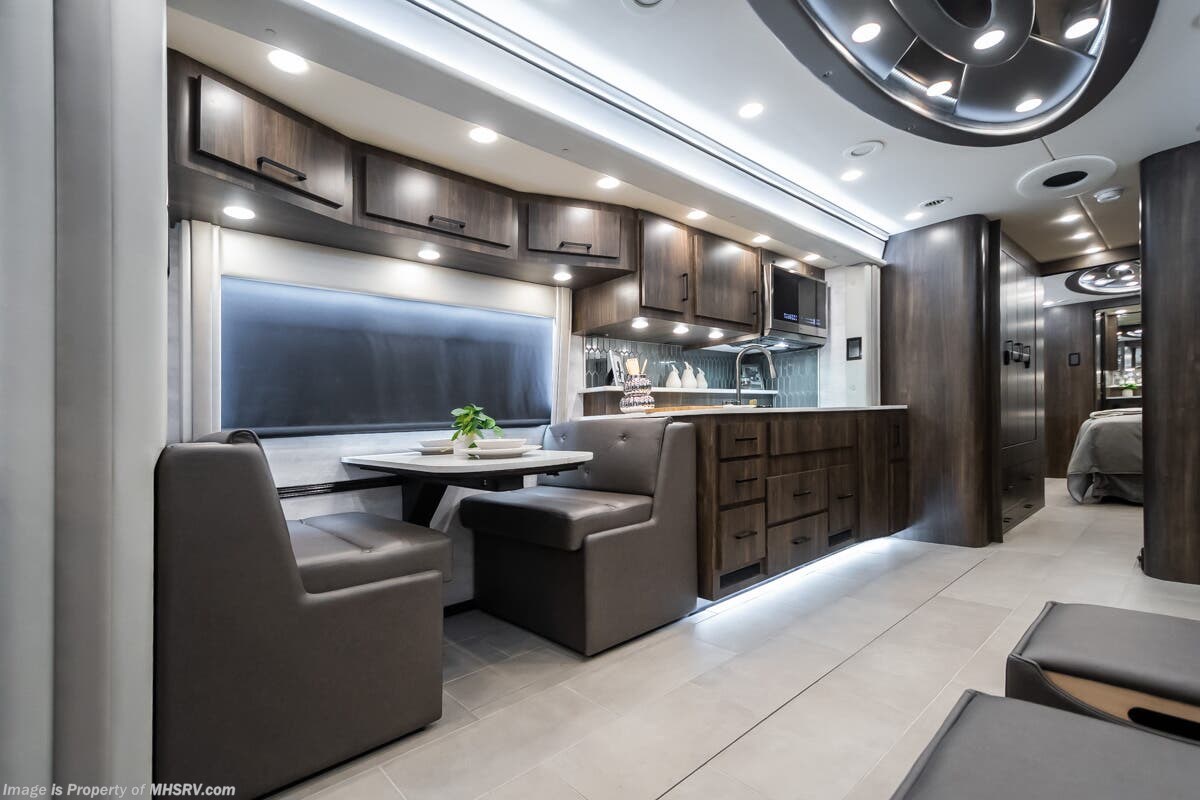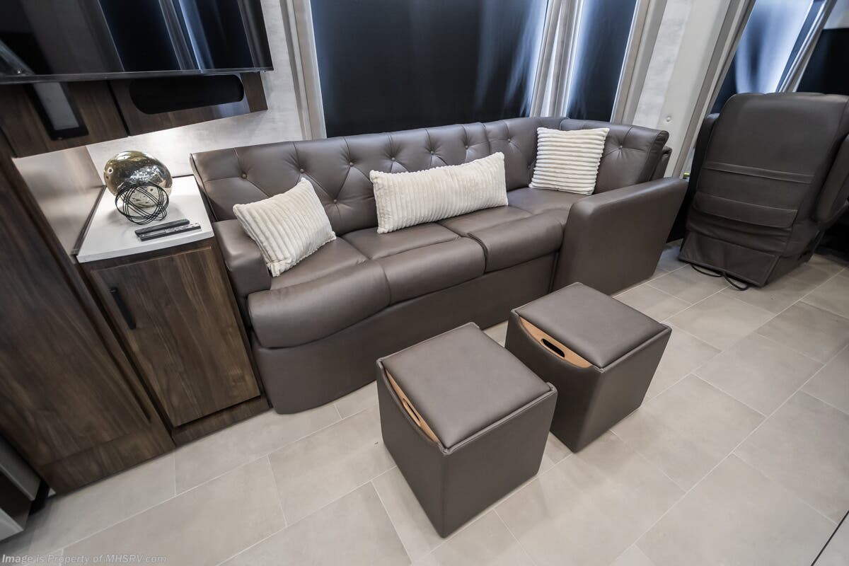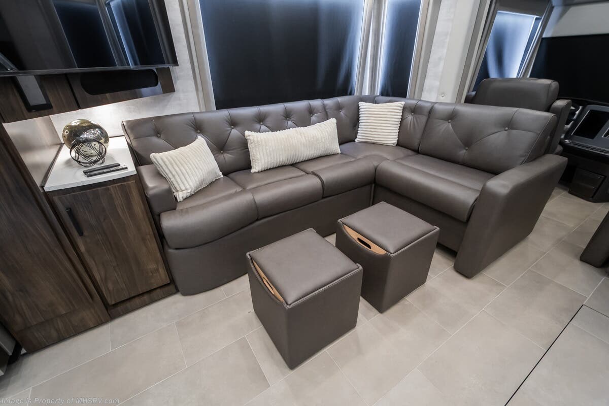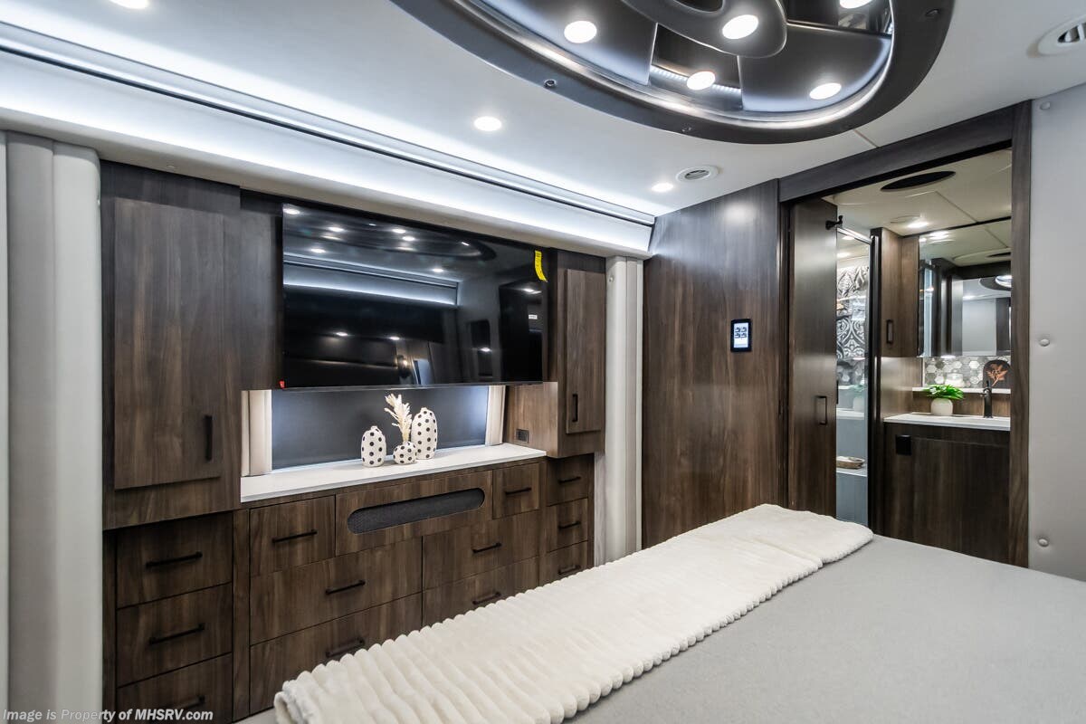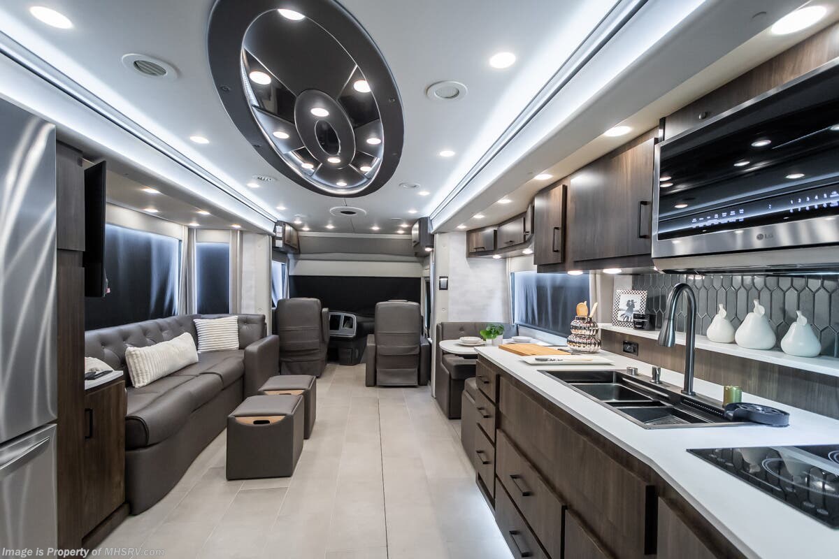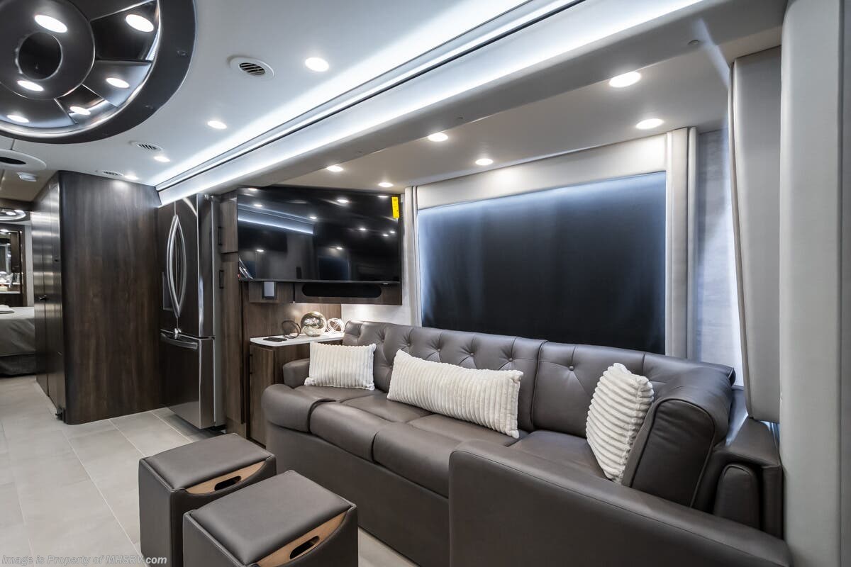 M.S.R.P. $1,428,180. The 2027 Foretravel Realm FL605 is, not only, the premium luxury Motor-Coach on the market today, but the only coach in the industry built on a Freightliner TravelRide IV-SL chassis offering incomparable ride, handling, and safety. This extraordinary motor coach is boasting the extraordinary Apex interior décor. The interior of the coach is paired perfectly with the Ares exterior paint scheme. You will also find a multi-function digital dash and instrumentation display system, the Premier Steer adjustable driver's assist system, a Navigation system with in-dash and additional passenger side monitor, Total Coach Monitoring System, tire pressure sensors, beautiful tile floors and back-splashes, quartz counter tops throughout, ultra-high-end appliances, LED accent lighting throughout, a beautiful curved step entry way, Braun extra heavy duty power entrance step, a designer entry door with LED accent lighting, iPad launch system, 4K TVs where applicable, upgraded cab stereo and sub-woofer, heated and cooled pilot and co-pilot seats, recessed and upgraded ceiling features in the galley, recessed cook top, Mobile Eye Collision Avoidance System, a "Bird's Eye View" camera system for the ultimate in coach visibility along with an additional 3-camera coach monitoring system with power rear camera, dual integrated power awnings, power entry door awning, exterior entertainment center, (2) electric sliding cargo trays, exterior freezer, chrome grill and accent package, (1) 3000W inverter, electric floor heat and (2) solar panels. You will know instantly, once behind the wheel of a Realm FS6, that this chassis is truly a cut above all other luxury motor coach chassis. It is powered by a Cummins X15 605HP diesel. You will also enjoy the ultimate in slide-out room fit and finish. These slides are undoubtedly head and shoulders above the competition. They feature pneumatic seals that provide a literal airtight seal completely around the entire slide-out room regardless of slide position for the premium in fit, finish, and function. For more details contact Motor Home Specialist today. - Realm, by definition, is a royal kingdom; a domain within which anything may occur, prevail or dominate. The Realm of Dreams is here and available exclusively at Motor Home Specialist, the #1 Volume Selling Motor Home Dealership in the World. Visit MHSRV.com or call 800-335-6054 for complete details, photos, videos, brochures, and more. The Foretravel Realm FS6... Your Kingdom Awaits.