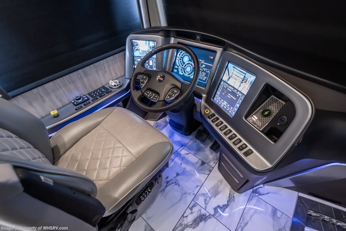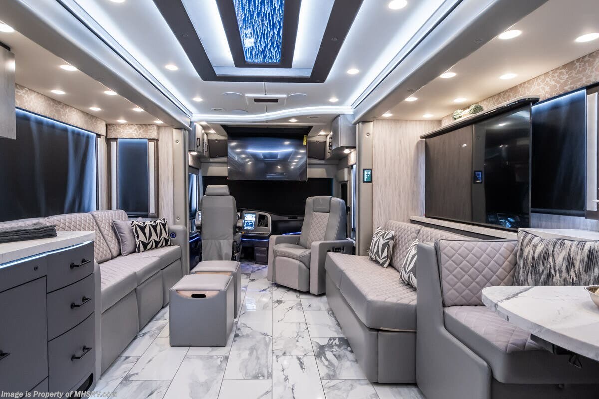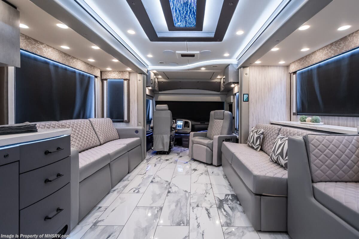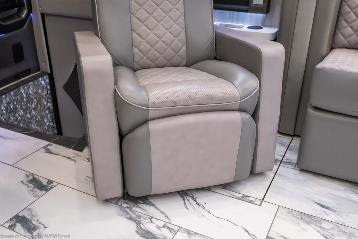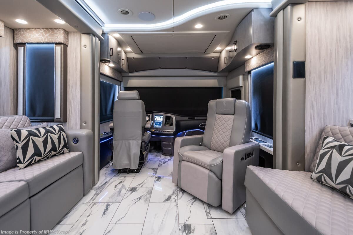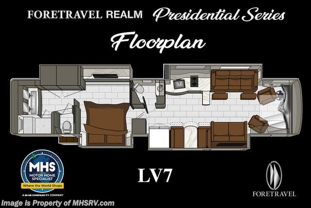 M.S.R.P. $1,823,850 - The 2027 Foretravel Realm Presidential takes the luxury motor coach market to all new heights and further propels the legacy of Foretravel. The Foretravel Realm stands alone as the finest motor coach of its kind available on the market today. It rides on Spartan's Premier K4 chassis, that is exclusive to Foretravel, offering incomparable ride, handling, and safety. This extraordinary motor coach is the Luxury Villa 7 (LV7) floor plan with the incomparable Aristocracy interior décor package that is paired perfectly with the all-new Titan exterior paint scheme that can only be found on the Realm Presidential Series. Shop a huge selection of luxury diesel pusher motorhomes all at 1 location! Choose from American Coach Eagle – Dream – Entegra Coach Cornerstone – Anthem – Aspire – Fleetwood Palisade – Discovery LXE – Holiday Rambler Armada – Foretravel Realm – Foretravel Realm Presidential and more. We also buy and sell quality pre-owned models such Newmar King Aire – Essex – London Aire – Mountain Aire – Dutch Star - Tiffin Zephyr – Allegro Bus – Phaeton – Prevost Liberty Lady – Millennium - Marathon – Newell and much more. Visit MHSRV.com for our complete line-up and the sale prices that have made us the #1 volume selling motor home dealership in the world 12 years in a row! The LV7 is highlighted by a massive power lift living room TV; a stack washer/dryer; a luxurious master bedroom with a Slumber Ease motorized luxury king size mattress and power lift LED TV; and an incredible, residential designed master bath with huge custom tile shower, beautiful sink basins, large pull-out medicine cabinet, private water closet, and large master linen & wardrobe closet. You will also find a true flat floor design throughout the Realm Presidential Series including, not only Foretravel's premium flat floor slide-out rooms but also the bedroom to master bath transition. The Presidential Series also boasts a 600D Aqua Hot Hydronic Heating system. You will find the premier Valid digital dash with VDC control, along with the Valid air ride suspension, electronic suspension control with self-leveling feature, driver and passenger coach monitors, tire pressure sensors, beautiful full tile floors and back-splashes, ultra-high-end quartz counter tops throughout, premium brand refrigerator and convection microwave, LED accent lighting throughout, a beautiful curved entry way step, Executive entrance steps, a designer entry door with LED accent lighting, 4K QLED TVs where applicable, upgraded cab stereo and sub-woofer, heated and cooled leather pilot and co-pilot seats, recessed and upgraded ceiling features in the galley and bedroom, recessed cook top, an 8-camera system including 6 perimeter 360 Delta Mobile cameras for the ultimate in coach visibility, dual integrated power awnings, power entry door awning, exterior entertainment center, (2) electric sliding cargo trays, exterior freezer, full coach and multi-color LED ground effect lighting package, unmistakable full body paint exterior with Armor-Coat sprayed protection below windshield, chrome grill and accent package, (2) 3000 watt inverters, Gold Heat floor tile heating system, solar panel package, dishwasher drawer, 5.1 surround sound in living room and StarLink antenna. The Spartan K4 chassis is not only massive in stature but boasts a best-in-class Independent Front Suspension system, a passive steering rear tag axle for incomparable handling and maneuverability as well as the Performance Choice® anti-roll bar with selectable drive modes, and automatic traction control. You will know instantly, once behind the wheel of a Realm, that this chassis is truly a cut above all other luxury motor coach chassis. It is powered by a Cummins 605HP diesel. You will also find additional advanced safety features on a Realm like a fire suppression system for the engine, Tyron Bead-Lock wheel safety bands, and steel construction rather than aluminum found in the competition. You will also enjoy the ultimate in slide-out room fit and finish. These slides are undoubtedly head and shoulders above the competition. They feature pneumatic seals that provide a literal airtight seal completely around the entire slide-out room regardless of slide position for the premium in fit, finish, and function. They also feature a power drop-down flooring system that gives the Realm not only a flat-floor when extended, but a true flat-floor when retracted as well. (No uneven floor surfaces, damaging rollers, poorly sealed rubber gaskets, etc.) The Realm also features a flat floor bedroom to master bath transition. You won't find that in the competition; Nor will you find a *3-YEAR or 50K MILE SPARTAN NO-COST MAINTENANCE PLAN INCLUDED - (A Realm Exclusive) and a *2-YEAR or 24K MILE LIMITED WARRANTY. For more details contact Motor Home Specialist today. REALM, by definition, is a royal kingdom; a domain within which anything may occur, prevail, or dominate. The Realm of Dreams is here and available at Motor Home Specialist, the #1 Volume Selling Motor Home Dealership in the World. Visit MHSRV.com or call 800-335-6054 for complete details, photos, videos, brochures, and more. The Foretravel Realm Presidential Series... Your Kingdom Awaits.