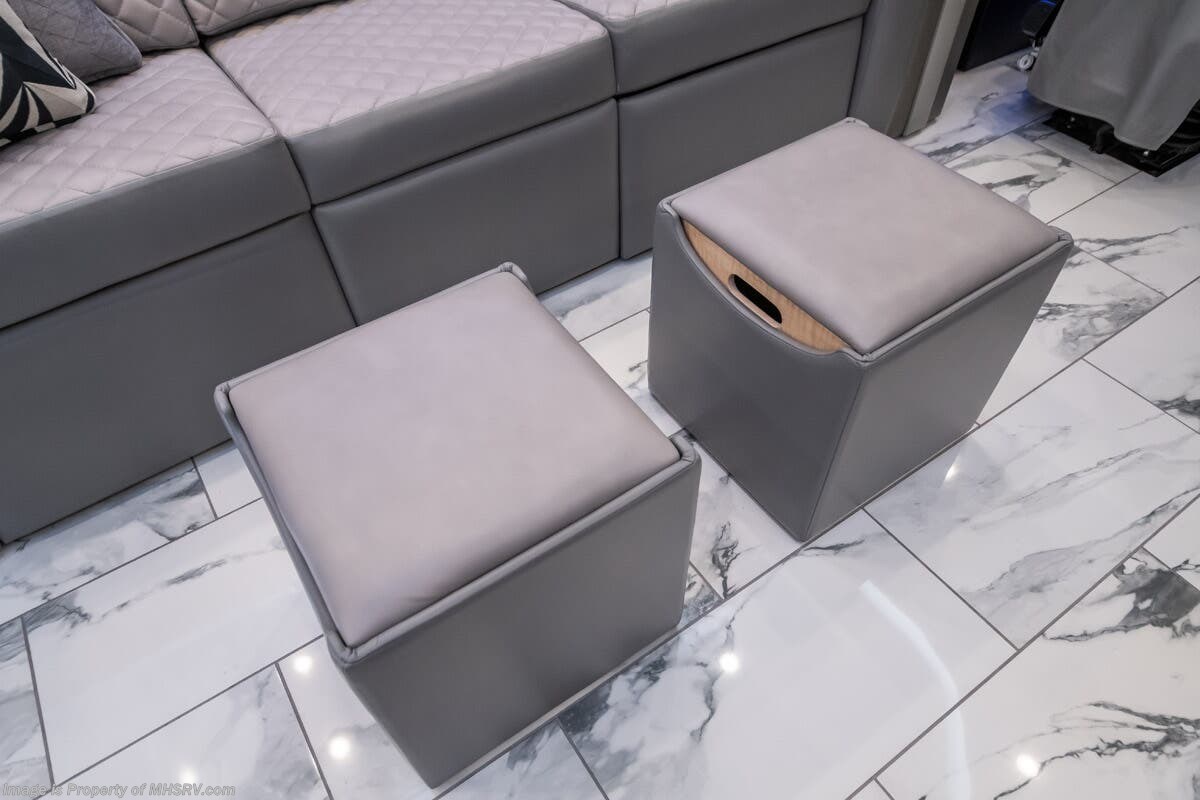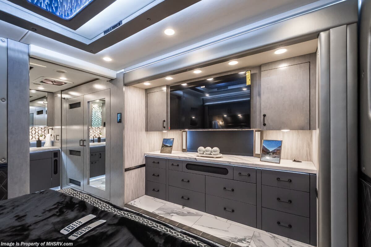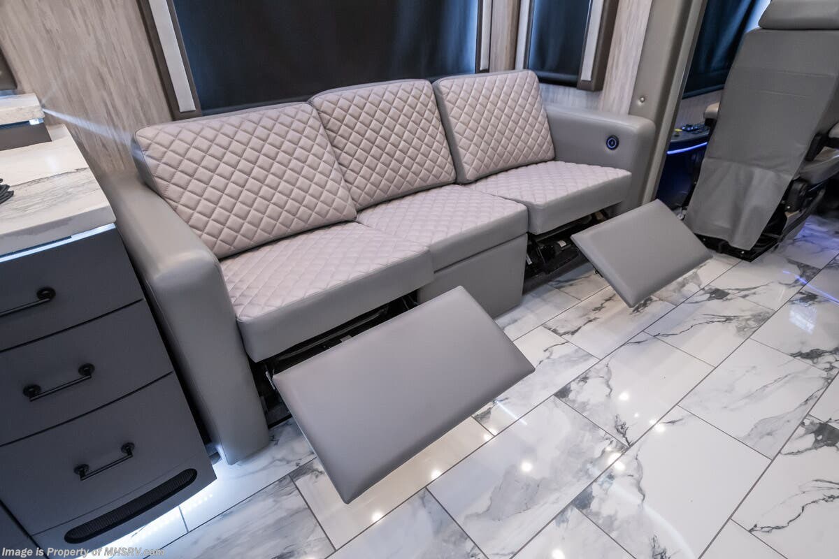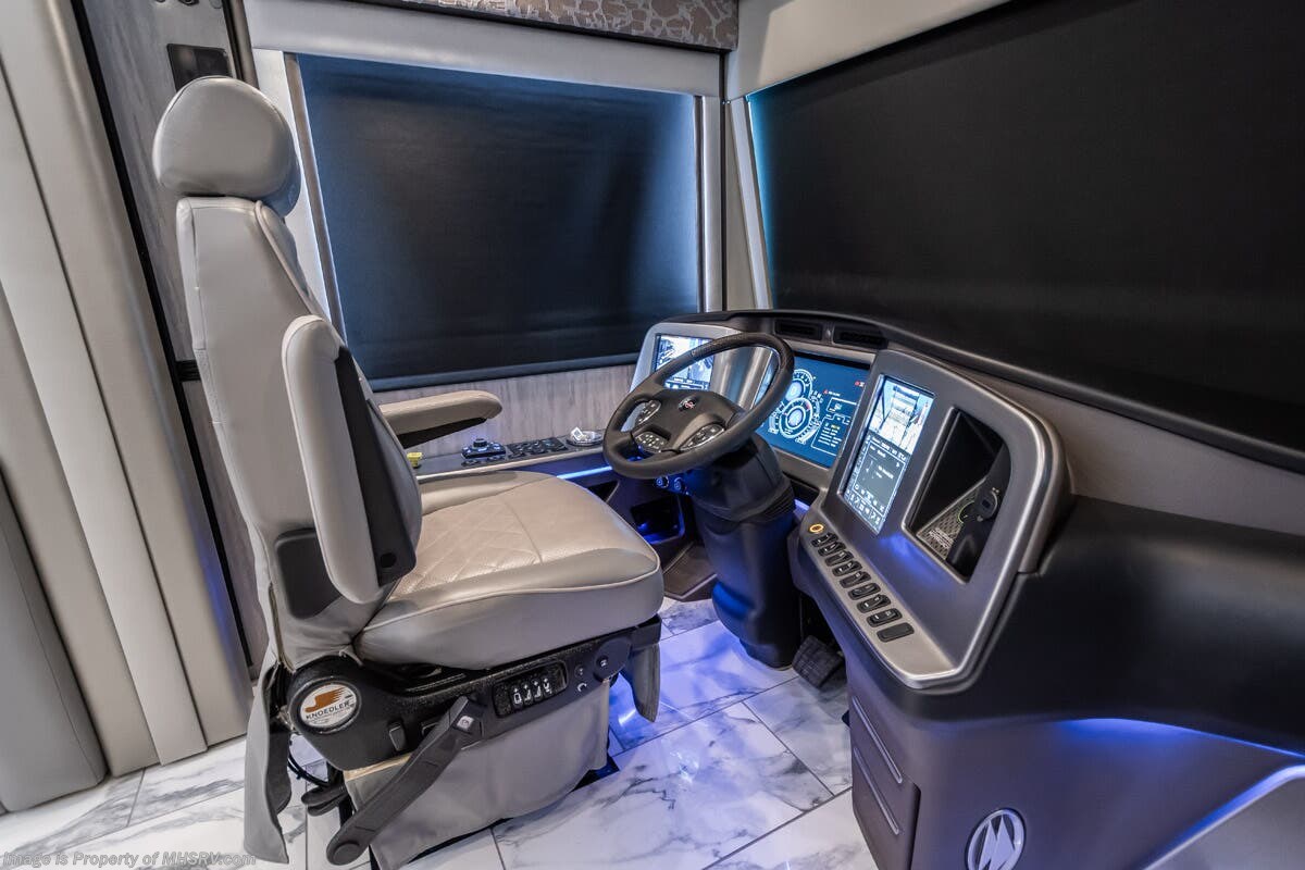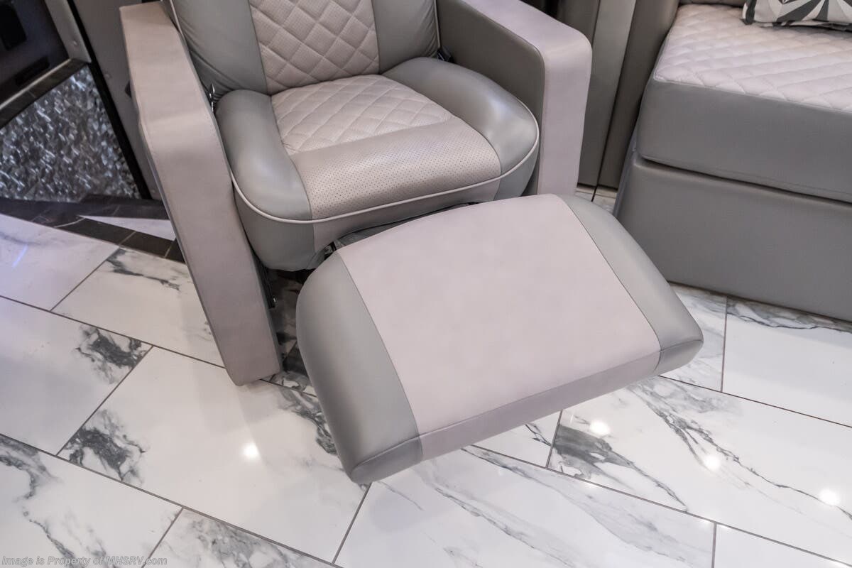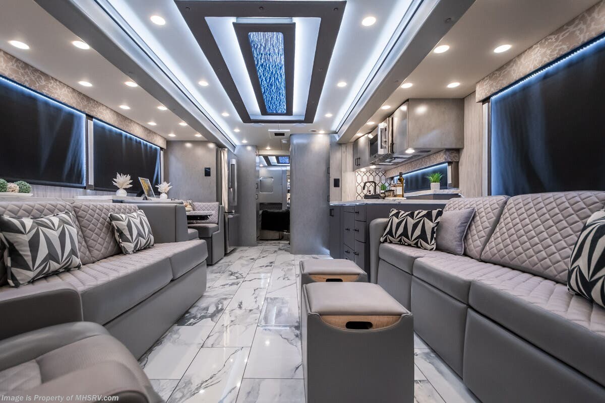 M.S.R.P. $1,823,850 - The 2027 Foretravel Realm Presidential takes the luxury motor coach market to all new heights and further propels the legacy of Foretravel. The Foretravel Realm stands alone as the finest motor coach of its kind available on the market today. It rides on Spartan's Premier K4 chassis, that is exclusive to Foretravel, offering incomparable ride, handling, and safety. This extraordinary motor coach is the Luxury Villa 7 (LV7) floor plan with the incomparable Aristocracy interior décor package that is paired perfectly with the all-new Titan exterior paint scheme that can only be found on the Realm Presidential Series. Shop a huge selection of luxury diesel pusher motorhomes all at 1 location! Choose from American Coach Eagle – Dream – Entegra Coach Cornerstone – Anthem – Aspire – Fleetwood Palisade – Discovery LXE – Holiday Rambler Armada – Foretravel Realm – Foretravel Realm Presidential and more. We also buy and sell quality pre-owned models such Newmar King Aire – Essex – London Aire – Mountain Aire – Dutch Star - Tiffin Zephyr – Allegro Bus – Phaeton – Prevost Liberty Lady – Millennium - Marathon – Newell and much more. Visit MHSRV.com for our complete line-up and the sale prices that have made us the #1 volume selling motor home dealership in the world 12 years in a row! The LV7 is highlighted by a massive power lift living room TV; a stack washer/dryer; a luxurious master bedroom with a Slumber Ease motorized luxury king size mattress and power lift LED TV; and an incredible, residential designed master bath with huge custom tile shower, beautiful sink basins, large pull-out medicine cabinet, private water closet, and large master linen & wardrobe closet. You will also find a true flat floor design throughout the Realm Presidential Series including, not only Foretravel's premium flat floor slide-out rooms but also the bedroom to master bath transition. The Presidential Series also boasts a 600D Aqua Hot Hydronic Heating system. You will find the premier Valid digital dash with VDC control, along with the Valid air ride suspension, electronic suspension control with self-leveling feature, driver and passenger coach monitors, tire pressure sensors, beautiful full tile floors and back-splashes, ultra-high-end quartz counter tops throughout, premium brand refrigerator and convection microwave, LED accent lighting throughout, a beautiful curved entry way step, Executive entrance steps, a designer entry door with LED accent lighting, 4K QLED TVs where applicable, upgraded cab stereo and sub-woofer, heated and cooled leather pilot and co-pilot seats, recessed and upgraded ceiling features in the galley and bedroom, recessed cook top, an 8-camera system including 6 perimeter 360 Delta Mobile cameras for the ultimate in coach visibility, dual integrated power awnings, power entry door awning, exterior entertainment center, (2) electric sliding cargo trays, exterior freezer, full coach and multi-color LED ground effect lighting package, unmistakable full body paint exterior with Armor-Coat sprayed protection below windshield, chrome grill and accent package, (2) 3000 watt inverters, Gold Heat floor tile heating system, solar panel package, dishwasher drawer, 5.1 surround sound in living room and StarLink antenna. The Spartan K4 chassis is not only massive in stature but boasts a best-in-class Independent Front Suspension system, a passive steering rear tag axle for incomparable handling and maneuverability as well as the Performance Choice® anti-roll bar with selectable drive modes, and automatic traction control. You will know instantly, once behind the wheel of a Realm, that this chassis is truly a cut above all other luxury motor coach chassis. It is powered by a Cummins 605HP diesel. You will also find additional advanced safety features on a Realm like a fire suppression system for the engine, Tyron Bead-Lock wheel safety bands, and steel construction rather than aluminum found in the competition. You will also enjoy the ultimate in slide-out room fit and finish. These slides are undoubtedly head and shoulders above the competition. They feature pneumatic seals that provide a literal airtight seal completely around the entire slide-out room regardless of slide position for the premium in fit, finish, and function. They also feature a power drop-down flooring system that gives the Realm not only a flat-floor when extended, but a true flat-floor when retracted as well. (No uneven floor surfaces, damaging rollers, poorly sealed rubber gaskets, etc.) The Realm also features a flat floor bedroom to master bath transition. You won't find that in the competition; Nor will you find a *3-YEAR or 50K MILE SPARTAN NO-COST MAINTENANCE PLAN INCLUDED - (A Realm Exclusive) and a *2-YEAR or 24K MILE LIMITED WARRANTY. For more details contact Motor Home Specialist today. REALM, by definition, is a royal kingdom; a domain within which anything may occur, prevail, or dominate. The Realm of Dreams is here and available at Motor Home Specialist, the #1 Volume Selling Motor Home Dealership in the World. Visit MHSRV.com or call 800-335-6054 for complete details, photos, videos, brochures, and more. The Foretravel Realm Presidential Series... Your Kingdom Awaits.